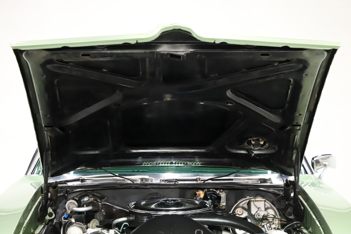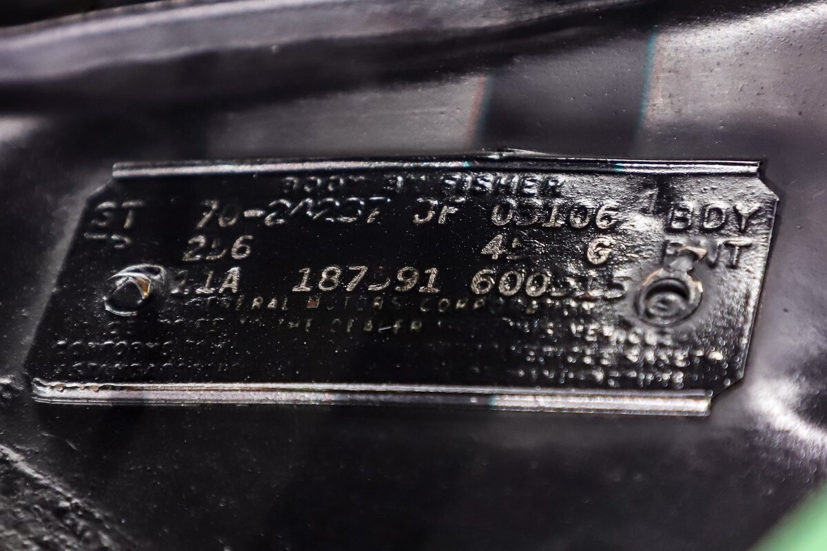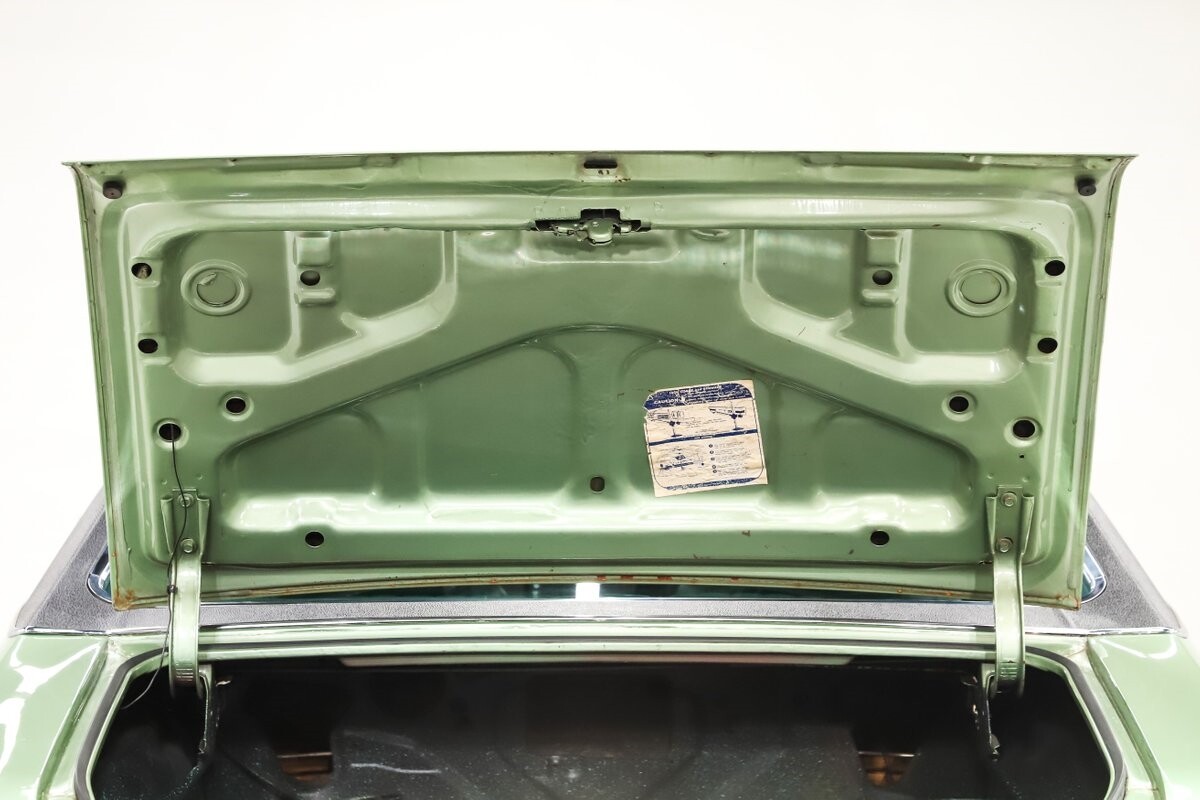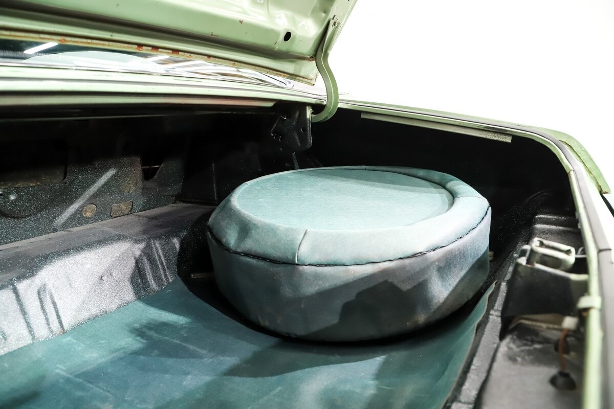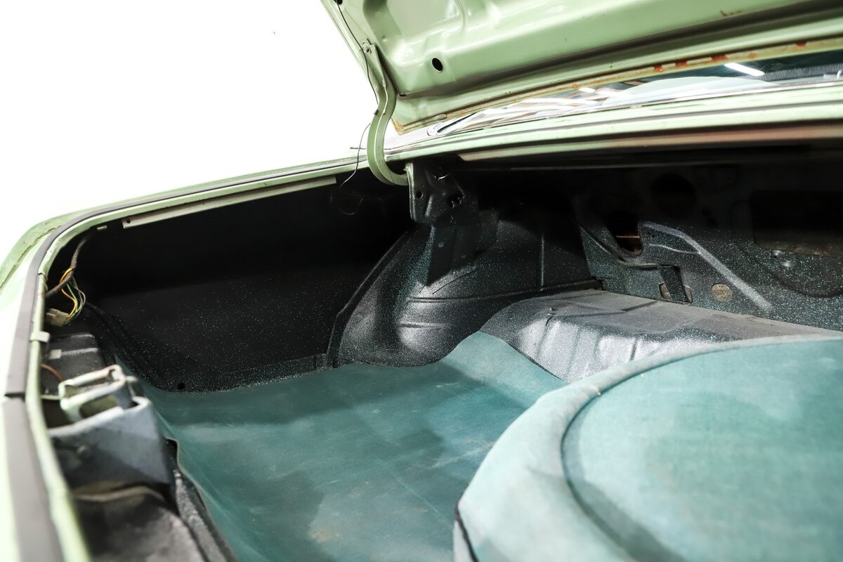 TRUNK COMPARTMENT: 100% original metal; no cuts or splices. Under the trunk lid and the jamb still have the original green paint and the original jacking instructions decal is still in place! The trunk mat and tire cover were replaced. It does have complete jack and spare assembly.