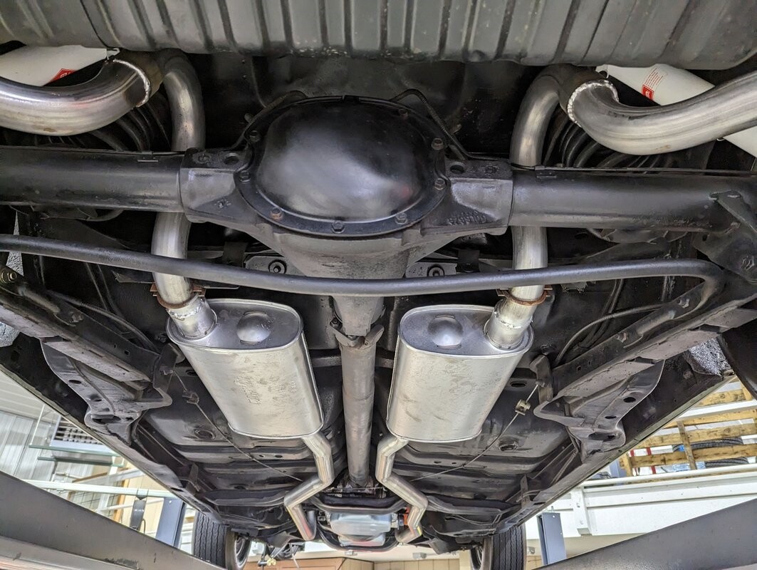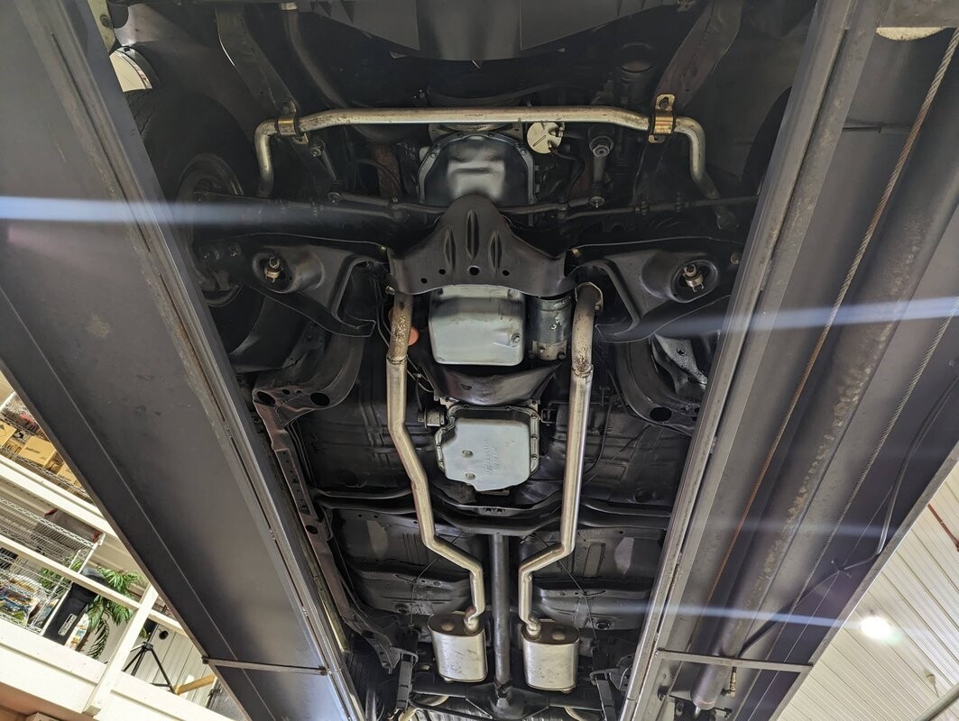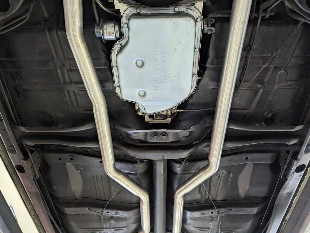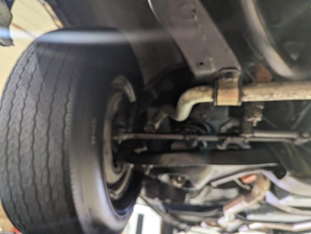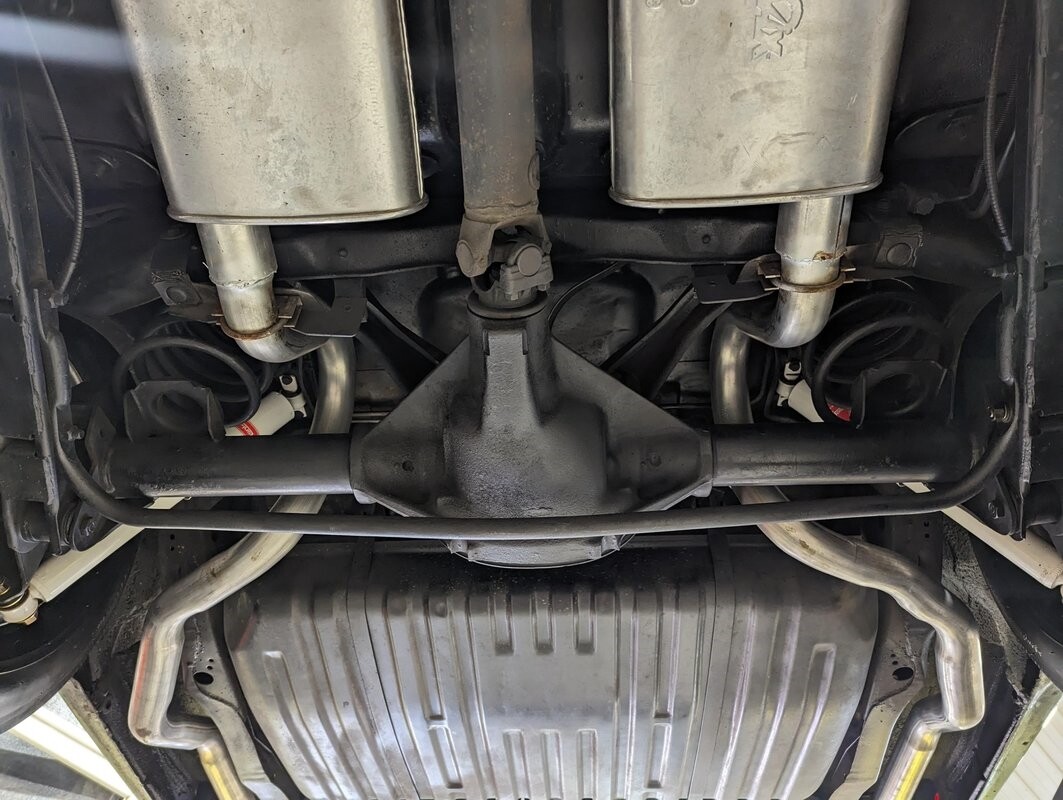 UNDERSIDE: It looks like all the steering and suspension components were apart and rebuilt. It has the F-41 which means front and rear sway bars and boxed rear control arms. It's also upgraded with KYB gas shocks. Correct dual exhaust system including the chrome quad tips. It has disc in front, drum in back. E-brake cables are hooked up. Looking up at the motor it's very clean. Original Turbo 400 automatic is clean, it still has the 1970 tag riveted to it. Original rear end with 3.23 gears. The metal under this car is very impressive, all original and dry floors, rockers, and braces. It was cleaned and painted black.