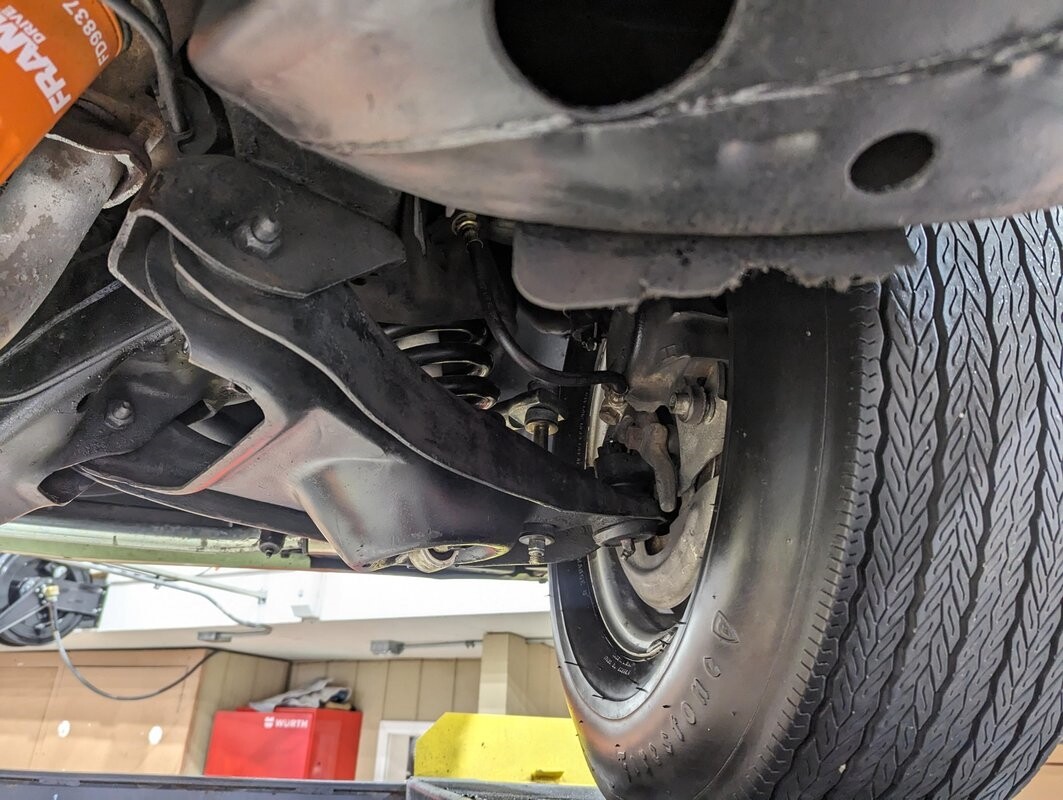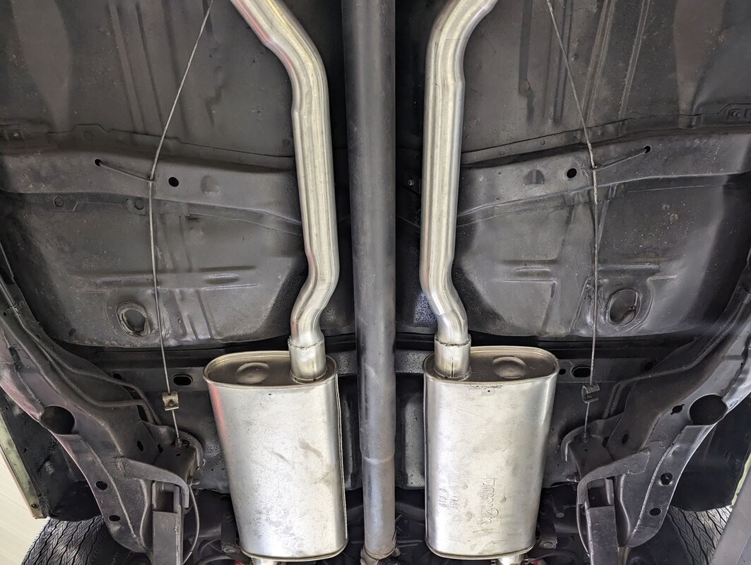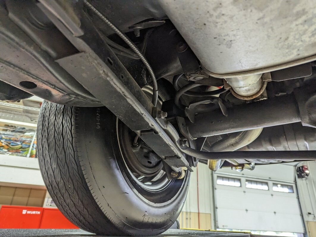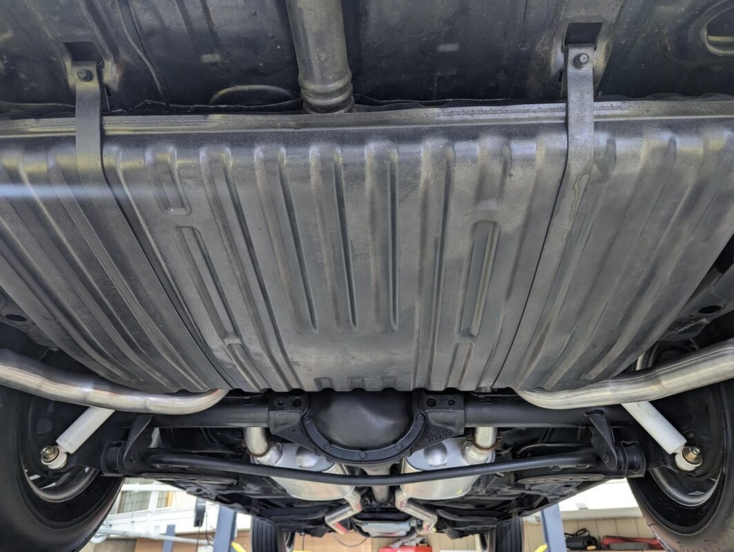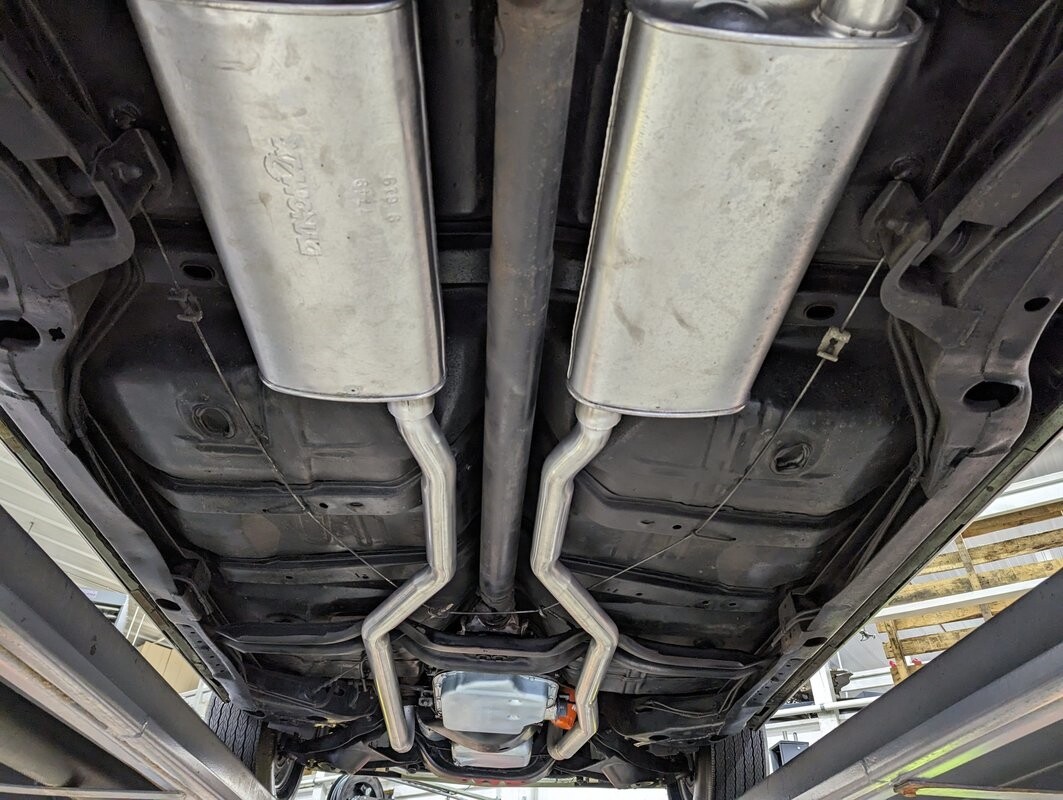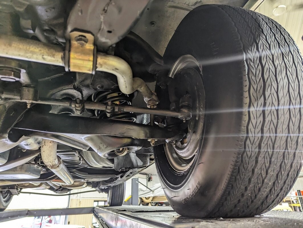UNDERSIDE: It looks like all the steering and suspension components were apart and rebuilt. It has the F-41 which means front and rear sway bars and boxed rear control arms. It's also upgraded with KYB gas shocks. Correct dual exhaust system including the chrome quad tips. It has disc in front, drum in back. E-brake cables are hooked up. Looking up at the motor it's very clean. Original Turbo 400 automatic is clean, it still has the 1970 tag riveted to it. Original rear end with 3.23 gears. The metal under this car is very impressive, all original and dry floors, rockers, and braces. It was cleaned and painted black.