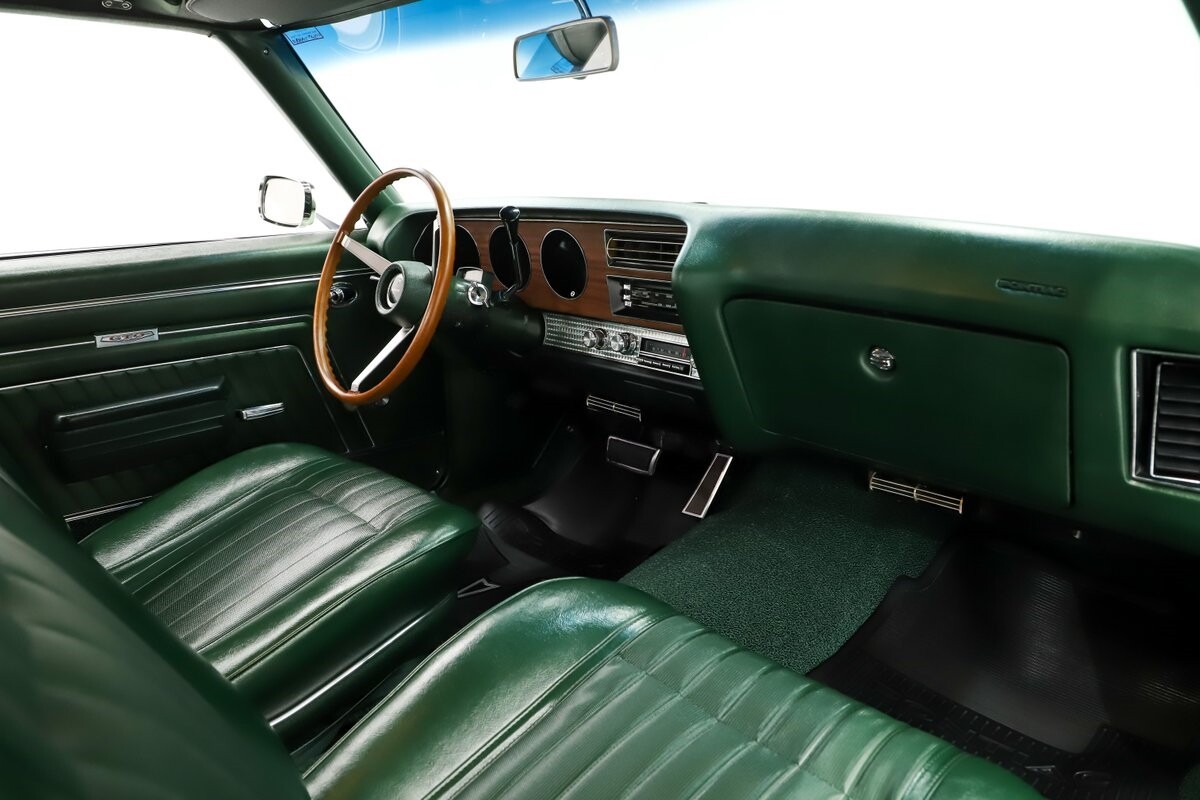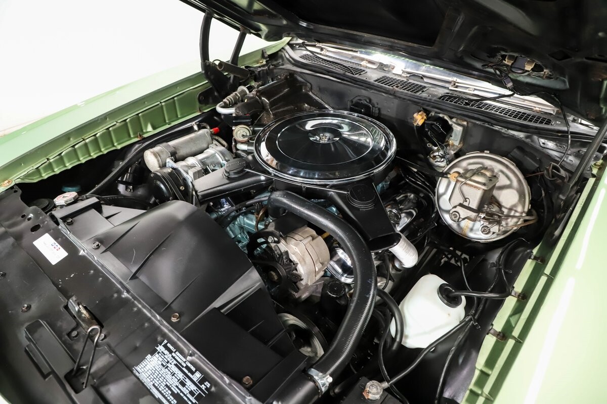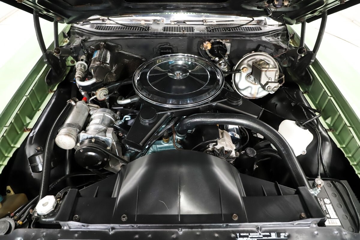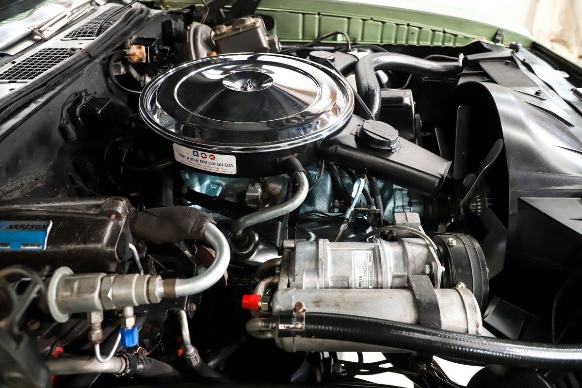 ENGINE COMPARTMENT: Numbers matching 400-350 hp engine with all the correct components: manifolds, valve covers, complete air cleaner system with the heat riser too. Everything looks tidy and proper. Correct hose clamps, spring clamp battery cables, the squirters are hooked up. It features factory air conditioning updated a newer compressor and R134 freon. It also has power steering and brakes.