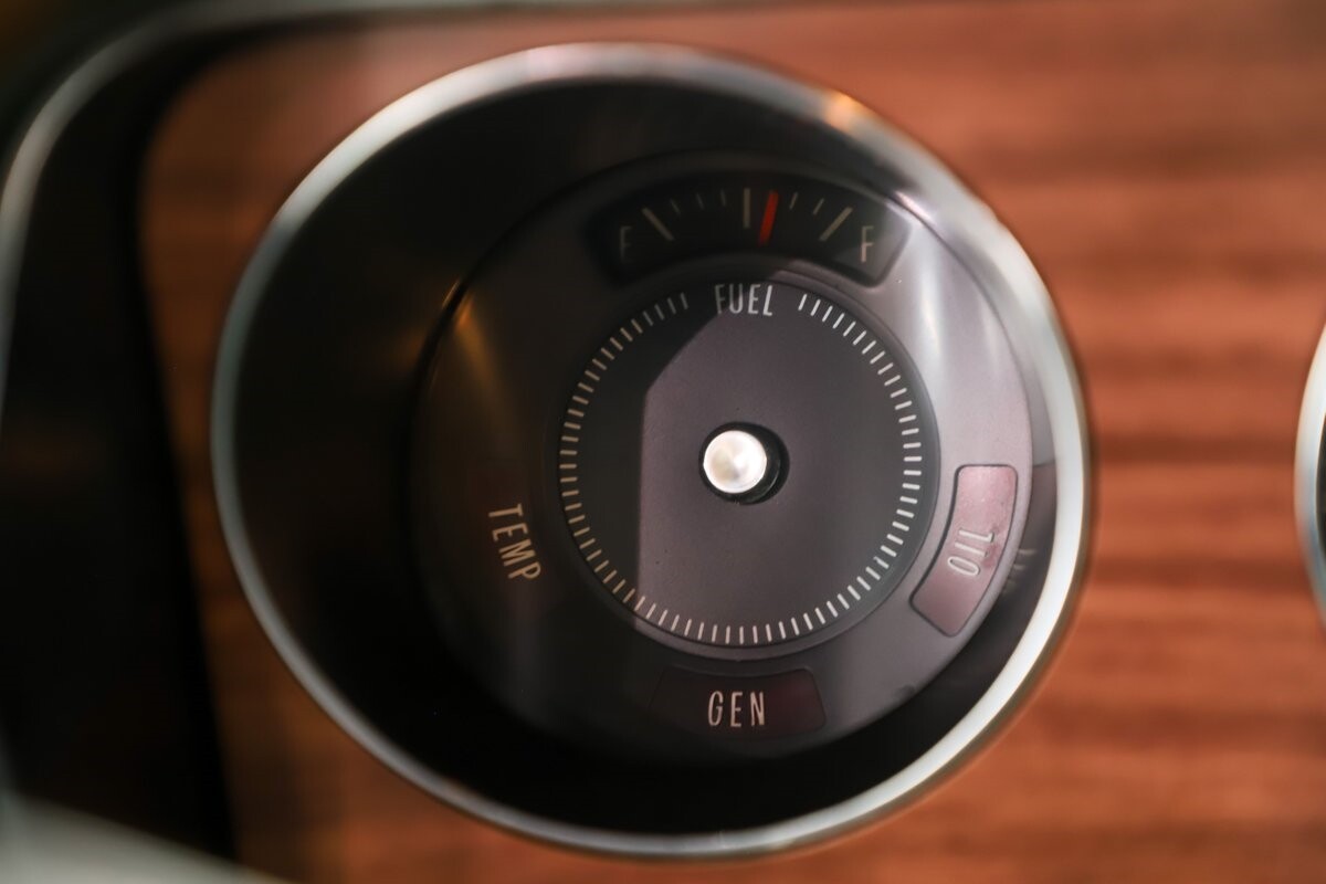 INTERIOR: The interior is in outstanding condition. Down on the floor the carpet looks fresh and there's a set of reproduction mats. Complete set of original seat belts are in excellent shape. The seats have great upholstery, the headrests, plastic and chrome trim is excellent too. Side panels, armrests all look fantastic. The headliner and matching visors were replaced. In front of me is a detailed dash: the dash pad, instrument panel, heater controls, deluxe wheel are beautiful. The correct AM/FM radio works.