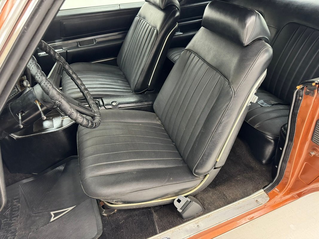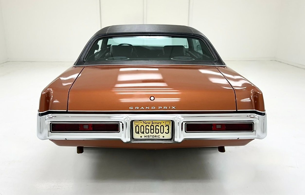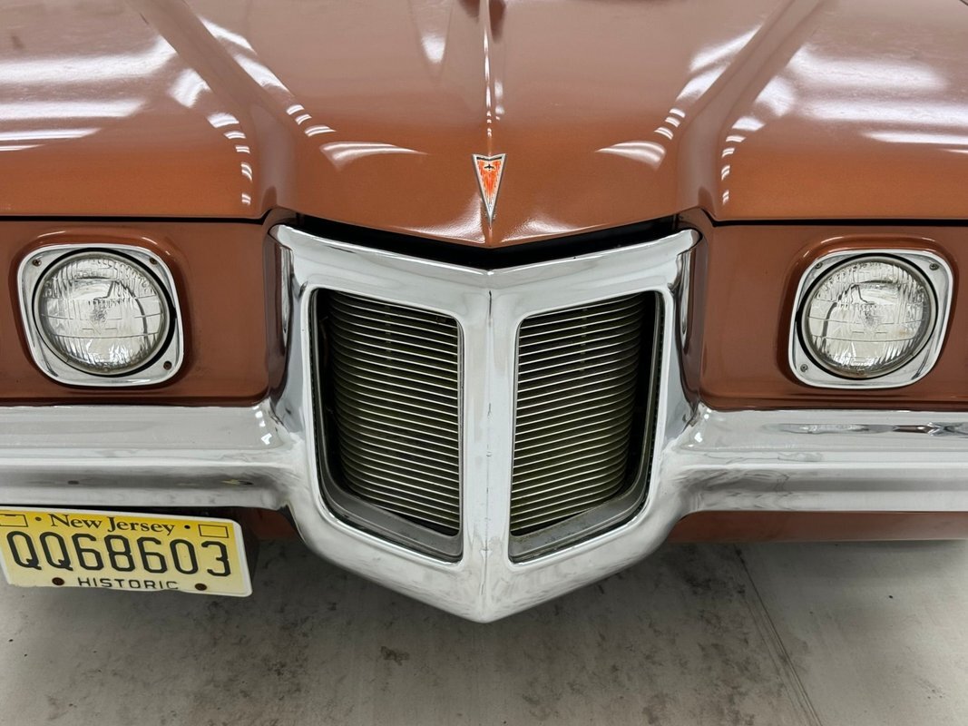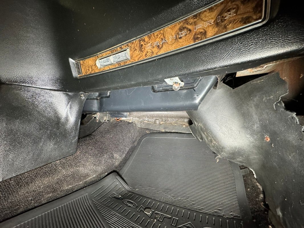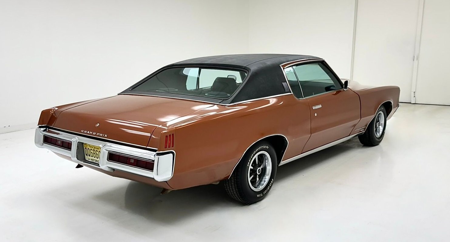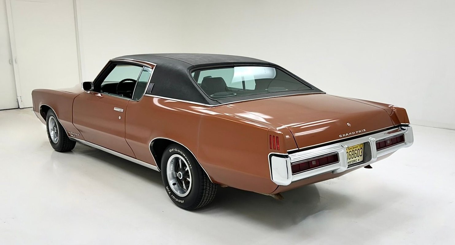 We're greeted by the striking chrome grille, coming to a point Pontiac-style, flanked by a substantial chrome bumper that conforms to the shape of the car. And what a shape! A long, tapered hood flows to a roof that dips fastback-style to the short trunk and abrupt rear end. Castilian Bronze Metallic blankets the car offset by the black vinyl roof and rear pillars. The rear bumper is low slung and straight and houses the simple, horizontal tail lights. Below that, two conventional tailpipes peak out. A few notable design features are here; the front marker lights are sharply angular meaning they can be seen from the side or front. The "Grand Prix" emblem is low on the front fenders and includes the trim package designation. The door handles are low profile before low profile was a thing. Five metal bars appear on the vinyl-covered pillar...why? Because...bold design choice that just works. Four headlights in individual bezels that don't connect. Rally II wheels that are 14-inches dress the corners for an extra touch of class. Finally, we note two areas near the bottom of the car showing some small rust bubbles, some scuffs on the chrome bumper, and one other paint touch up. Minor stuff for a car of this vintage.