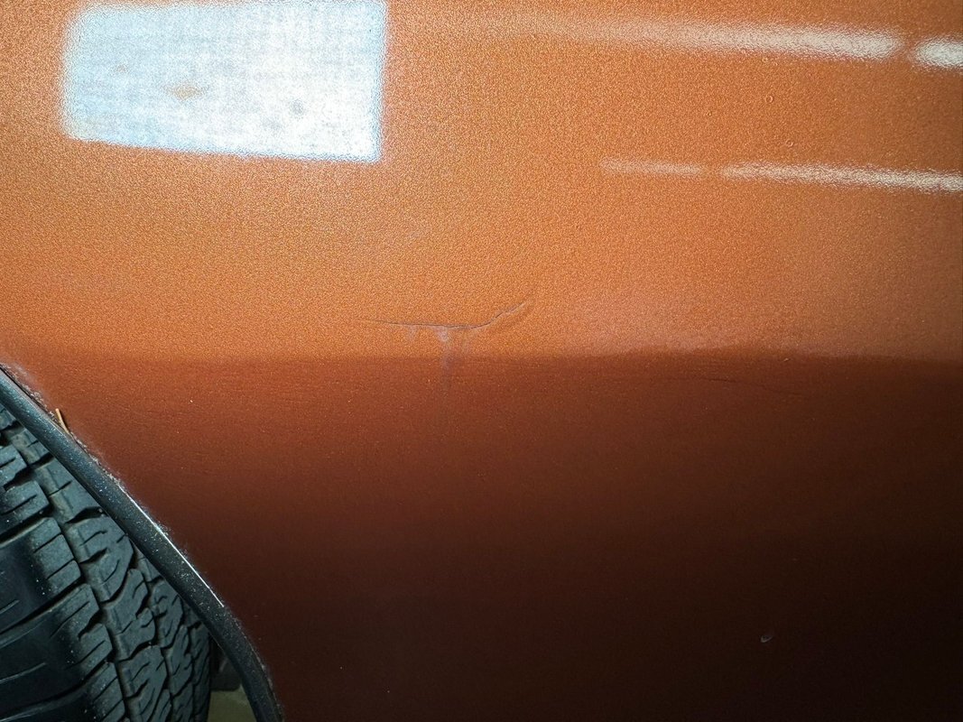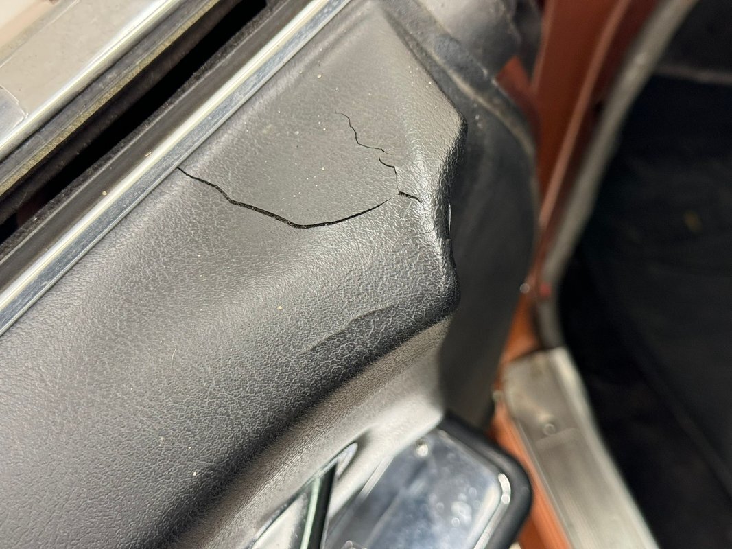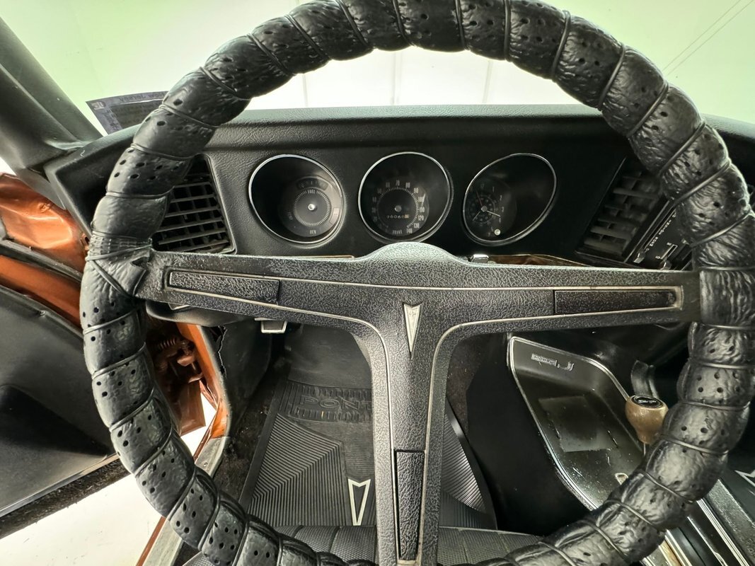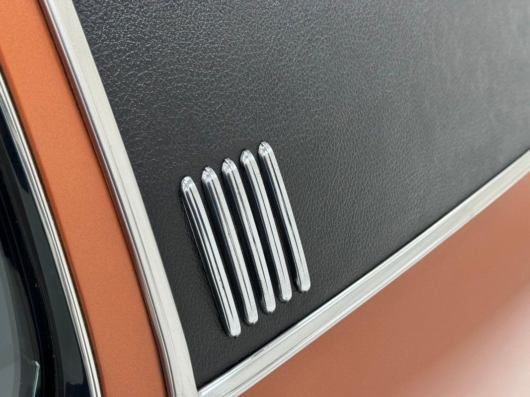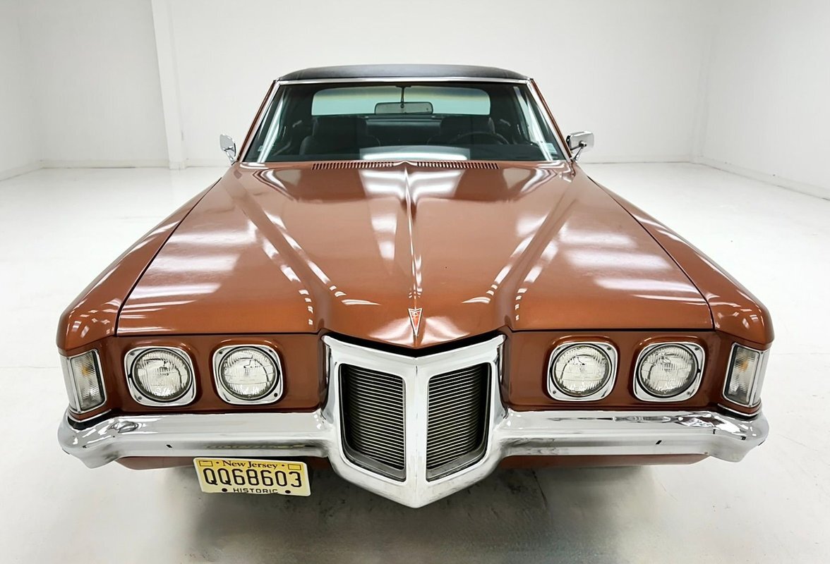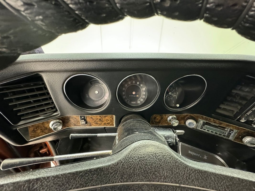 We're greeted by the striking chrome grille, coming to a point Pontiac-style, flanked by a substantial chrome bumper that conforms to the shape of the car. And what a shape! A long, tapered hood flows to a roof that dips fastback-style to the short trunk and abrupt rear end. Castilian Bronze Metallic blankets the car offset by the black vinyl roof and rear pillars. The rear bumper is low slung and straight and houses the simple, horizontal tail lights. Below that, two conventional tailpipes peak out. A few notable design features are here; the front marker lights are sharply angular meaning they can be seen from the side or front. The "Grand Prix" emblem is low on the front fenders and includes the trim package designation. The door handles are low profile before low profile was a thing. Five metal bars appear on the vinyl-covered pillar...why? Because...bold design choice that just works. Four headlights in individual bezels that don't connect. Rally II wheels that are 14-inches dress the corners for an extra touch of class. Finally, we note two areas near the bottom of the car showing some small rust bubbles, some scuffs on the chrome bumper, and one other paint touch up. Minor stuff for a car of this vintage.