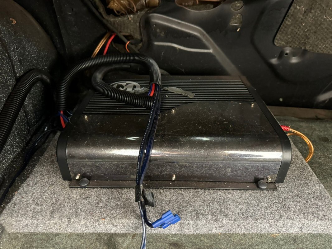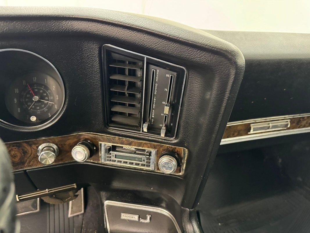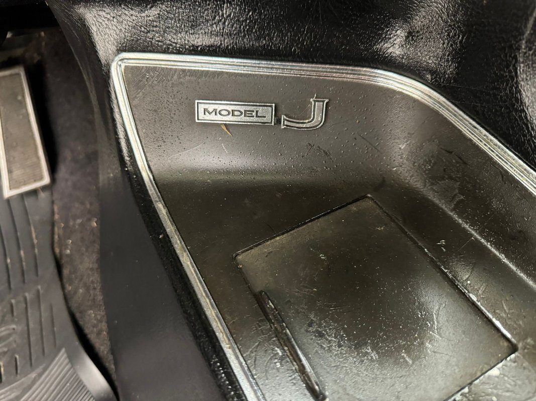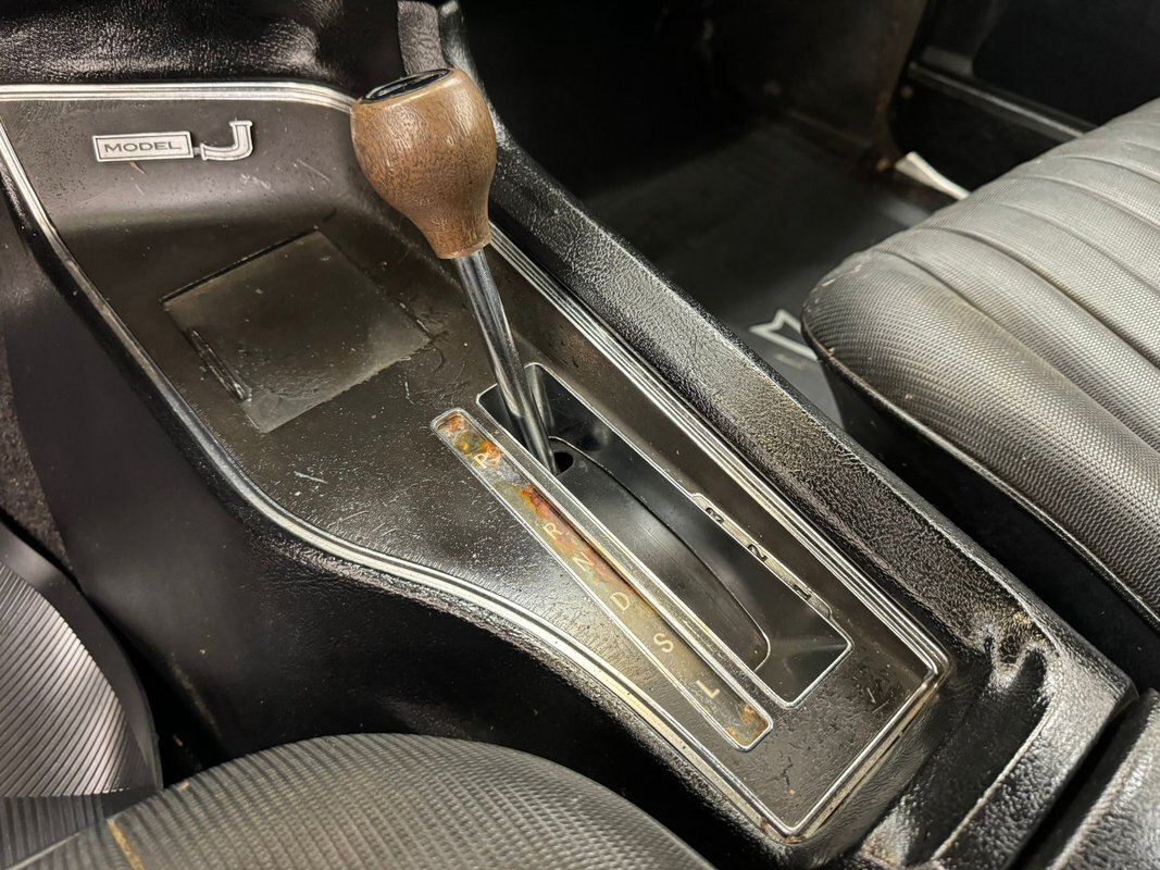 Black vinyl door cards house electric window controls, (driver's side), mirror adjustment rod, and armrest with built-in pull handle. The driver's door shows some cracking vinyl on the horizontal edge where it meets the A-pillar. Moving on to the bucket seats which also wears black vinyl and contoured headrests. The bank bench is belted for three more occupants who have ashtrays and window controls within reach. The automatic shifter has a wood knob and resides in the center console which is canted towards the driver for a sporty feel and is accompanied by a storage bin. Some patina on the shift indicator and surrounding plastic but nothing major. And if you forget the trim package you chose, a Model J emblem is mounted on the center console. The stock Pontiac steering wheel has a tilt feature and frames the triple round gauges in the dash, which is encased in a padded, black vinyl frame. Wood applique on the canted dashboard lends itself to the "luxury" slant promoted by Pontiac. An upgraded "vintage" radio is present along with upgraded speakers on the rear deck and an amplifier mounted in the otherwise original-looking trunk with a full-sized spare tire. The headliner has some hints of sag but is in nice shape and is where the shoulder belts are clipped.