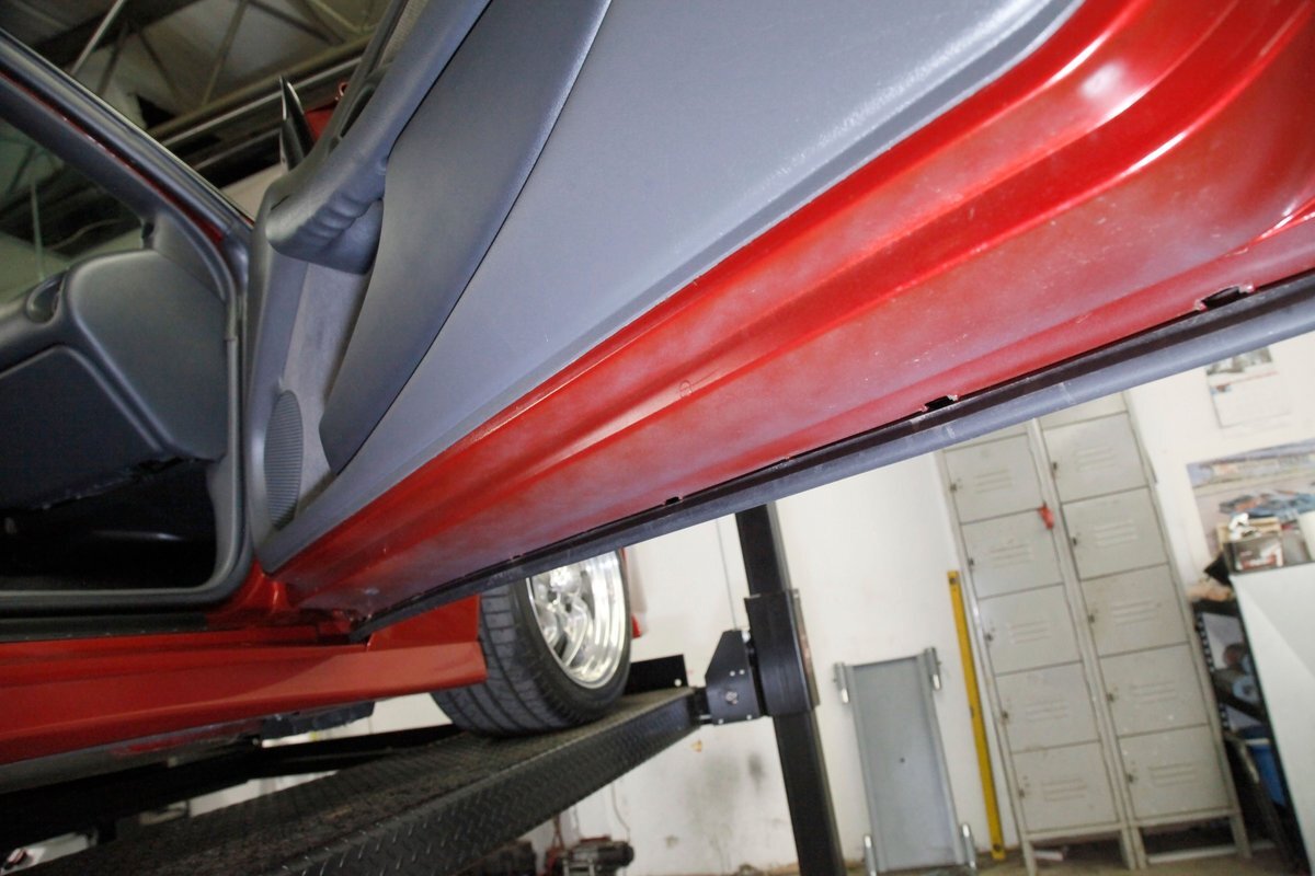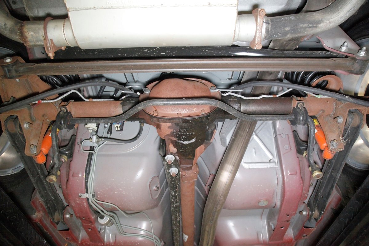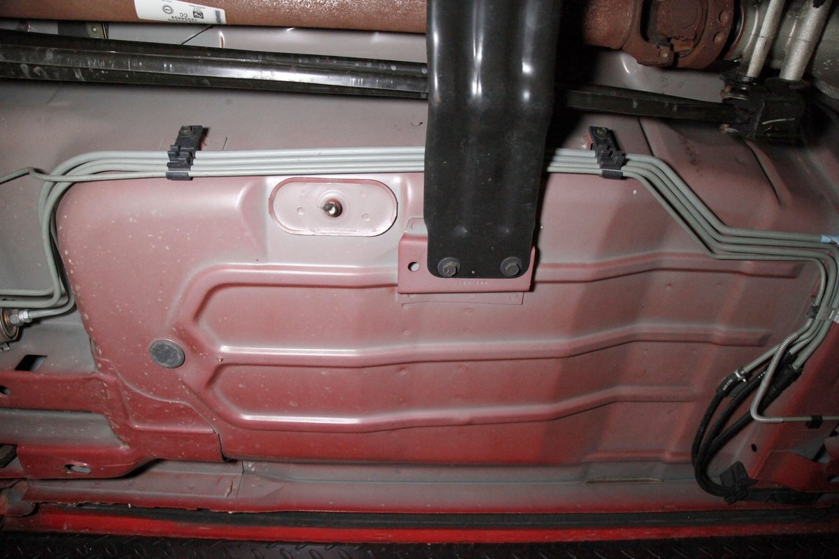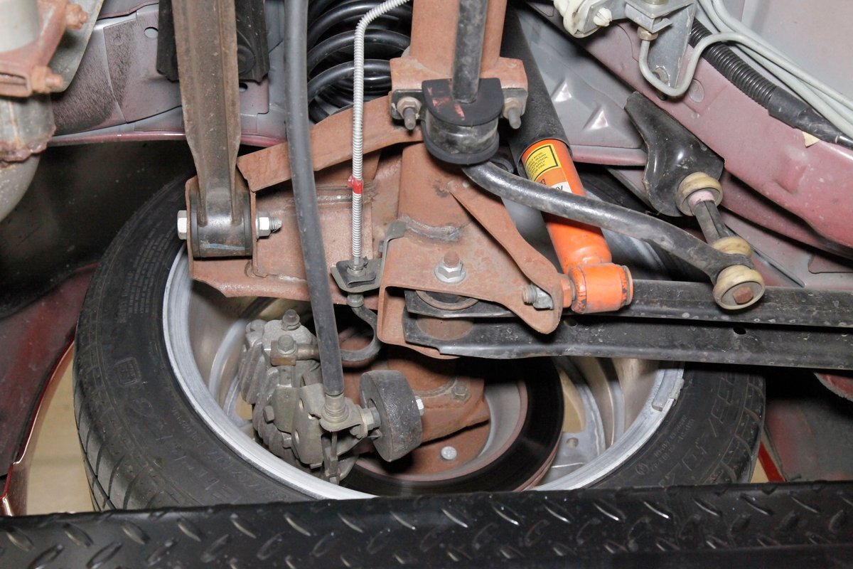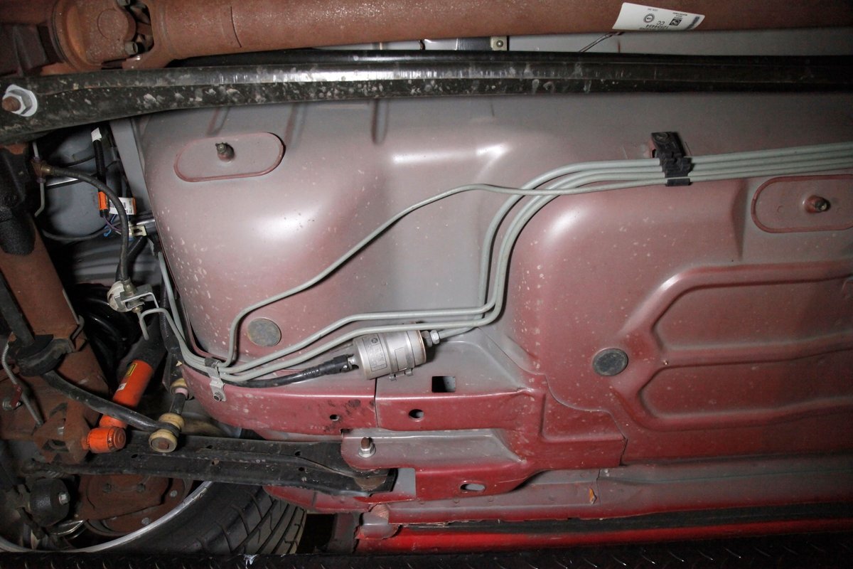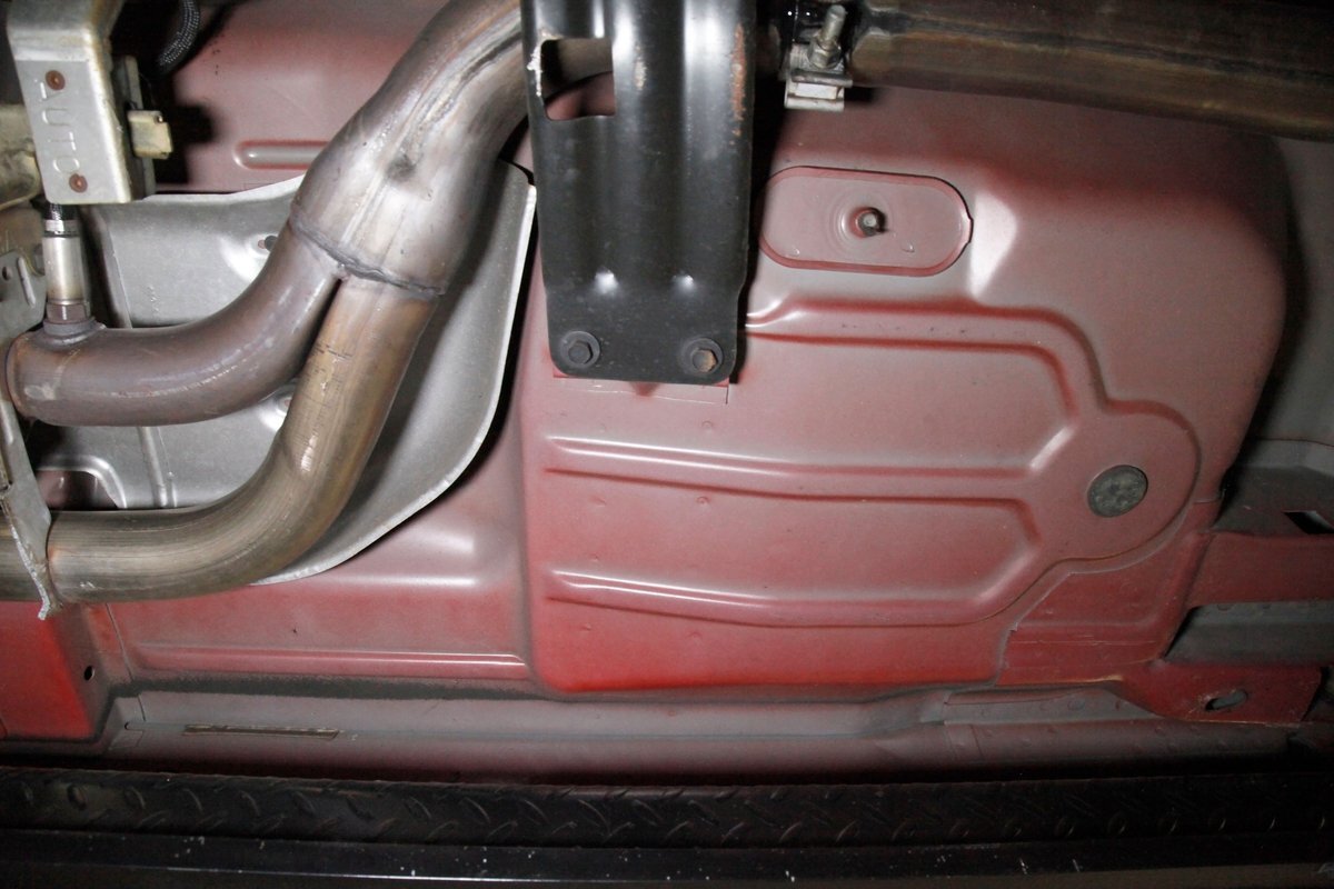 Some light surface rust on the usual suspects, but floor pans and rockers as well as most of the underside is a nice original painted steel with a dusting of the factory Cayenne Red showing. Independent coil spring suspension for the front, and torque arm with coil springs for the rear. Eibach lowering springs have been added to give the car a more sinister ride height. Power disc brakes are all around and single exhaust feeds to a Flowmaster muffler with dual outlet tailpipes.