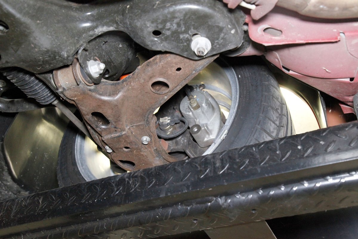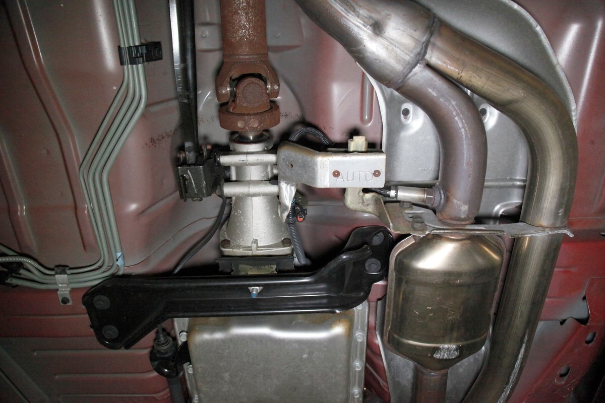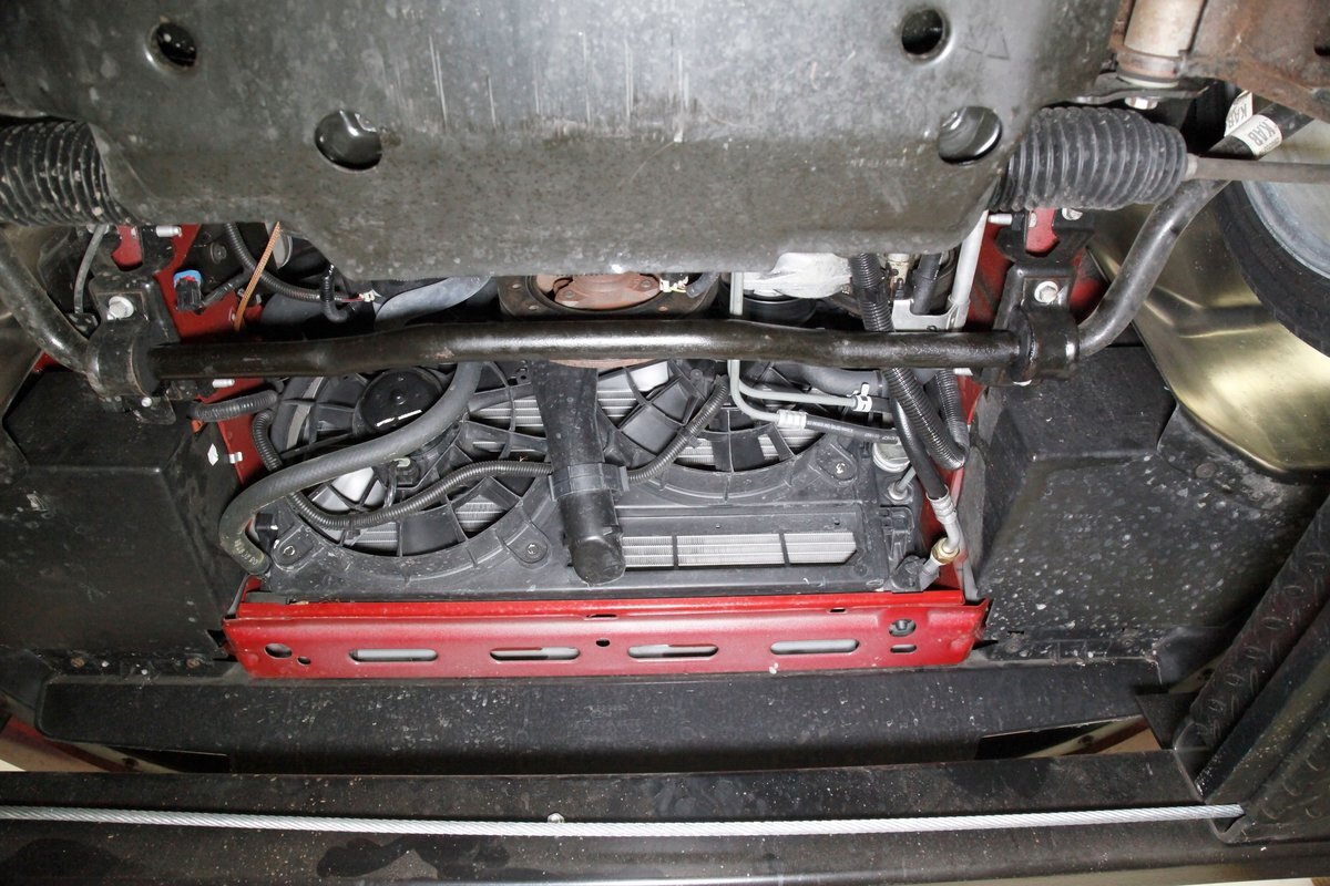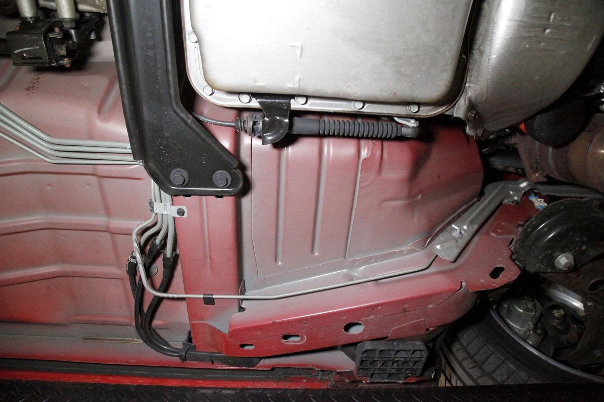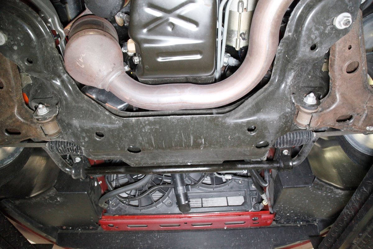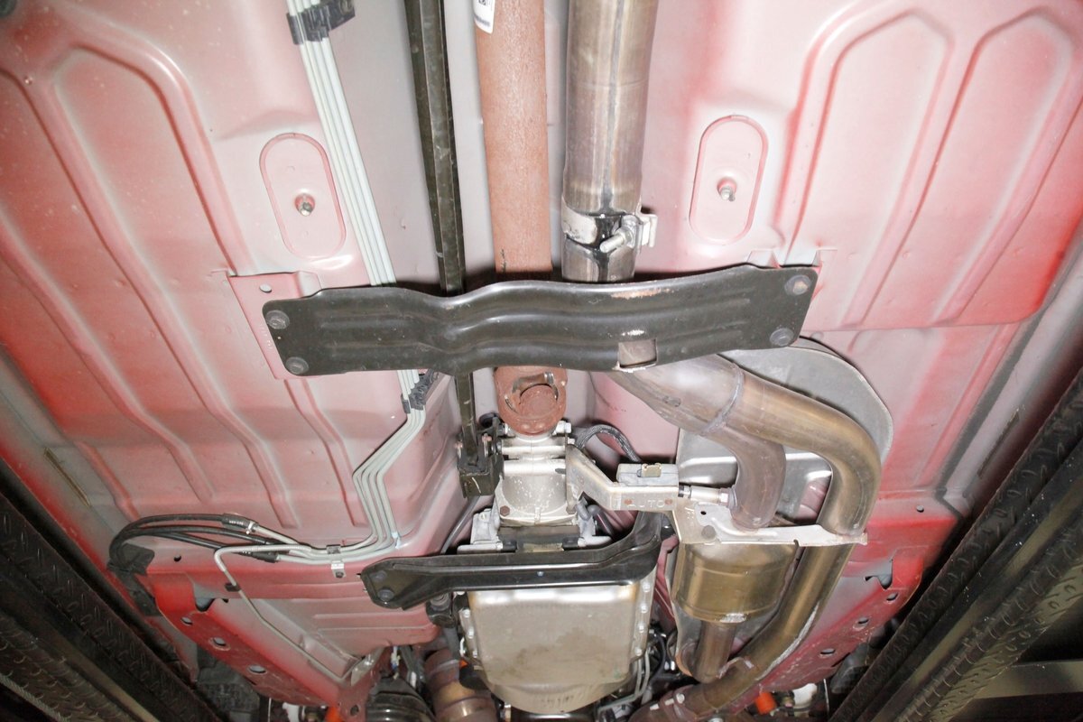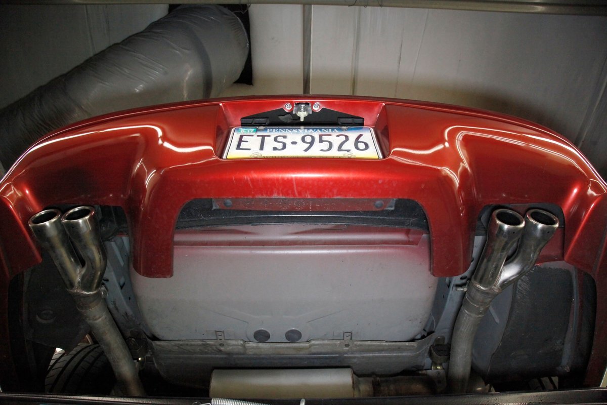 Some light surface rust on the usual suspects, but floor pans and rockers as well as most of the underside is a nice original painted steel with a dusting of the factory Cayenne Red showing. Independent coil spring suspension for the front, and torque arm with coil springs for the rear. Eibach lowering springs have been added to give the car a more sinister ride height. Power disc brakes are all around and single exhaust feeds to a Flowmaster muffler with dual outlet tailpipes.