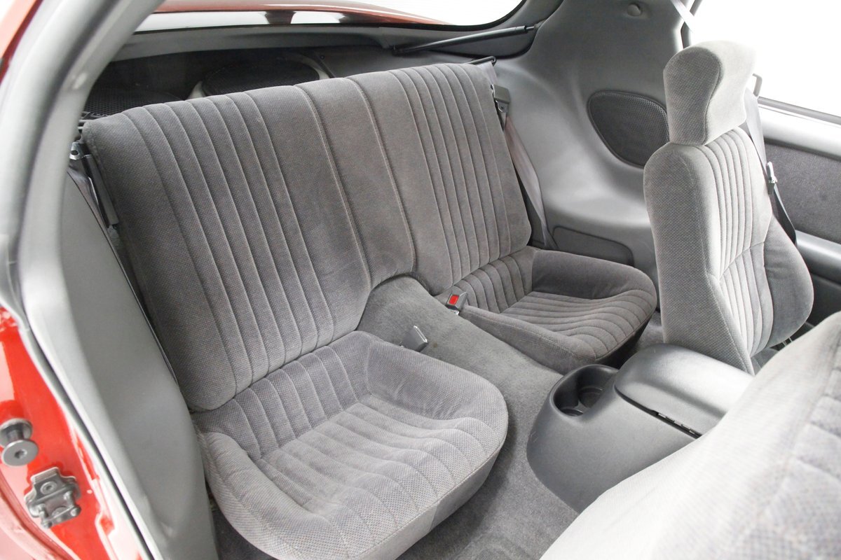 Charcoal gray bliss awaits us with a swing of the door. This hue mixes together in the door panels with their molded armrests and speaker surrounds in varying shades of charcoal gray along with some clean broadcloth for the inserts...sexy! Inside high back cloth covered buckets for the front and a 2 plus 2 bench in back, offer up comfy seating for 4. In the center a charcoal gray console races toward the dash, housing a glovebox, cup holders and the shifter on the way. As we rise upward, sculpted lines abound where temp wheels and a killer AM/FM/CD player with a built in eq are factory installed. Above are 3 eyeball vents to funnel air anywhere you want. A semicircular arch is in front of the steering wheel and underneath its padded visor we see 2 in trisecting circular gauges and a lineup of V shapes just below to convey all the vocals to the driver. Above is a black liner that is looking just terrific.