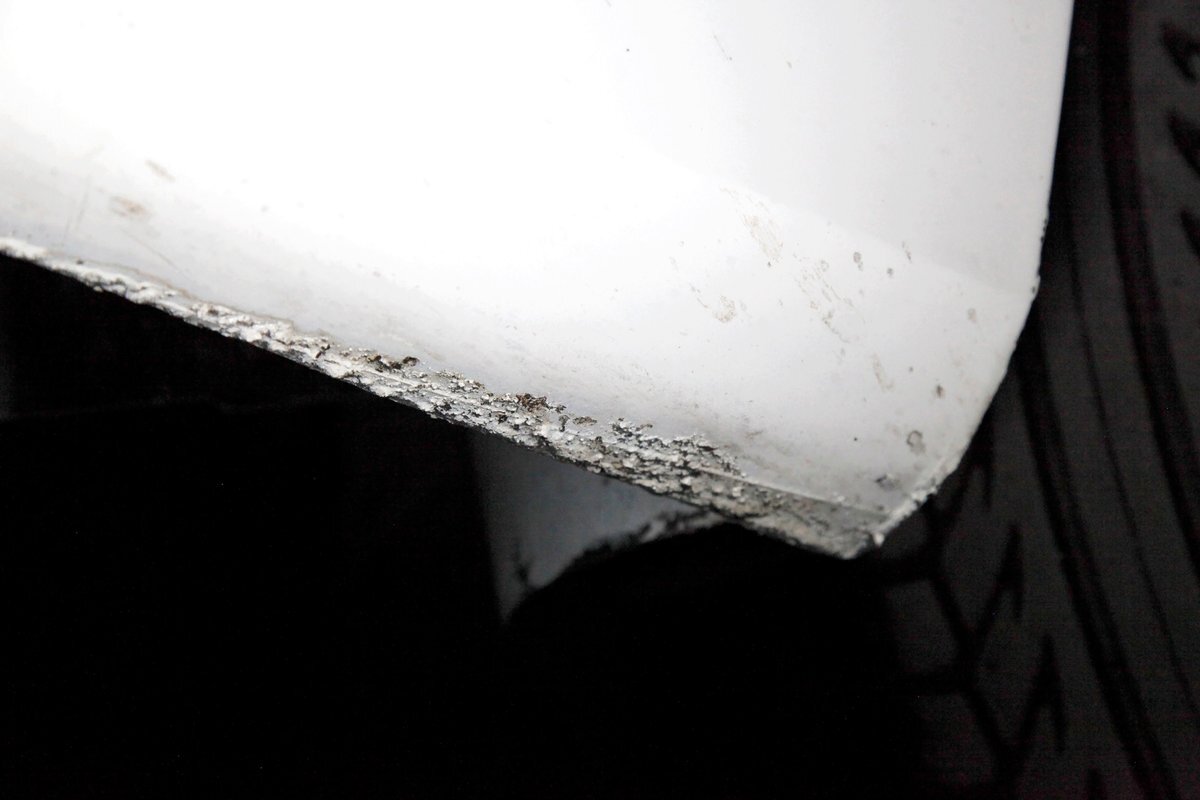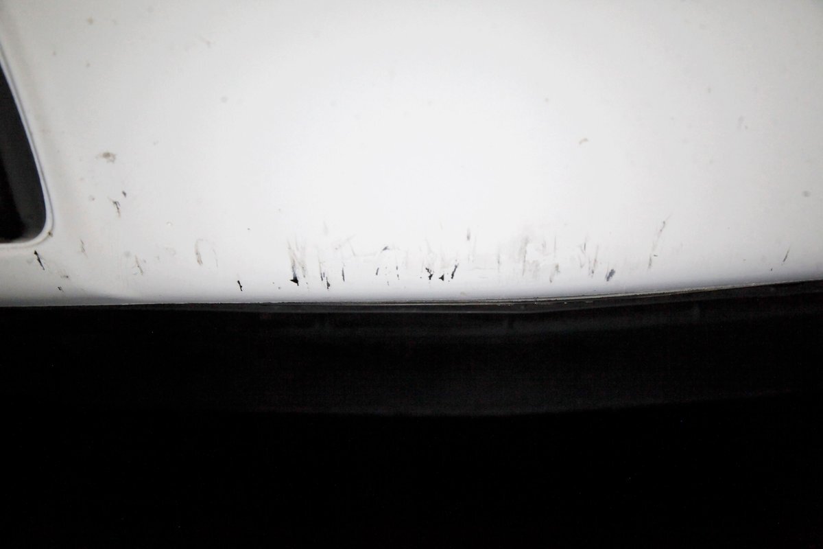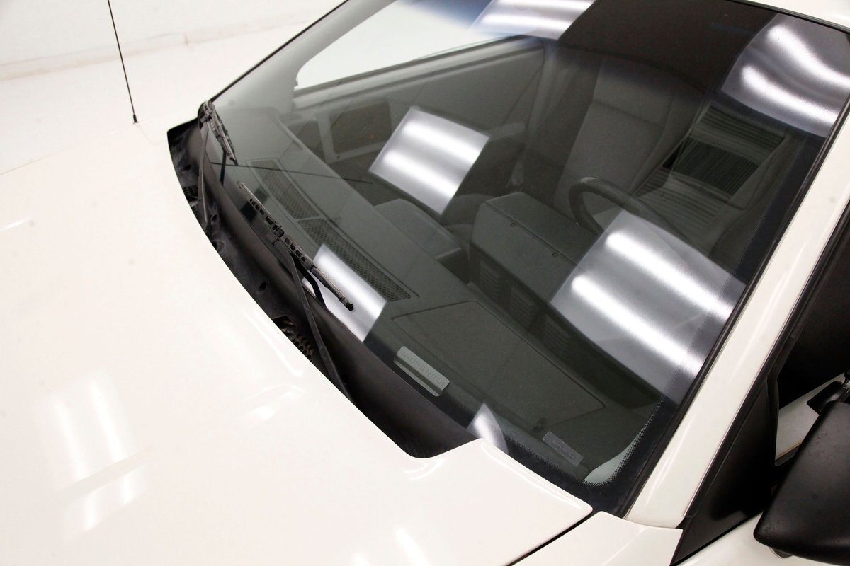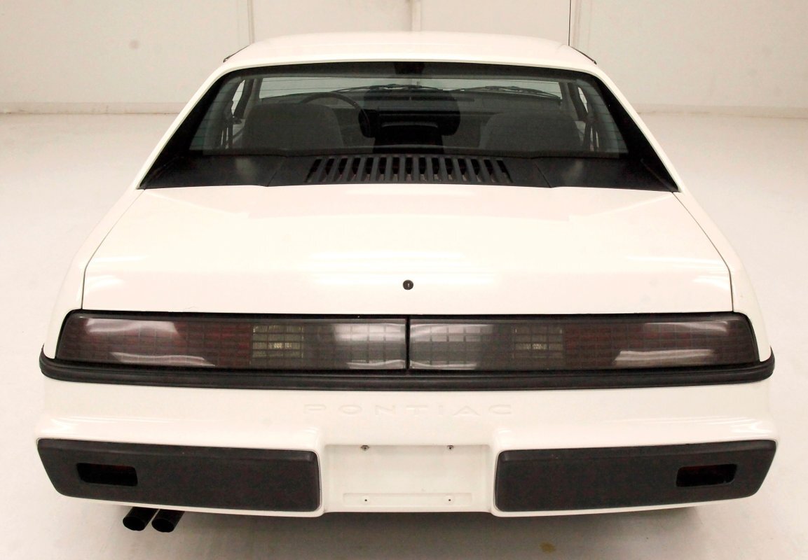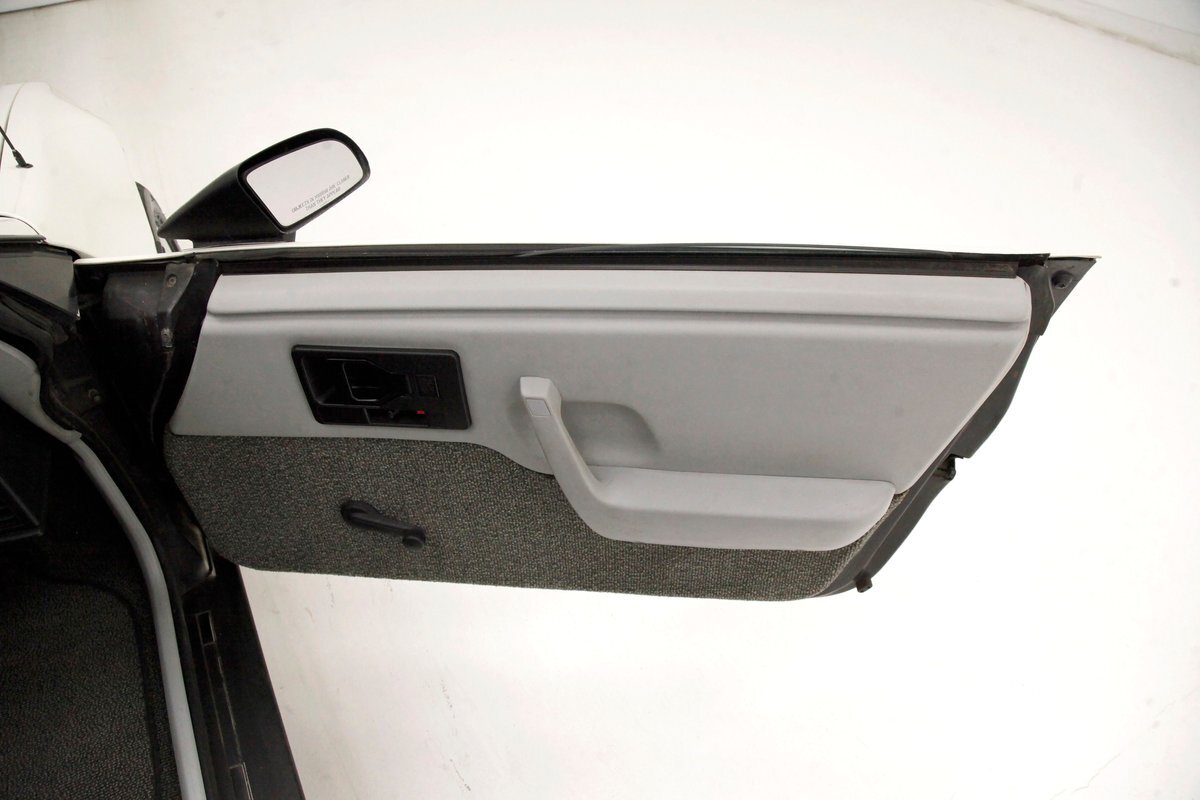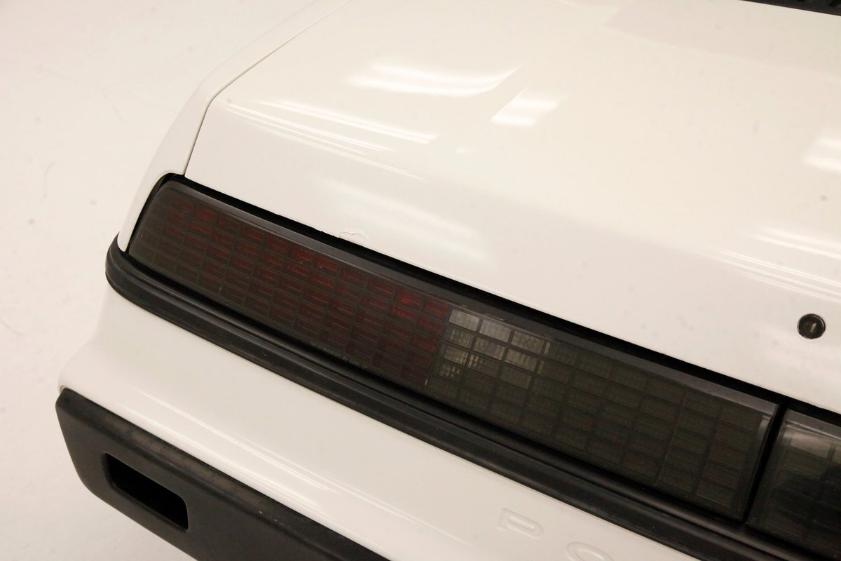 This low, 2 door, mid-engine sports car basically uses three kinds of plastic: reaction-injection-molded, (RIM), polyurethane, a "soft" plastic designed to take knocks on the front and rear bumpers; reinforced-reaction-injection-molded, (RRIM), polyurethane, a harder, but still supple plastic used on the sides and doors of the Fiero. This car's panels are bathed in white and is the original paint and body panels as this is a no hit car. Black accenting is seen with a wrap around the total car trimming just below the belt line and corresponding top to meet the mid-section of the front grille. A black rocker trim in plastic, black glass surrounds, and a black vent for the rear quarter helps gather up extra air for the mid-engine. 16-inch American Racing 5-spoke wheels are on this example and these are wrapped in like new BF Goodrich high performance black wall rubber.