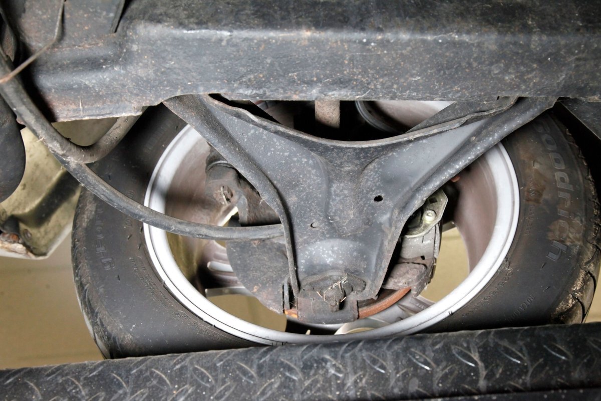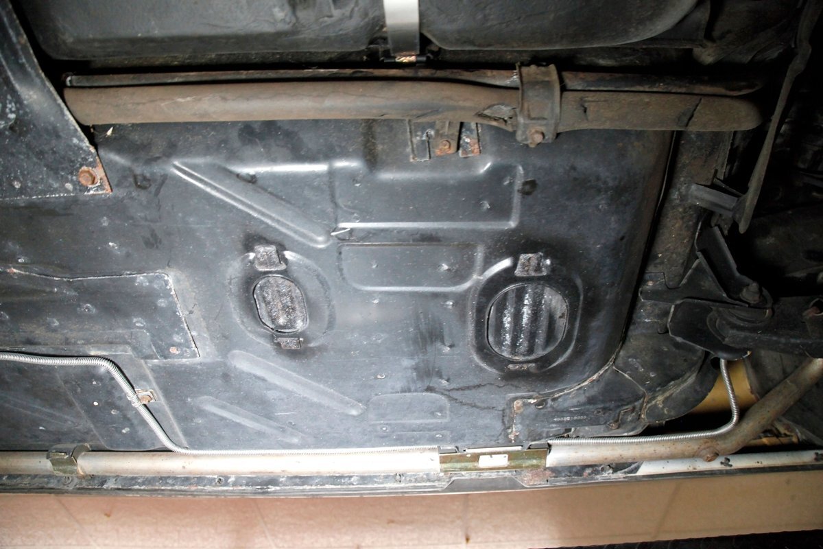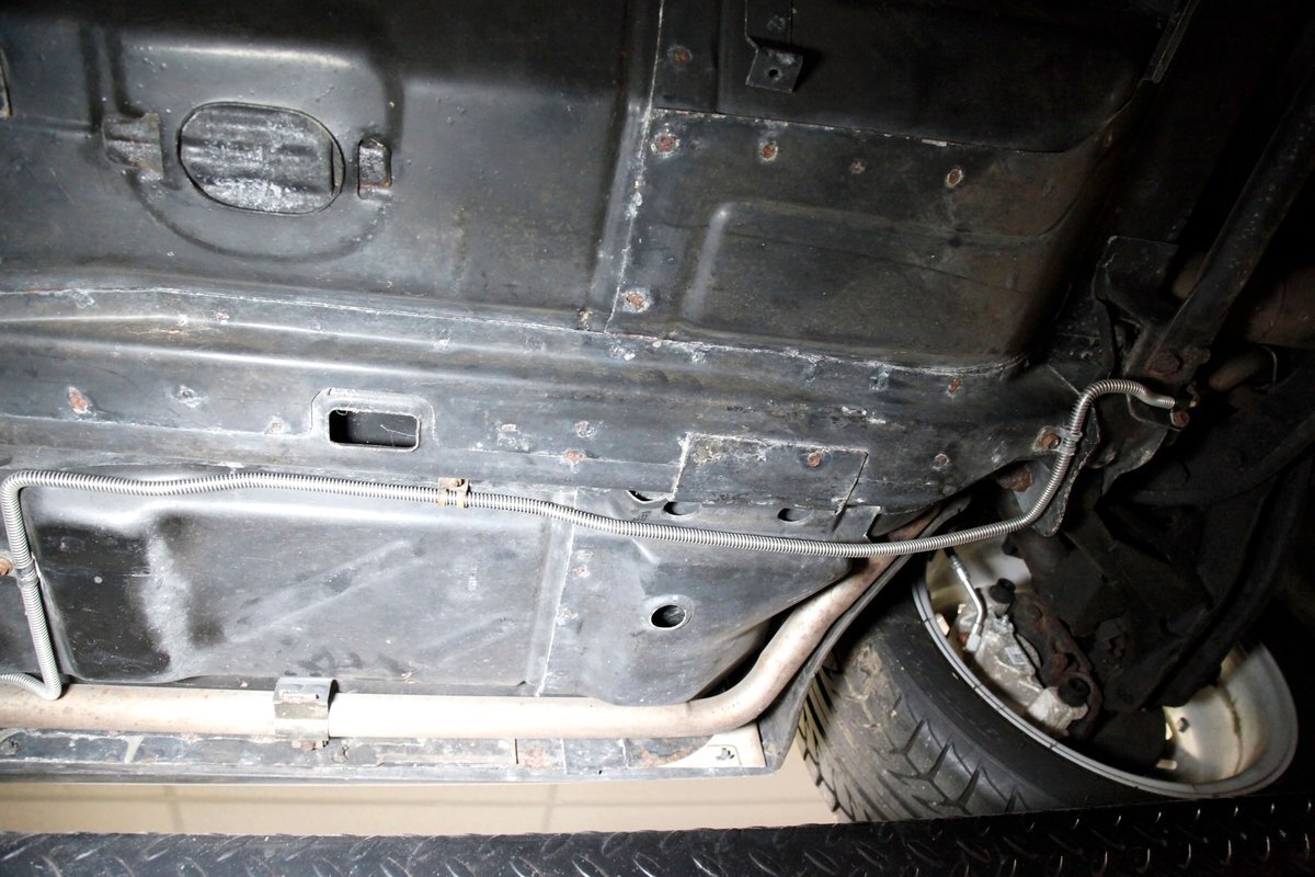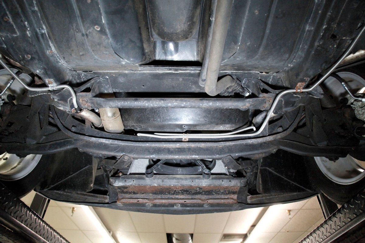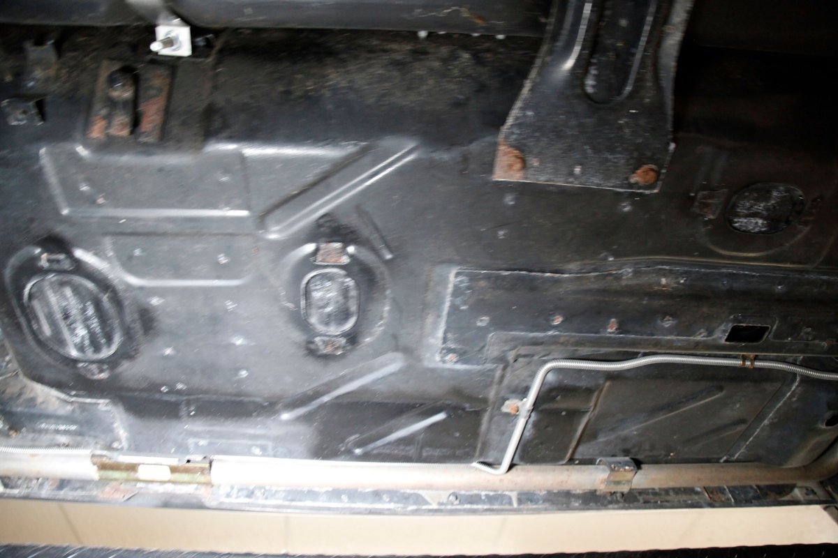 4 wheel independent suspension and 4 wheel power disc braking attach themselves to a clean rust free unibody which has black rust free rockers and floor pans. Pretty much a ground effects bottom with simple attachments and smooth metal abounding. Also noted, no major runs or drips from the engine's bottom end...AMAZING!