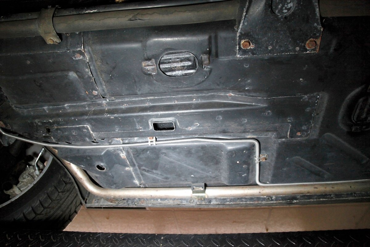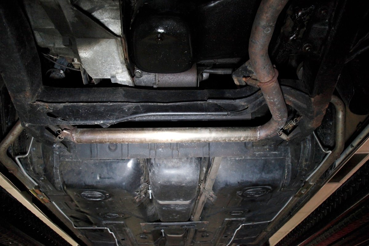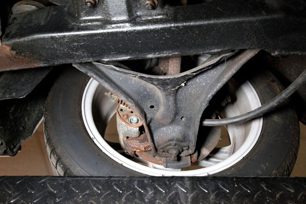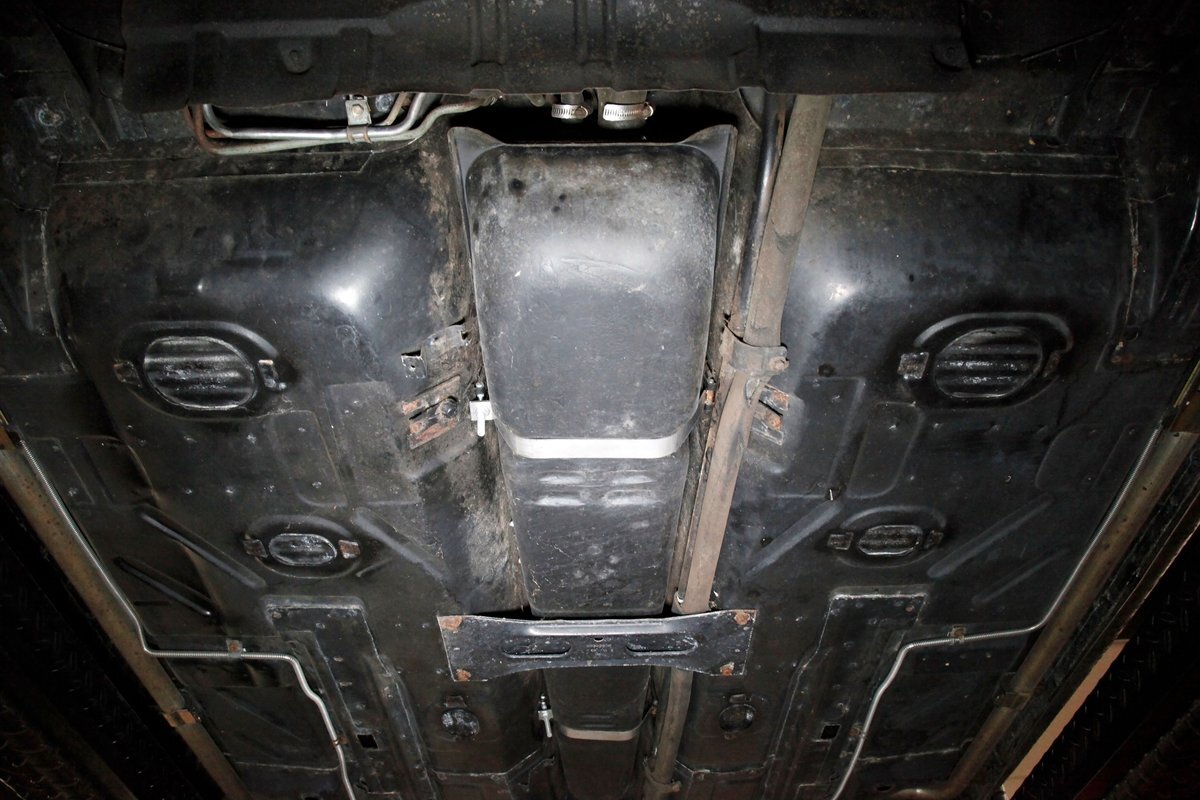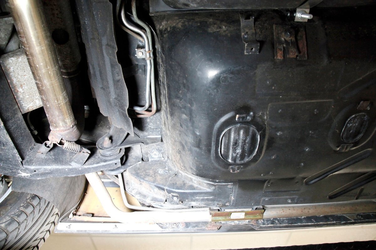 4 wheel independent suspension and 4 wheel power disc braking attach themselves to a clean rust free unibody which has black rust free rockers and floor pans. Pretty much a ground effects bottom with simple attachments and smooth metal abounding. Also noted, no major runs or drips from the engine's bottom end...AMAZING!