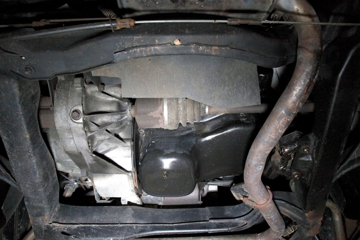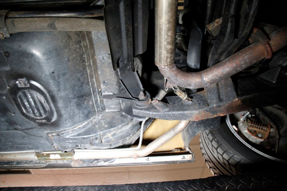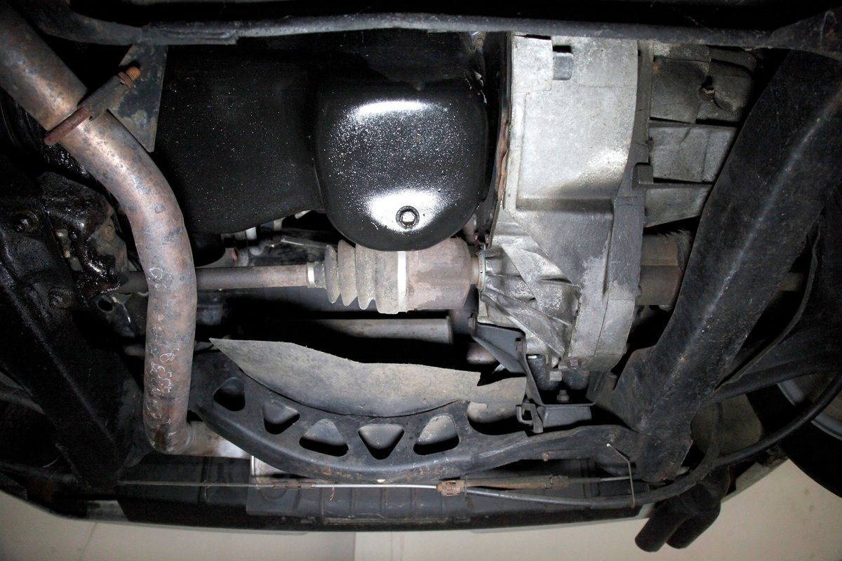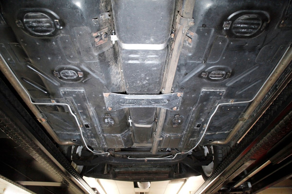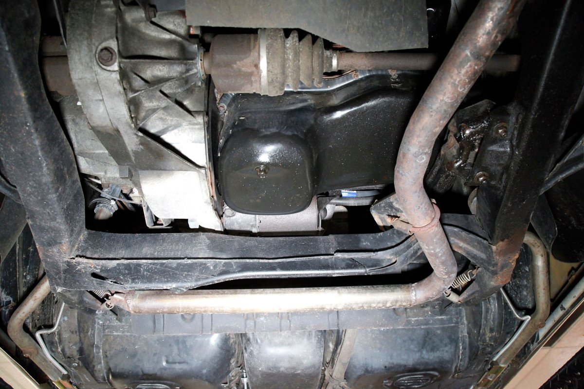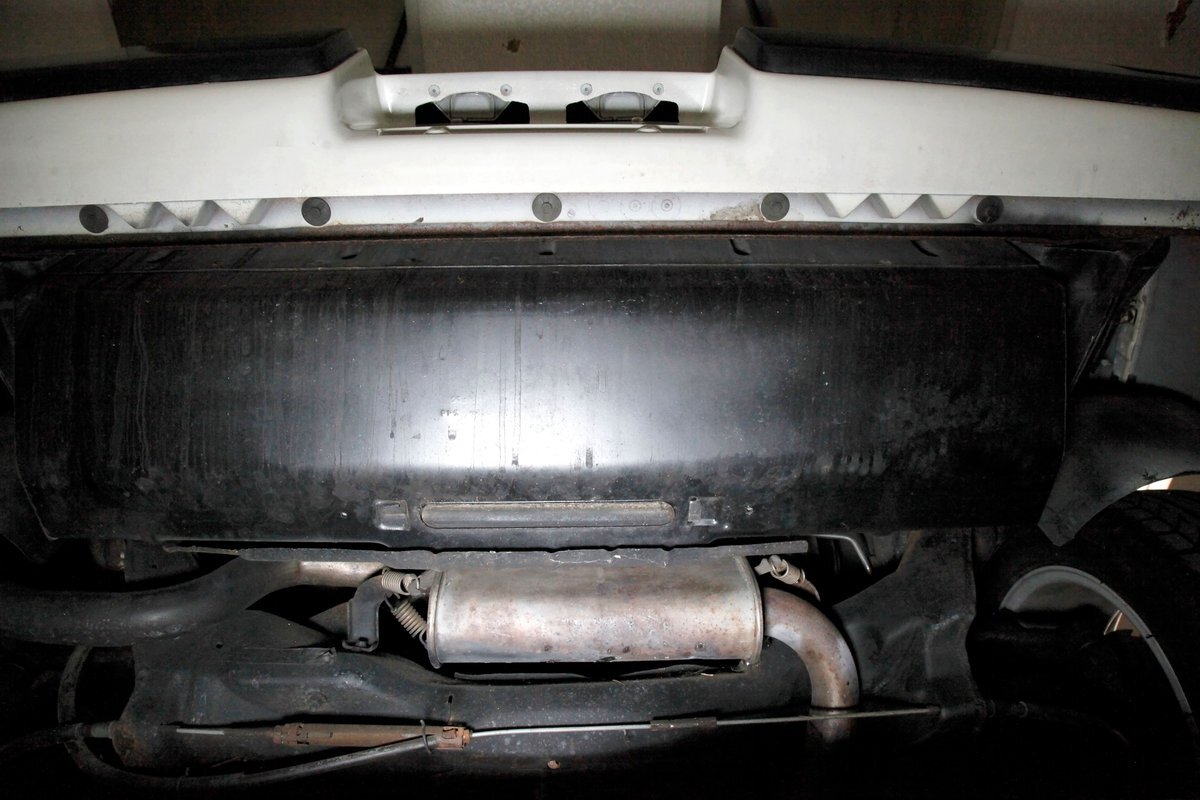 4 wheel independent suspension and 4 wheel power disc braking attach themselves to a clean rust free unibody which has black rust free rockers and floor pans. Pretty much a ground effects bottom with simple attachments and smooth metal abounding. Also noted, no major runs or drips from the engine's bottom end...AMAZING!