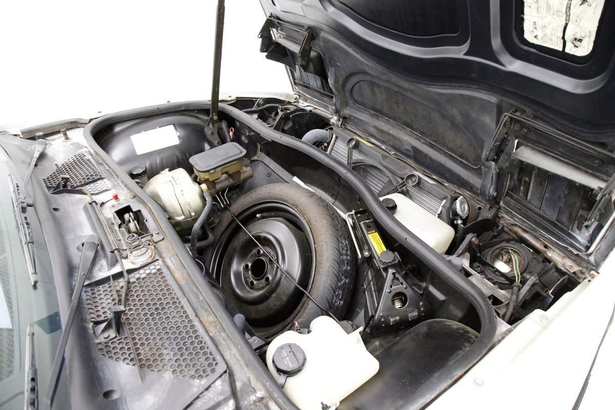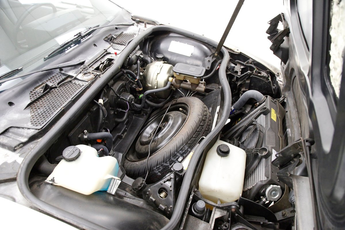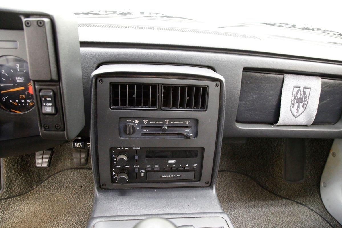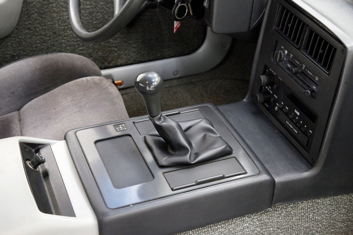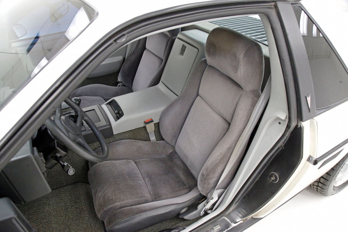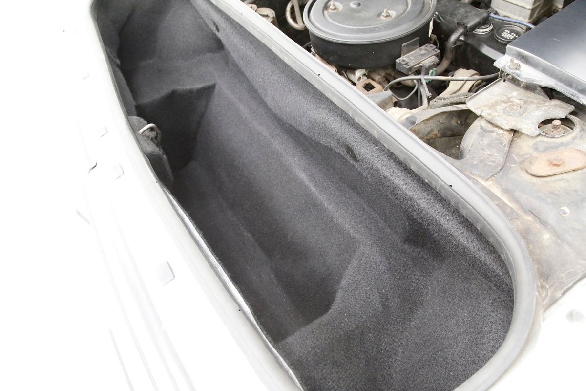 Designated a 2-seater, mid 4-cylinder engine, we swing the doors and see the 2 buckets covered in dark gray broadcloth for the inserts and body hugging bolsters. These also show inset speakers in the headrests and are like new and very clean. A large wide center console is between the buckets and houses a large storage compartment, the shift lever, cigar lighter and twin ashtrays. Taking the square and rectangle design motif to the max, the dash is made up of a series of squares and rectangles in black with inserted instruments and other controls. A surrounding light gray dash front within which are these protruding shapes. Carrying this idea to the edges where the A/C and heat vents are also on their own vertical blocks on either side. The door panels are light gray with black fields for the actuators and window cranks, meanwhile gray and black peppered carpeted panels reside below. Very clean like new black peppered gray carpeting floods the floors, and above is a fuzzy headliner which has a few areas of light sagging.