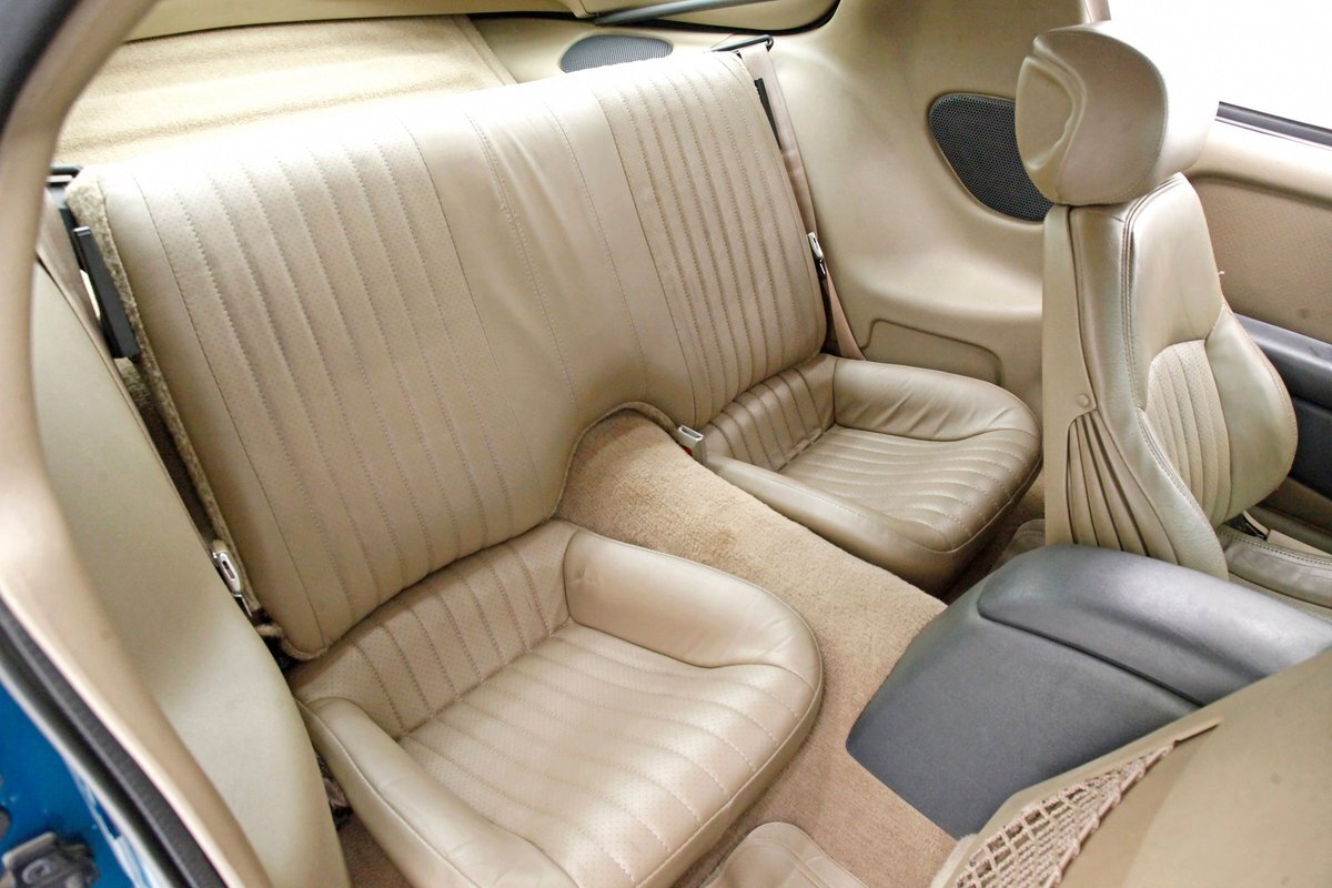 The styling euro design continues with the door panels which use molded black plastic for the door pulls and armrests as well as the door actuator, storage tray on the bottom and a small but mighty tweeter surround. This black is broken up by beige vinyl all nicely molded in and very clean. Stepping across the thresh-hold we see some sexy high back buckets that have uber curvaceous designs with tuck and roll inserts and some more tuck and roll on the side bolsters, and a sleek headrest on top. In back the hump breaks up the 2+2 seats in the same style as the front buckets and pristine beige leather. A black undulating center console is between the buckets and houses a glovebox and shifter. As this rises to the center dash we see more black panels with climate knobs and a killer AM/FM/CD with EQ stereo system. A trio of round vents is on the padded dash top. In front of the driver is a semi circular dash with semicircular blackface gauges and orange pointers. Beige carpeting floods the floors and above a fuzzy tight new molded headliner floats above all the chairs and curves of the interior.
