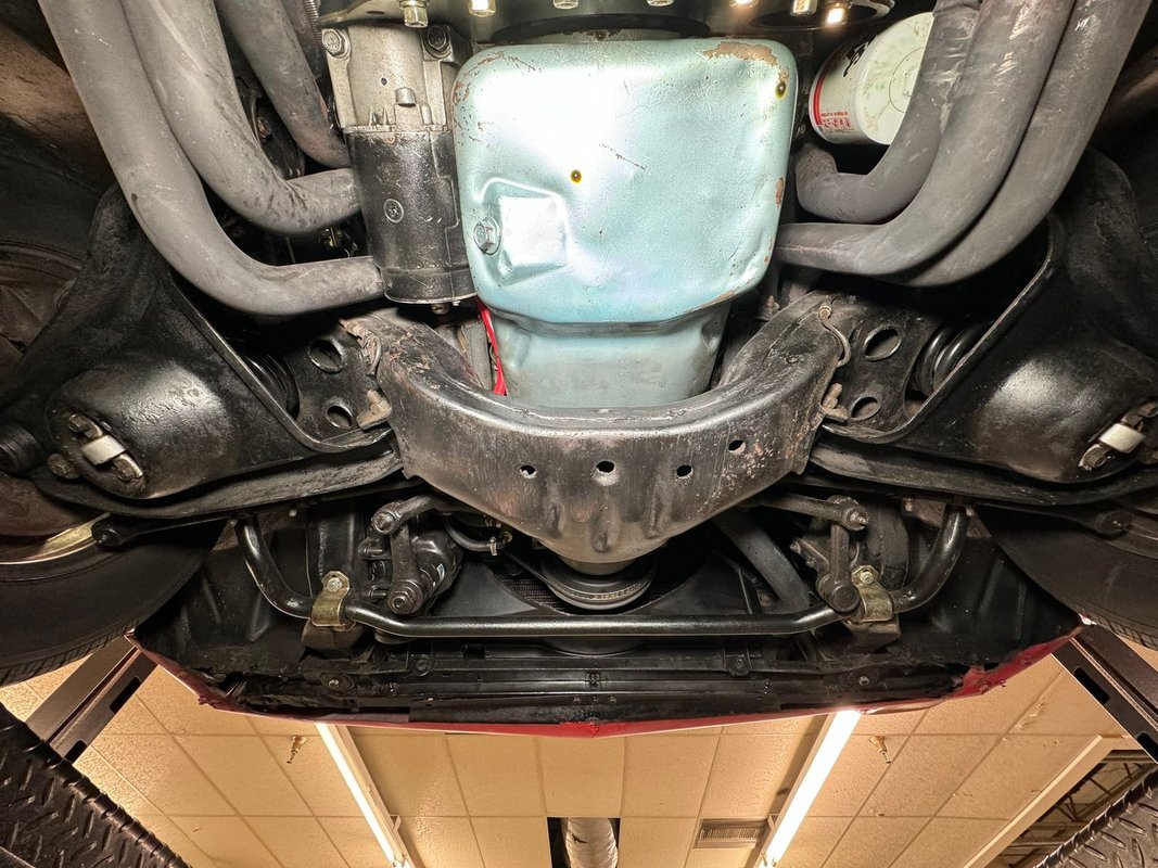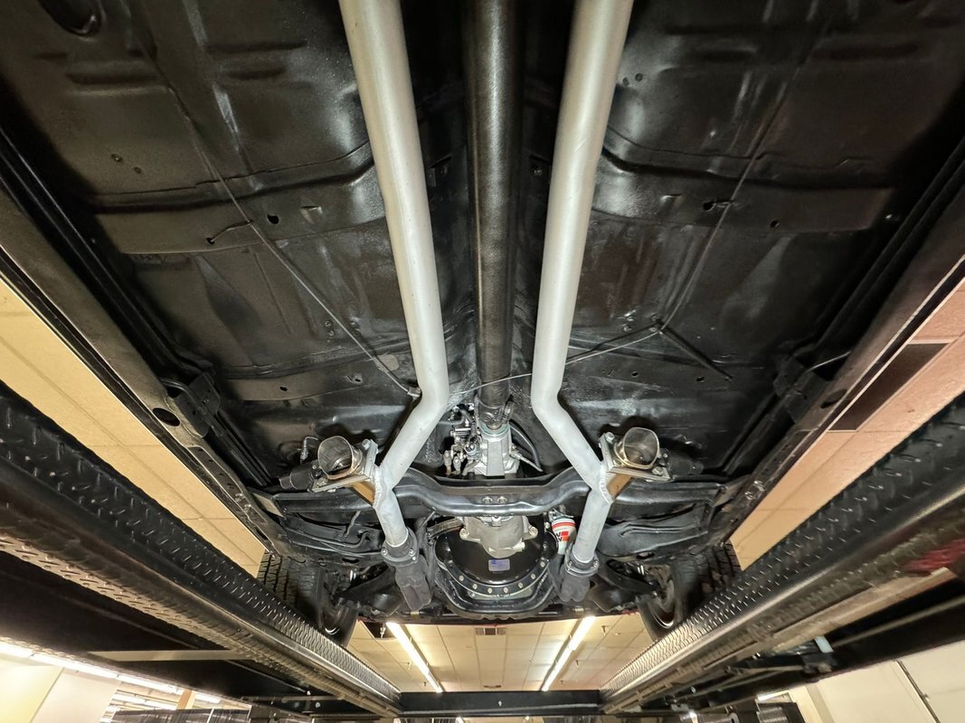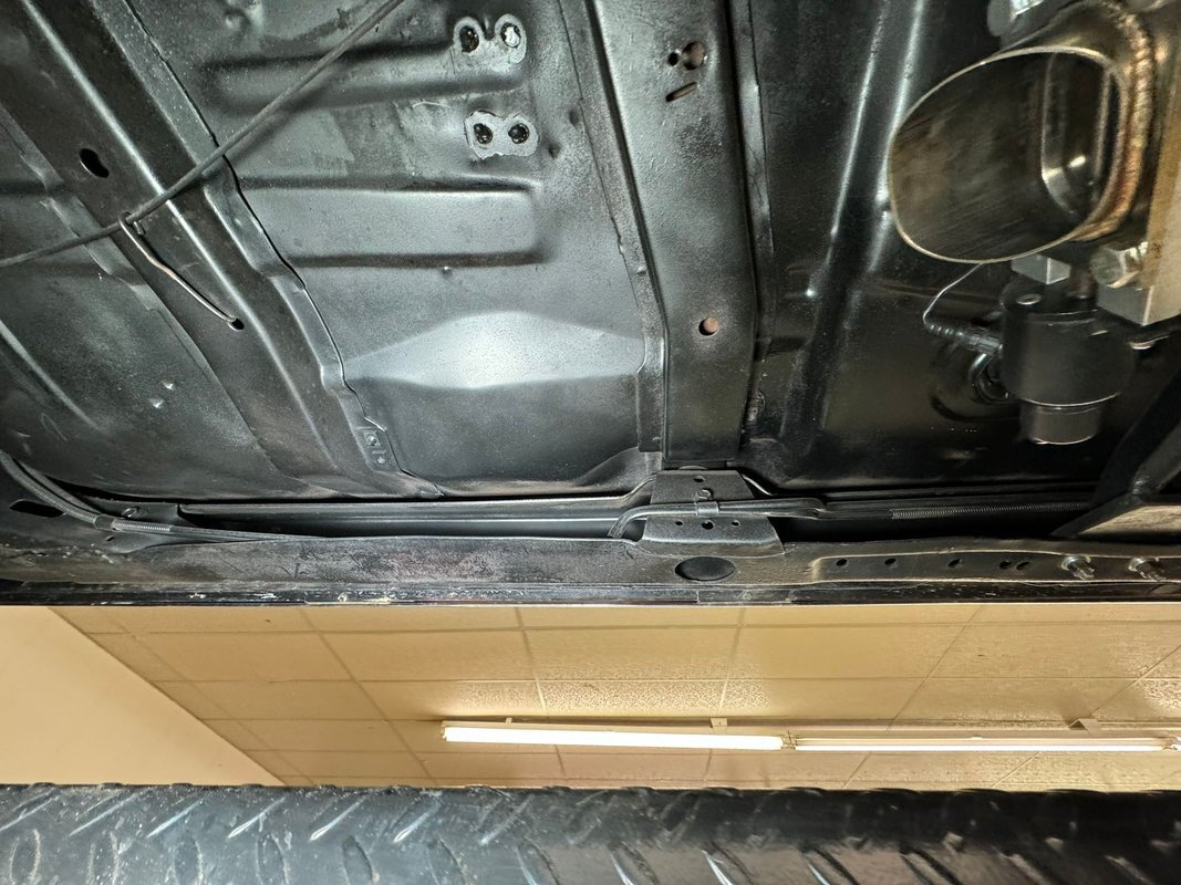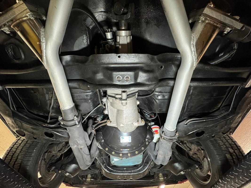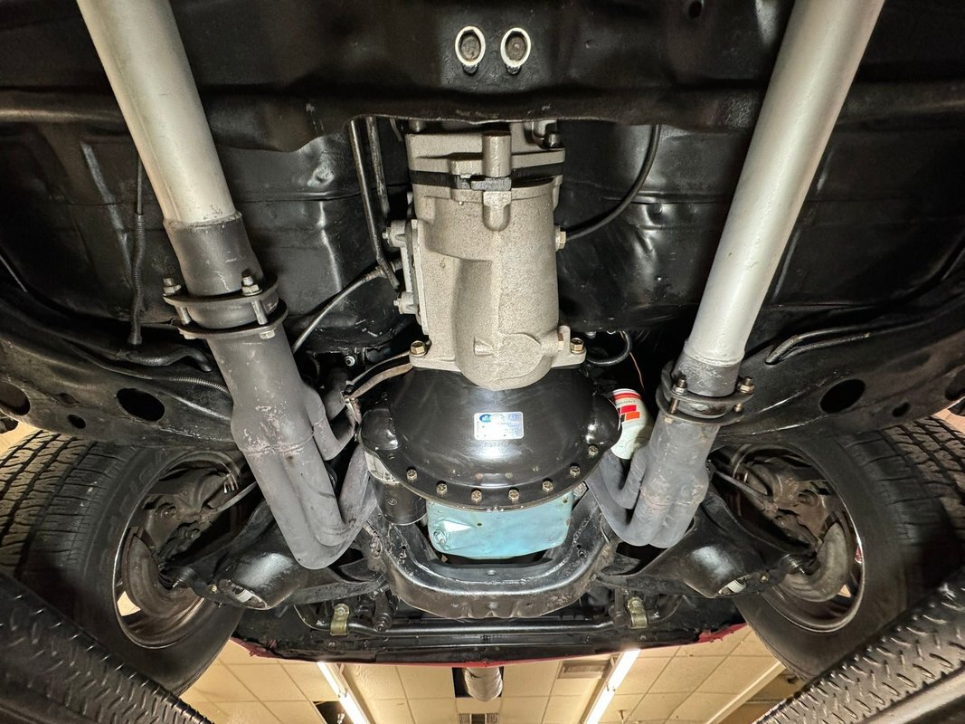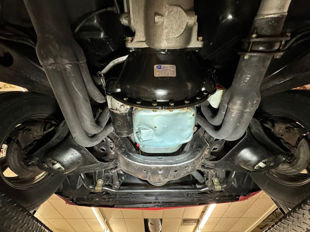Give this car a lift and we are met with independent front suspension and 4-link rear suspension. Eaton coil springs are now on. A button controlled solenoid runs the line lock. Power disc braking is upfront, and power drums are on back. All of this is supported by a strong steel frame with just pure black paint and no rust or even road dirt.