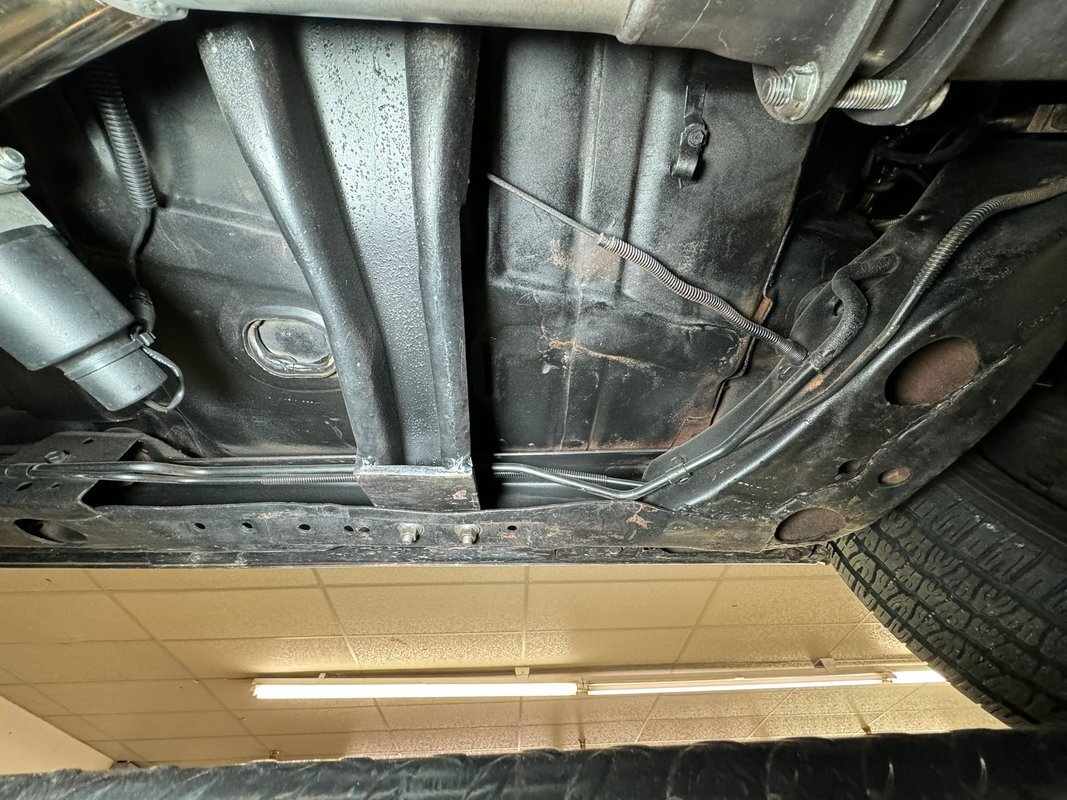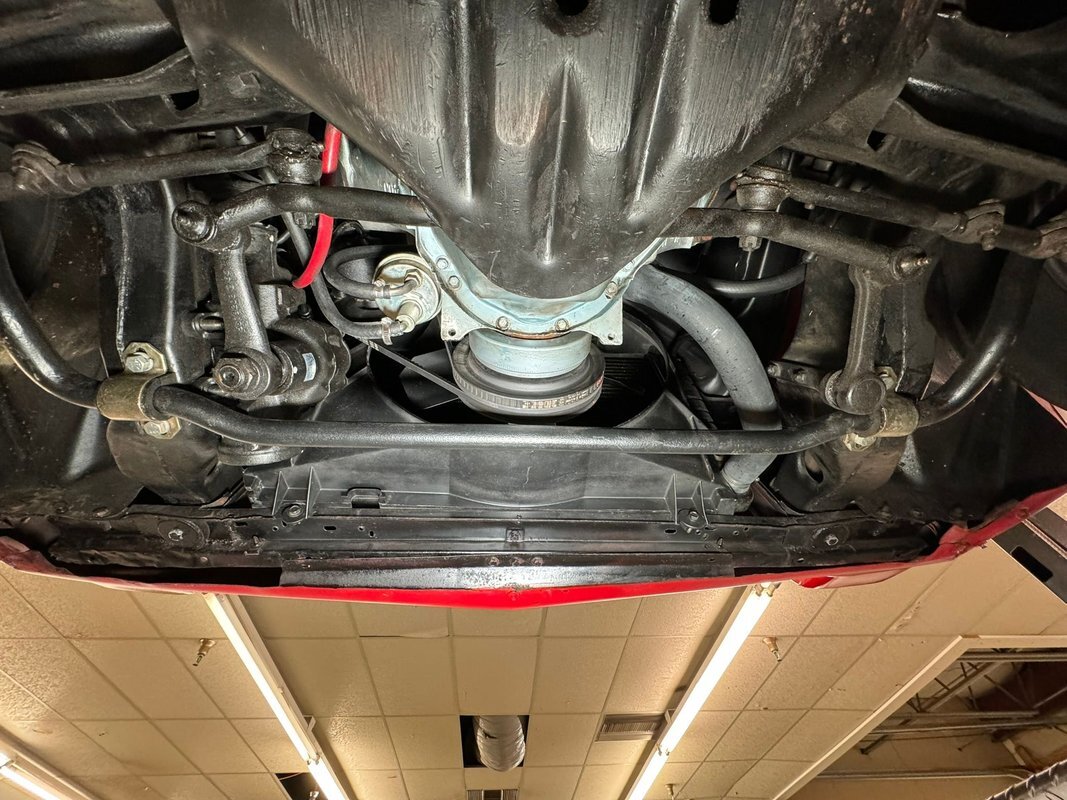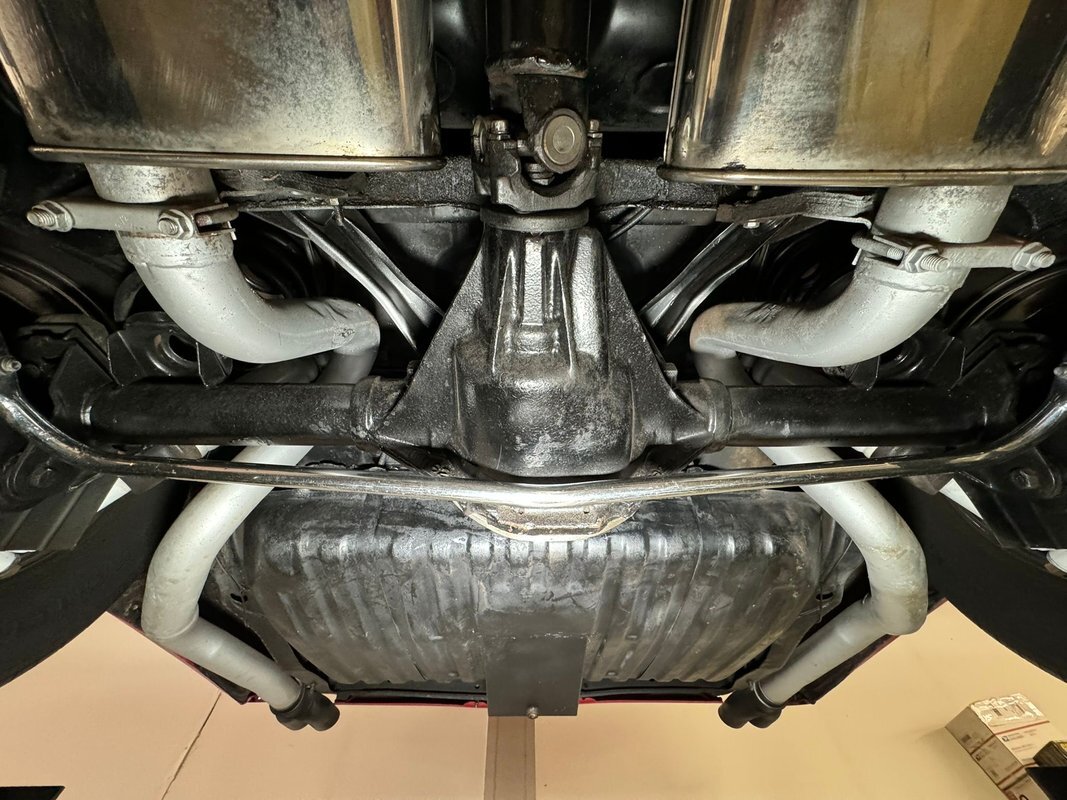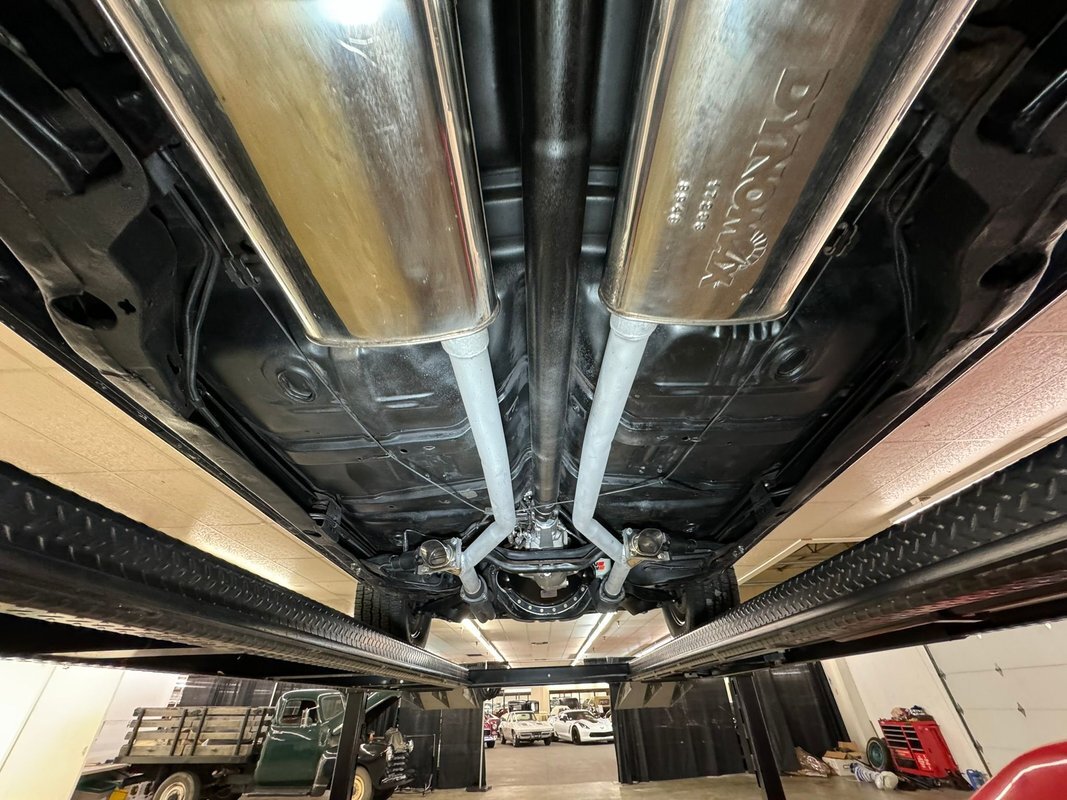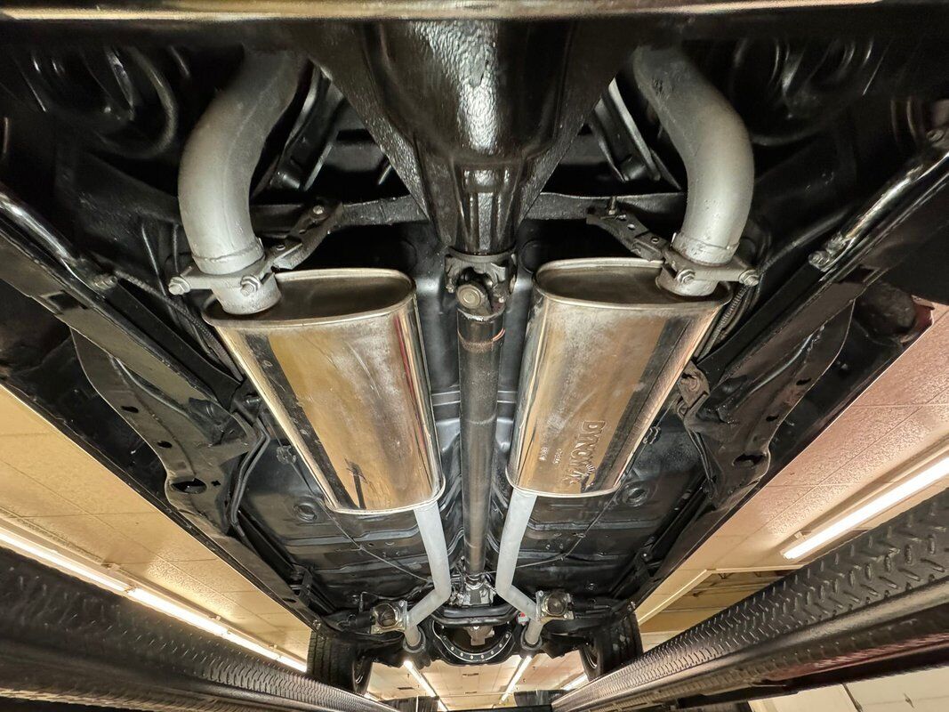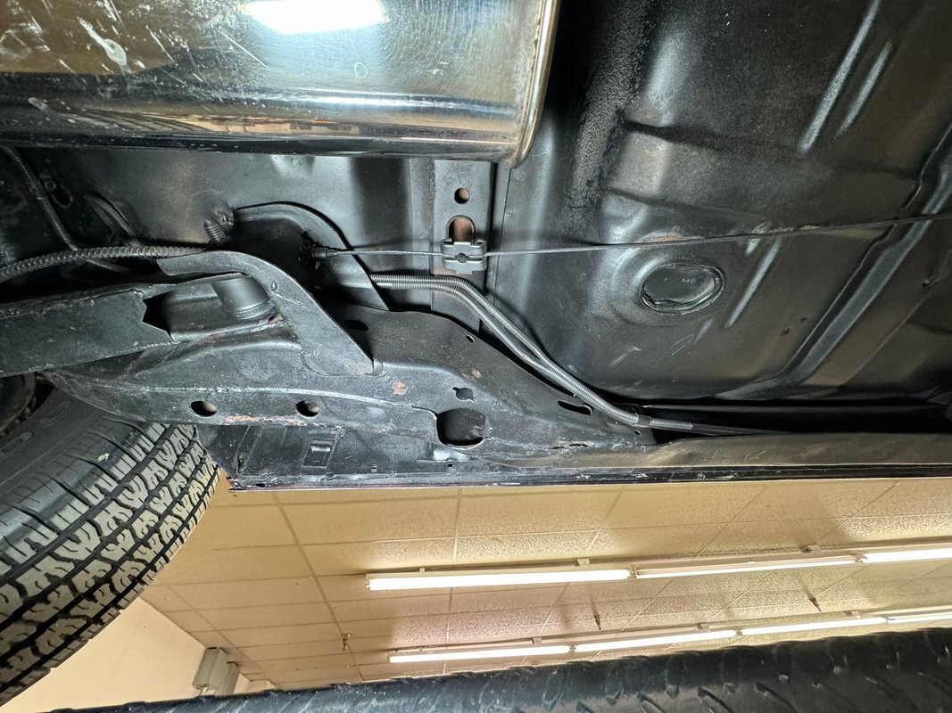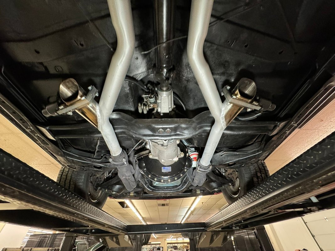 Give this car a lift and we are met with independent front suspension and 4-link rear suspension. Eaton coil springs are now on. A button controlled solenoid runs the line lock. Power disc braking is upfront, and power drums are on back. All of this is supported by a strong steel frame with just pure black paint and no rust or even road dirt.