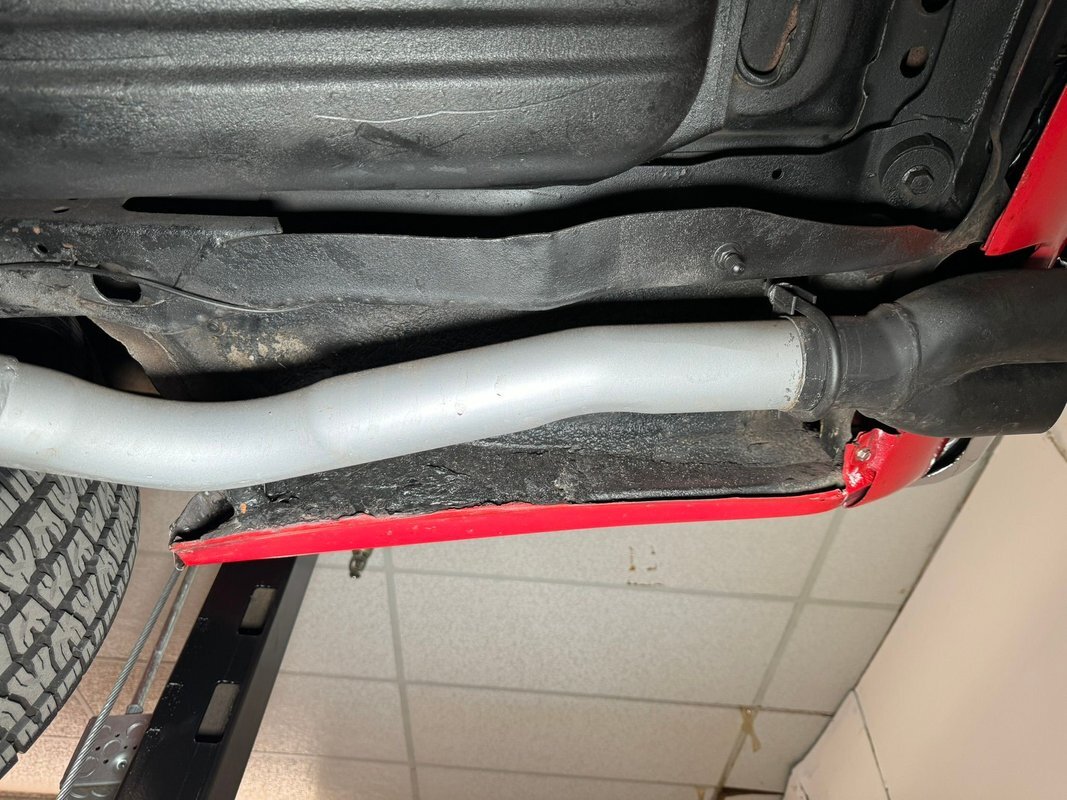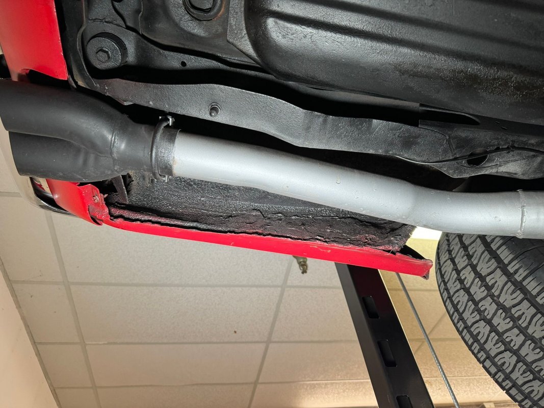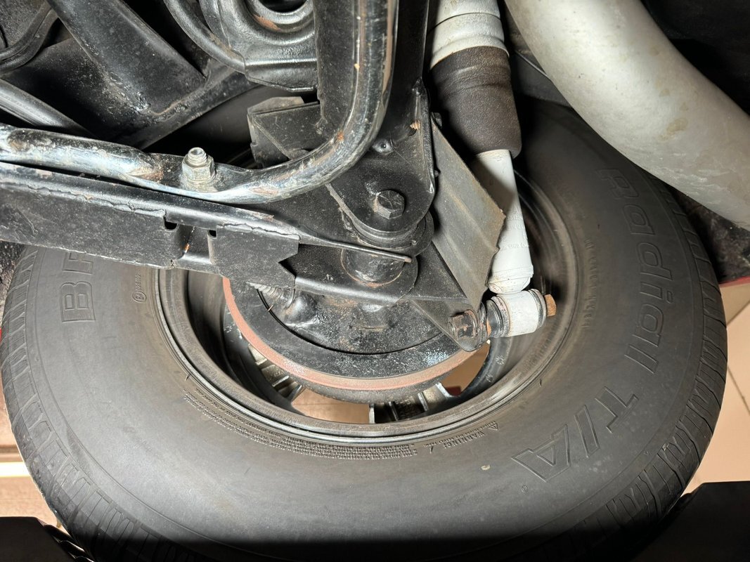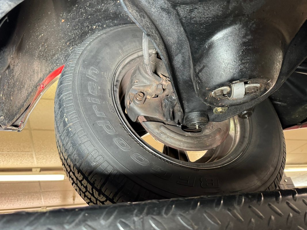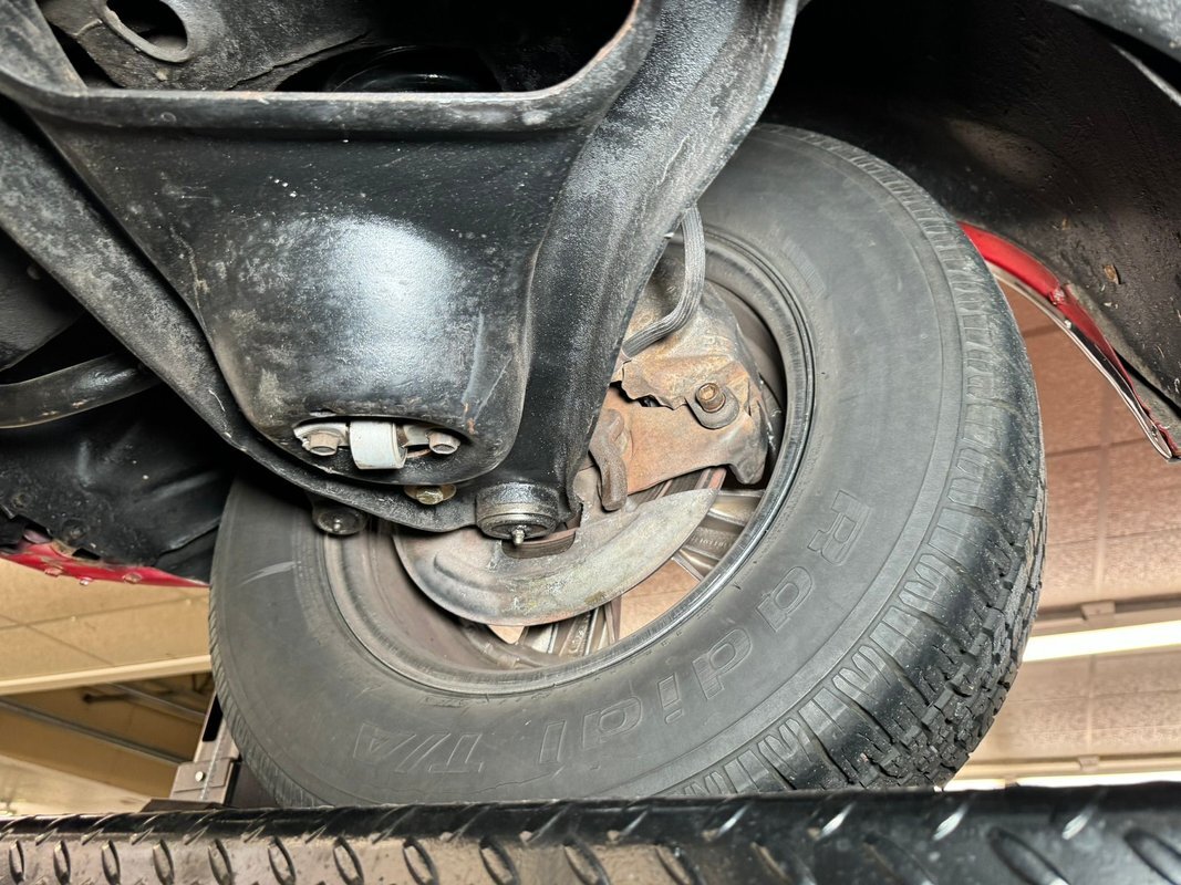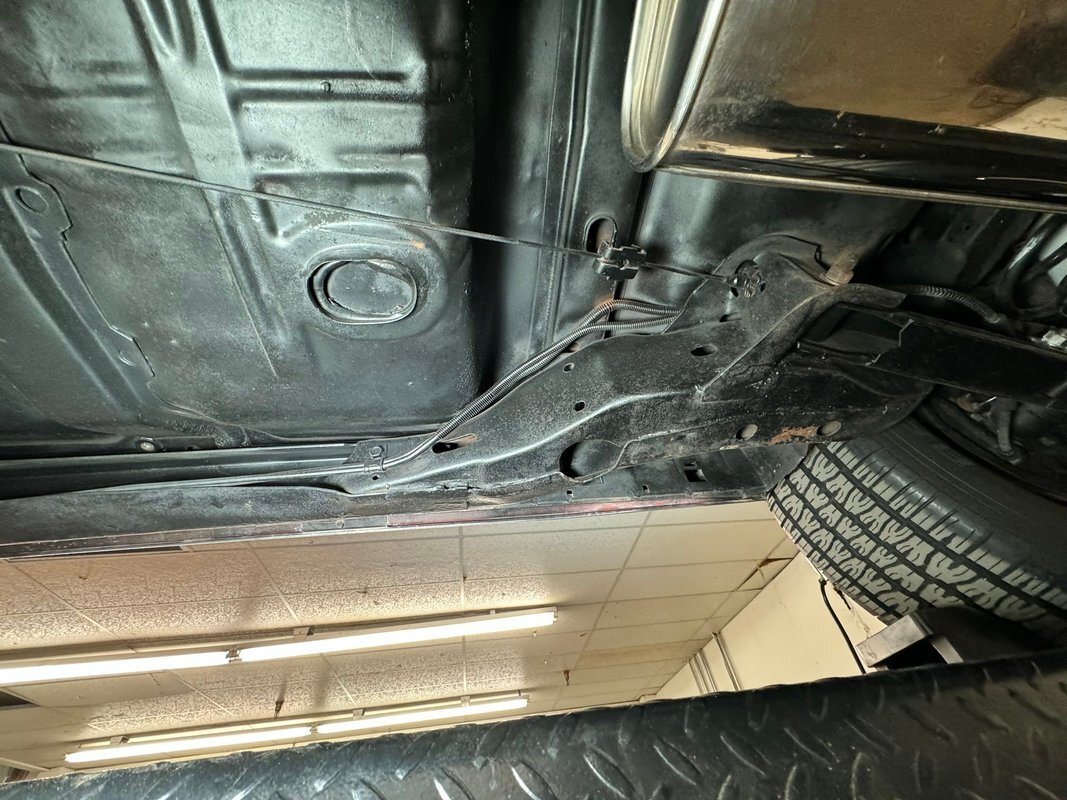 Give this car a lift and we are met with independent front suspension and 4-link rear suspension. Eaton coil springs are now on. A button controlled solenoid runs the line lock. Power disc braking is upfront, and power drums are on back. All of this is supported by a strong steel frame with just pure black paint and no rust or even road dirt.