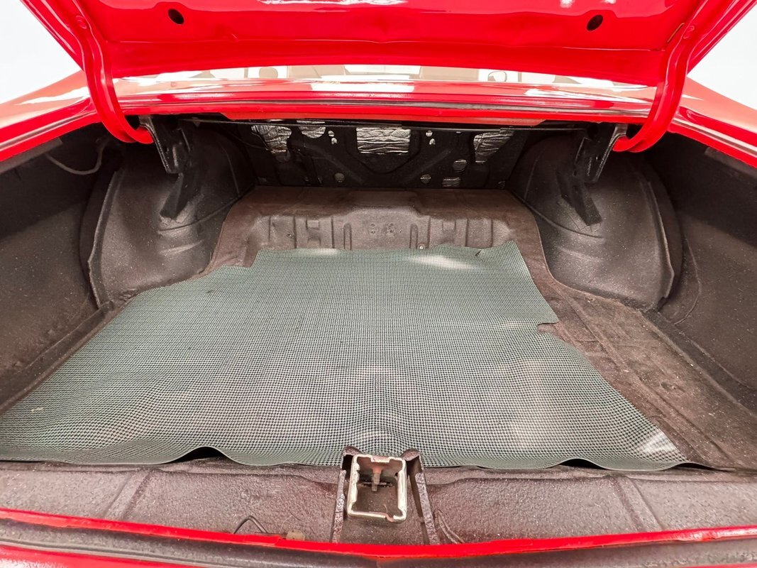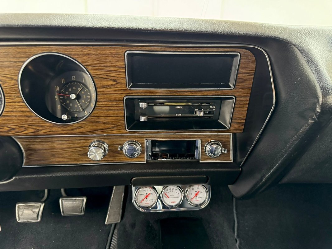 Take a look inside this A-Body's cockpit and you'll find a snazzy correct black vinyl covered interior. Front and center a straight and crack-free dash wears a wood applique around the deep inset original gauges with a chromed panel at the bottom hosting a trio of extra gauges. On the floor, a Hurst shifter in the original center console sits between the two bucket front seats. The seating, both front buckets and rear bench show very nicely with the driver's seat being the only area presenting with little wear, albeit minimal. At the sides of those seats, stainless-trimmed door panels have black tuck and roll inserts housing original hardware and armrests. Below those panels, very clean black carpet frames chrome-trimmed foot pedals. In front of the driver is a 3 spoke padded rimmed steering wheel with its Pontiac arrowhead in the center. Behind the passengers, the trunk is finished with correct spatter paint and has a correct liner mat. Also seen and heard is a Retro classic AM/FM radio with Crutchfield speakers.