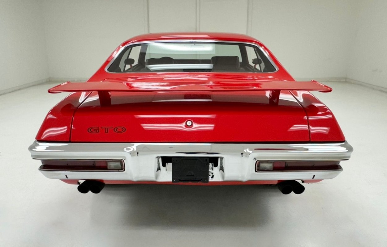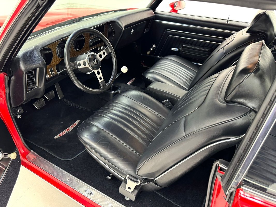 For 1970 GM tweaked the GTO's design with a number of detail changes and subtle refinements. At the front of the car, Pontiac's installed smaller twin grilles with quad headlamps at the edges of the iconic Endura bumper. Below that bumper, the car's front valance features revised and more aggressive square parking lights; and above that bumper, a sculpted hood with Pontiac's legendary 'twin nostril' Ram Air air intakes and just aft of this a hood mounted tachometer. Behind the tach, the windshield glass is bordered by an attractive layer of bright stainless trim and a Cardinal Red driver's side mirror. Below that mirror and bathed in a nice respray of Cardinal Red that shows with inclusions and some underlying cracking in the Endura nose. Aggressive fenders and body lines are highlighted by dent-free stainless wheel well trim, straight stainless rocker moldings and traditional chrome door handles. The gaps are well minded throughout the body and on the back fenders, '68-era arrowhead marker lights have been exchanged for wrap-around tail lights within the confines of a chrome bumper that hangs proudly with new for 1970 tail lights just above quad exhaust tips. Never overlooked are the GTO decal callouts in black knockout type font on the front fenders and the trunk lid, so you don't forget who you're about to mess with. 15-inch Cragar polished SS wheels are on all 4 corners and give the right vibe.