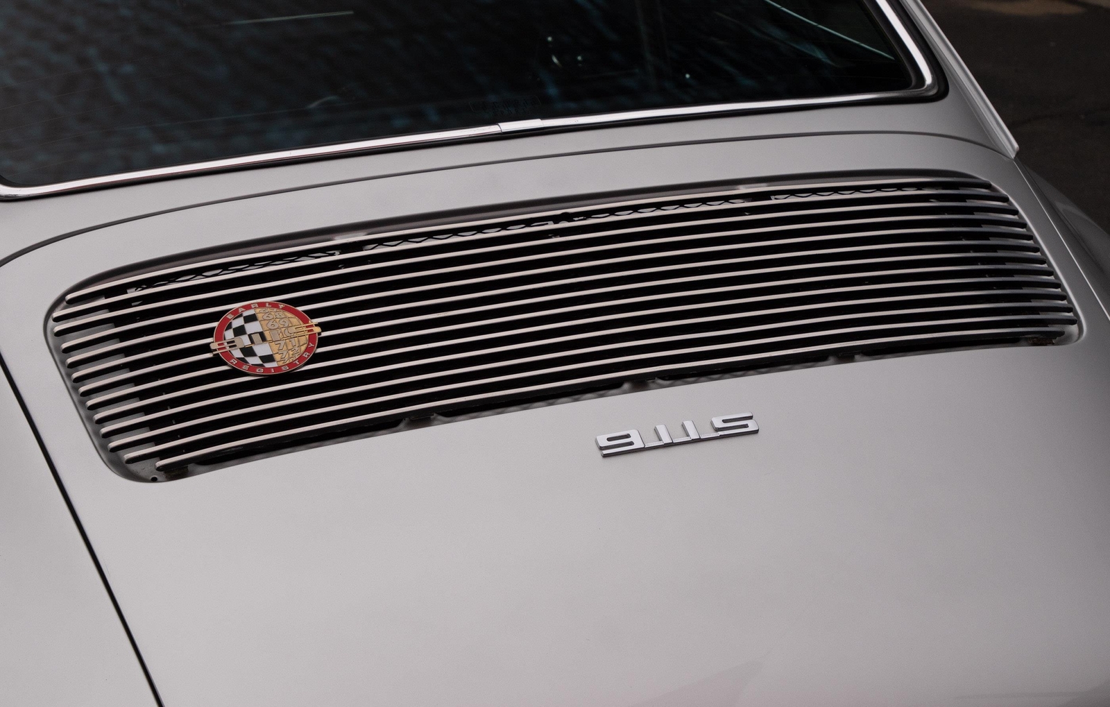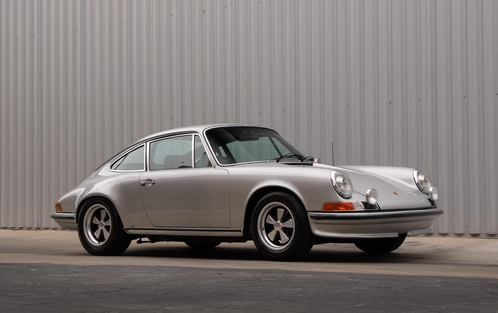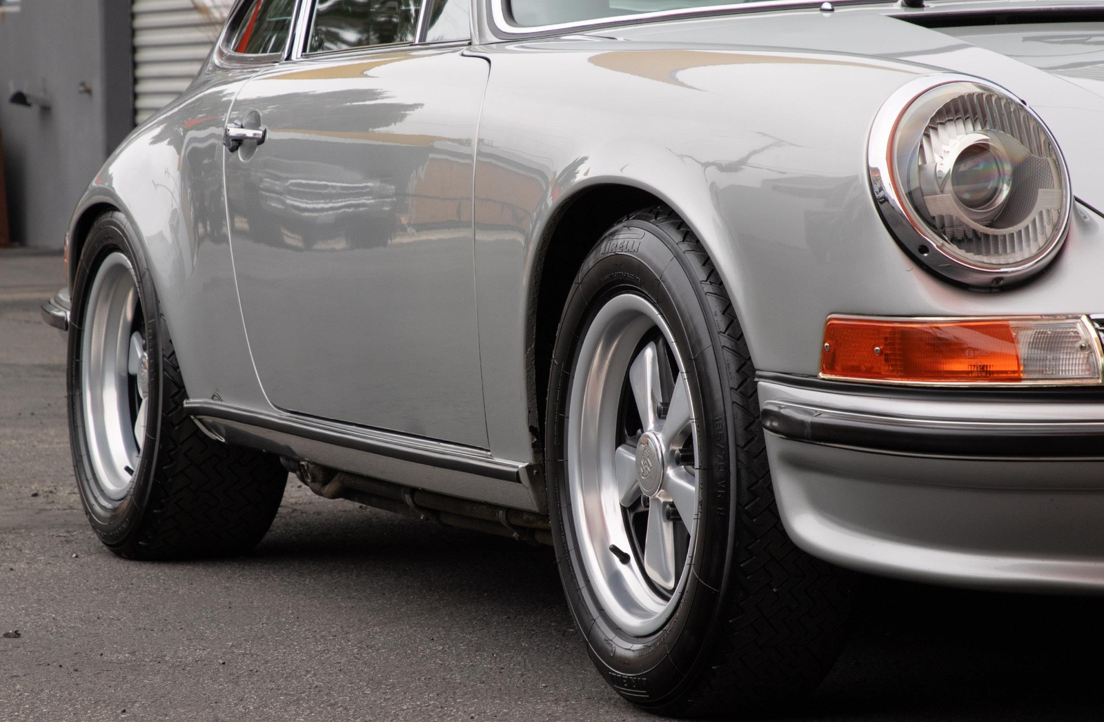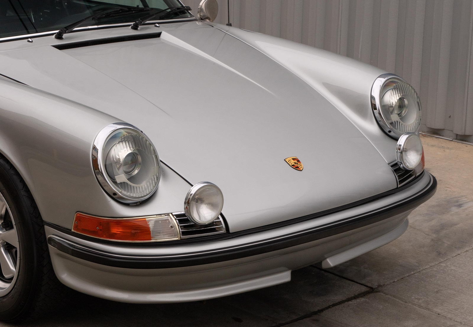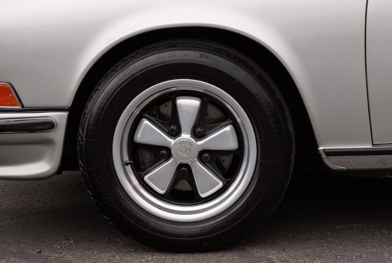 The exterior of this 911 is very nice and in a high-level driver condition. The silver paint looks good with no major flaws. There are a few very minor chips here and there from normal use. The body gaps are good and the doors fit nicely. The brightwork trim/deco appears to be original and in good shape with no major scratches. The windshield was replaced some time ago with a PPG green tinted glass to match the factory glass. There’s one small chip on the driver's side that’s been professionally repaired. The rest of the glass is original factory light green tinted and in good shape. The proper factory stampings are visible. There are some plugs in the door thresholds where Ziebart protective sealant was installed when the car was new. The driver door mirror (1969-1971) is a reproduction that vibrates and is not correct for an RS look. The antenna doesn’t go all the way down, but it works. The LED headlights and through-the-grill fog lights all work. The factory Fuchs (7’s and 8’s by 15) are in excellent shape with the correct anodized finish. There are no signs of major curb rash and they are wearing Pirelli CN36 tires with about half-life or more remaining. They were installed in 2019 after the flares were done. It’s typical for these tires to have different date stamps as Pirelli makes them in small batches. The brake pads have more than half-life remaining and no lips on the cross-drilled rotors.
