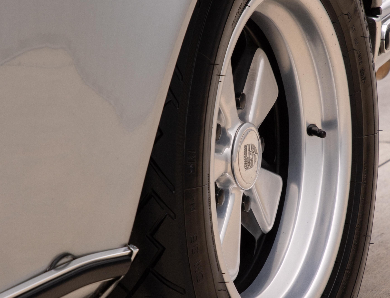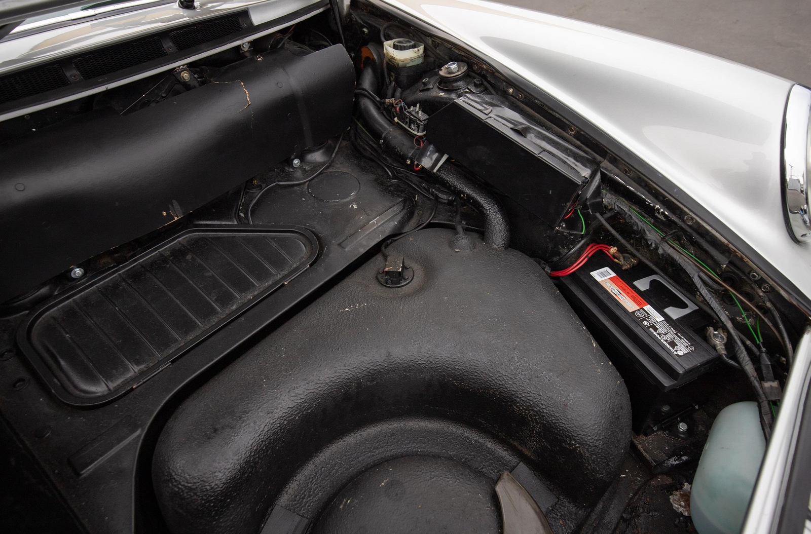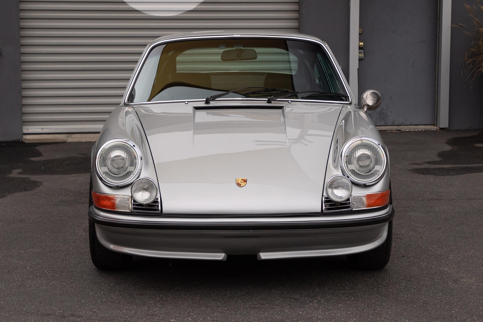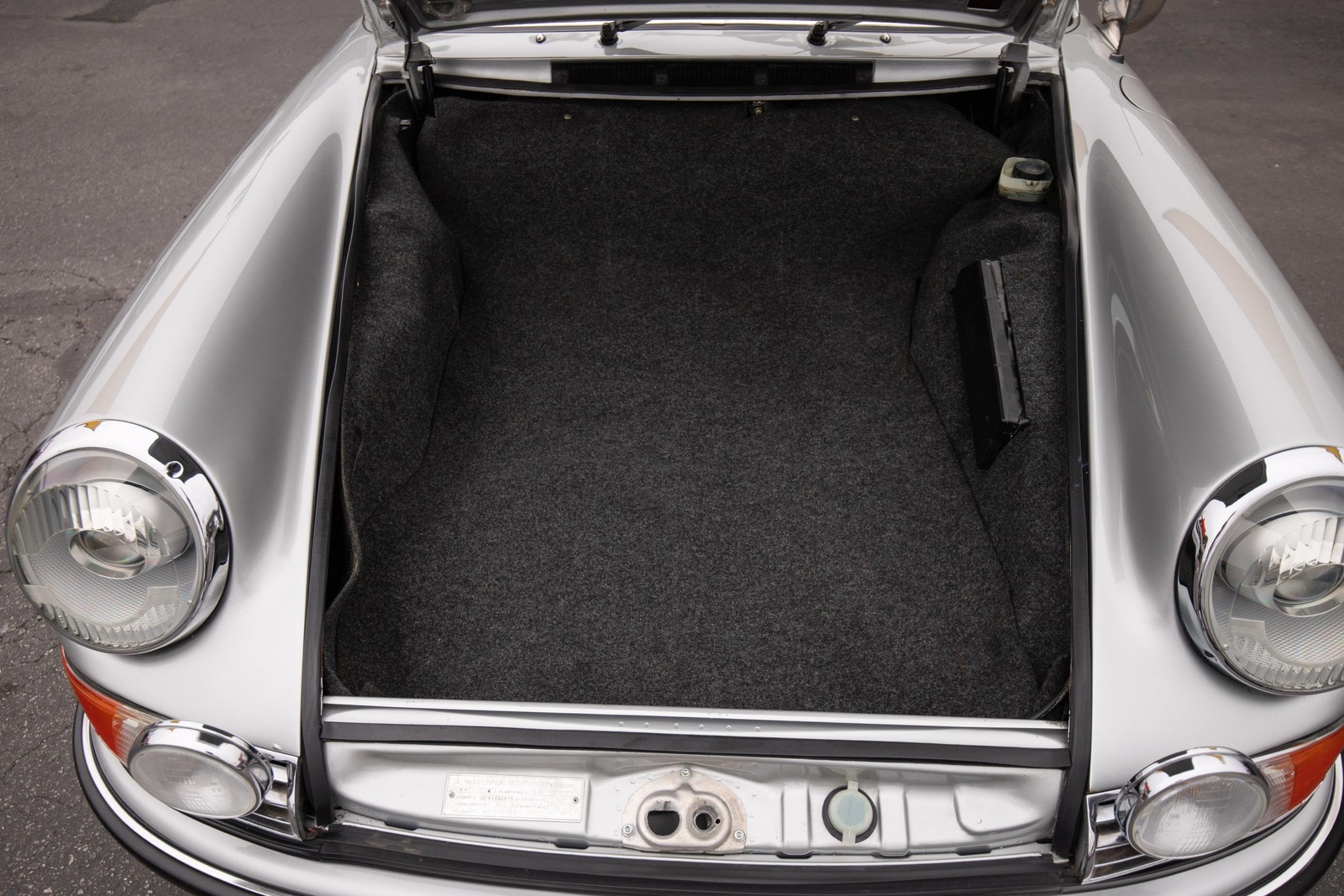 The exterior of this 911 is very nice and in a high-level driver condition. The silver paint looks good with no major flaws. There are a few very minor chips here and there from normal use. The body gaps are good and the doors fit nicely. The brightwork trim/deco appears to be original and in good shape with no major scratches. The windshield was replaced some time ago with a PPG green tinted glass to match the factory glass. There’s one small chip on the driver's side that’s been professionally repaired. The rest of the glass is original factory light green tinted and in good shape. The proper factory stampings are visible. There are some plugs in the door thresholds where Ziebart protective sealant was installed when the car was new. The driver door mirror (1969-1971) is a reproduction that vibrates and is not correct for an RS look. The antenna doesn’t go all the way down, but it works. The LED headlights and through-the-grill fog lights all work. The factory Fuchs (7’s and 8’s by 15) are in excellent shape with the correct anodized finish. There are no signs of major curb rash and they are wearing Pirelli CN36 tires with about half-life or more remaining. They were installed in 2019 after the flares were done. It’s typical for these tires to have different date stamps as Pirelli makes them in small batches. The brake pads have more than half-life remaining and no lips on the cross-drilled rotors.