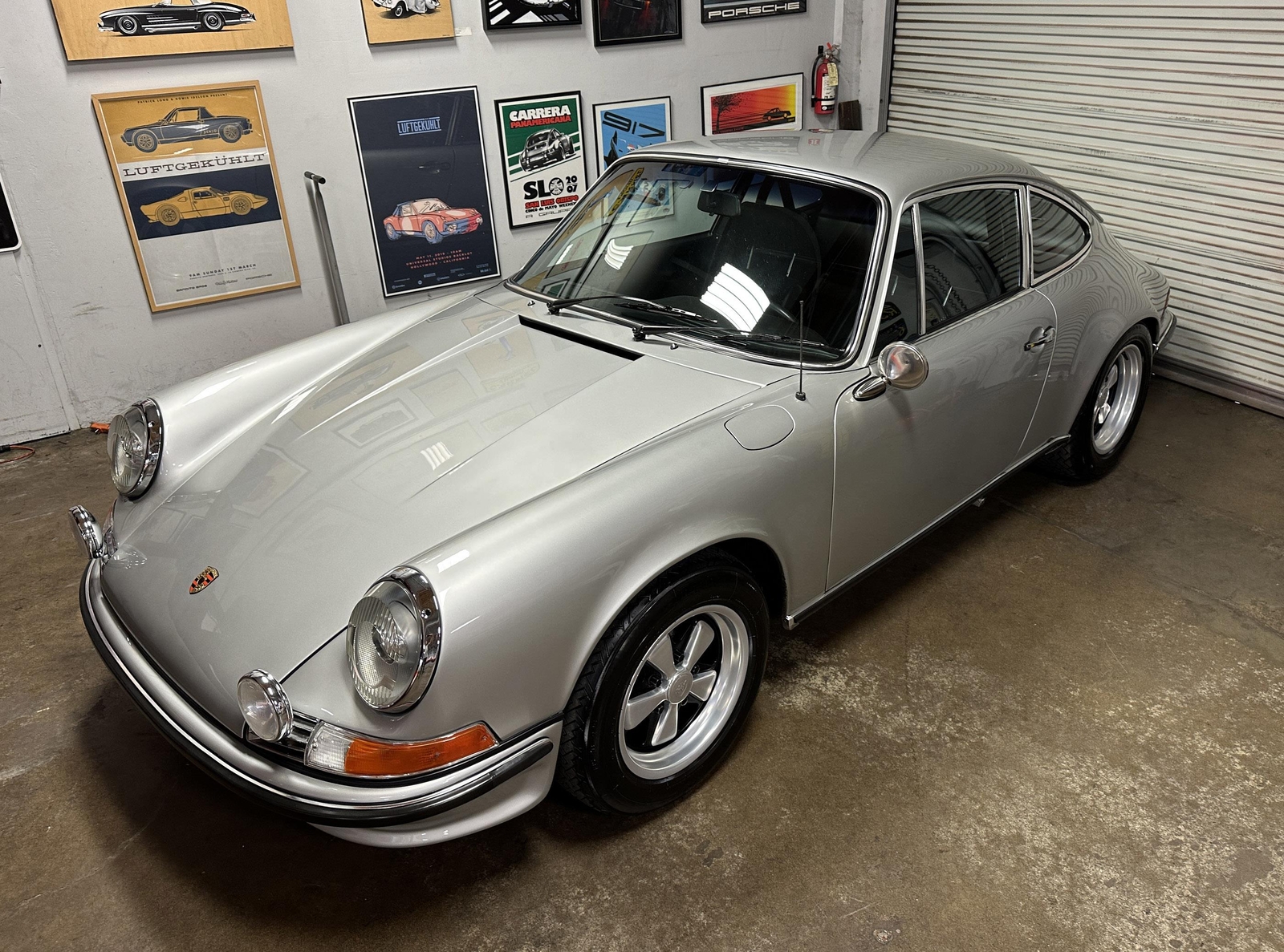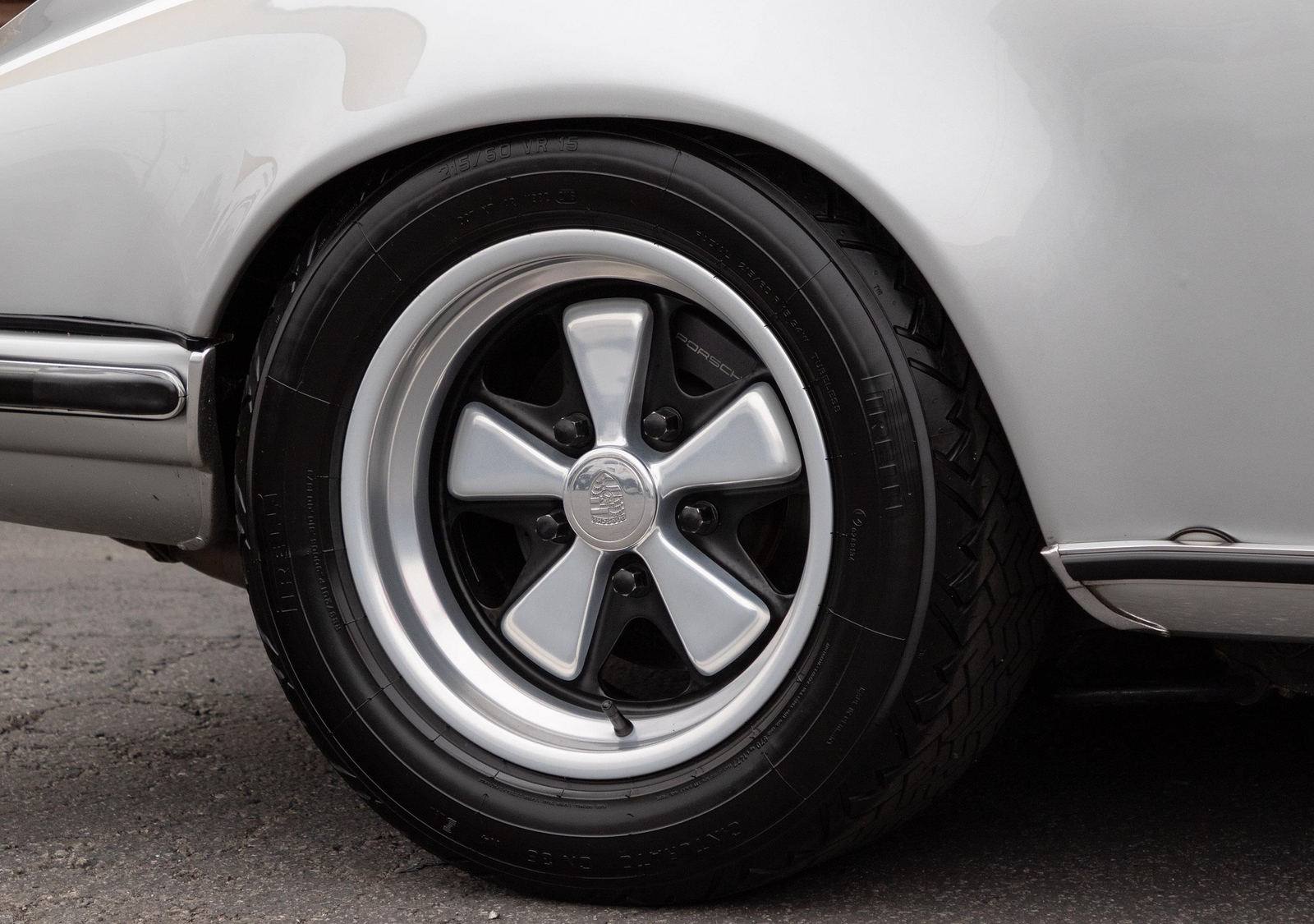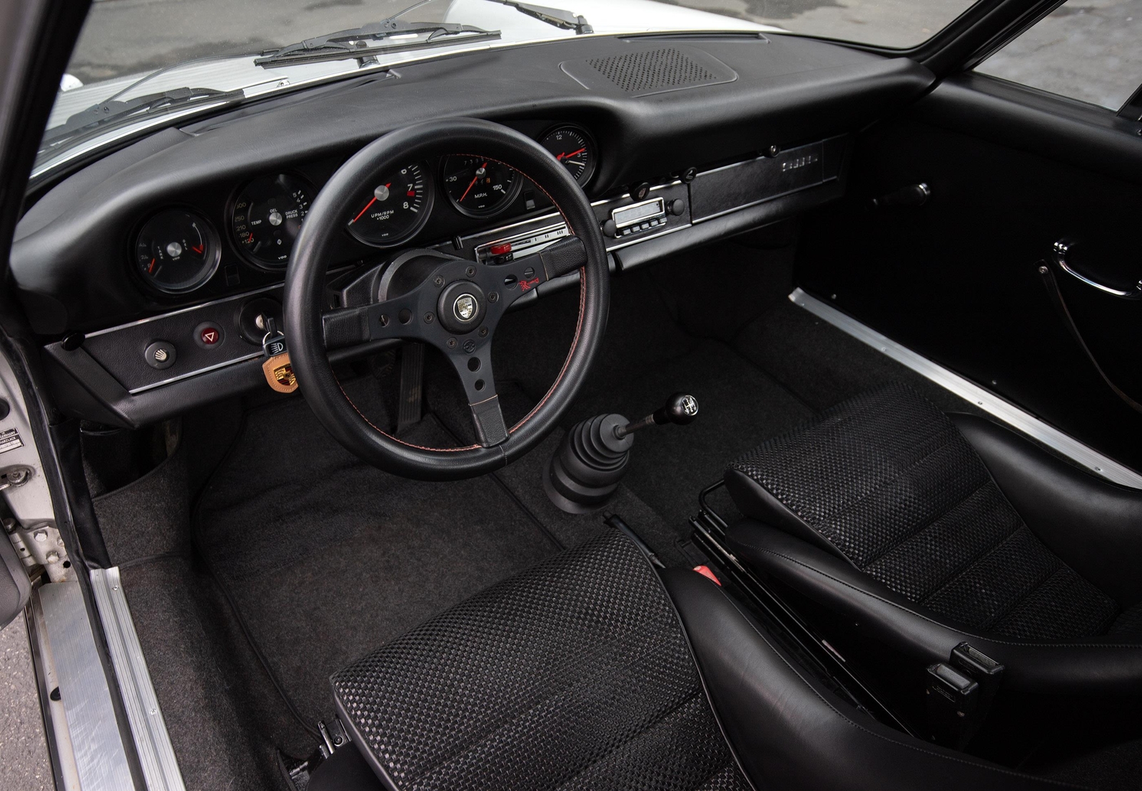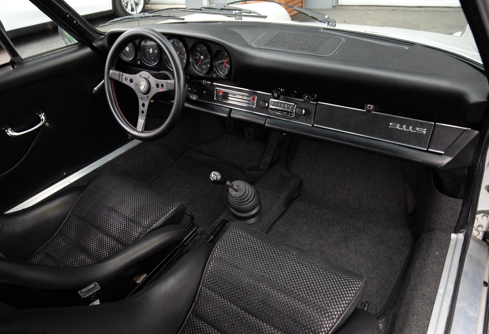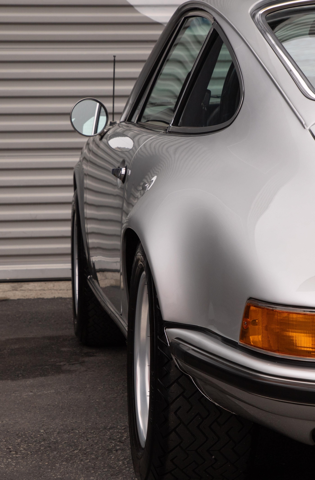 The exterior of this 911 is very nice and in a high-level driver condition. The silver paint looks good with no major flaws. There are a few very minor chips here and there from normal use. The body gaps are good and the doors fit nicely. The brightwork trim/deco appears to be original and in good shape with no major scratches. The windshield was replaced some time ago with a PPG green tinted glass to match the factory glass. There’s one small chip on the driver's side that’s been professionally repaired. The rest of the glass is original factory light green tinted and in good shape. The proper factory stampings are visible. There are some plugs in the door thresholds where Ziebart protective sealant was installed when the car was new. The driver door mirror (1969-1971) is a reproduction that vibrates and is not correct for an RS look. The antenna doesn’t go all the way down, but it works. The LED headlights and through-the-grill fog lights all work. The factory Fuchs (7’s and 8’s by 15) are in excellent shape with the correct anodized finish. There are no signs of major curb rash and they are wearing Pirelli CN36 tires with about half-life or more remaining. They were installed in 2019 after the flares were done. It’s typical for these tires to have different date stamps as Pirelli makes them in small batches. The brake pads have more than half-life remaining and no lips on the cross-drilled rotors.