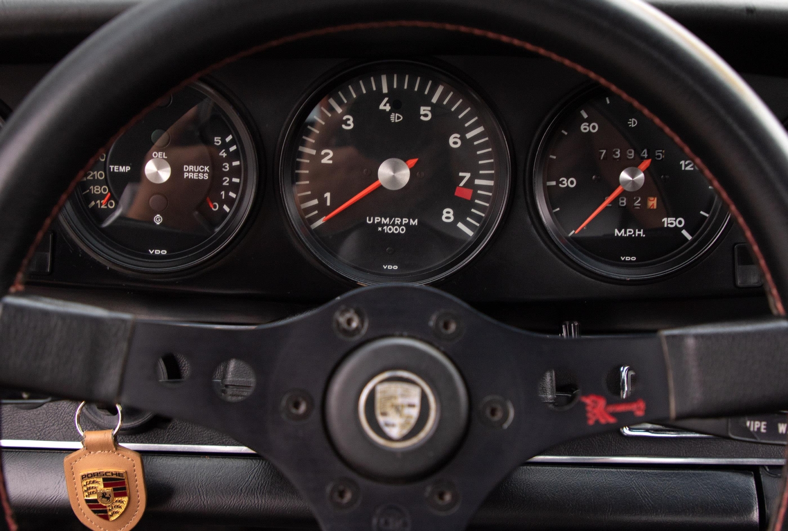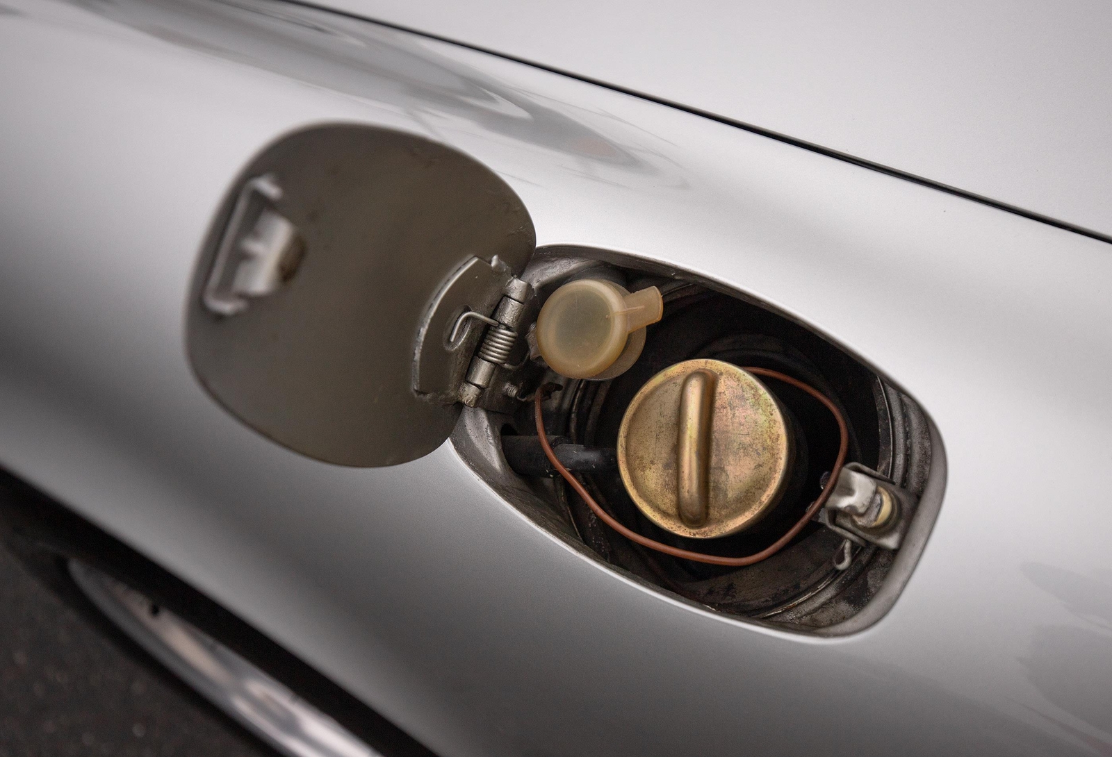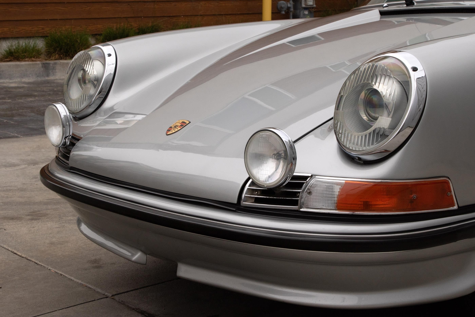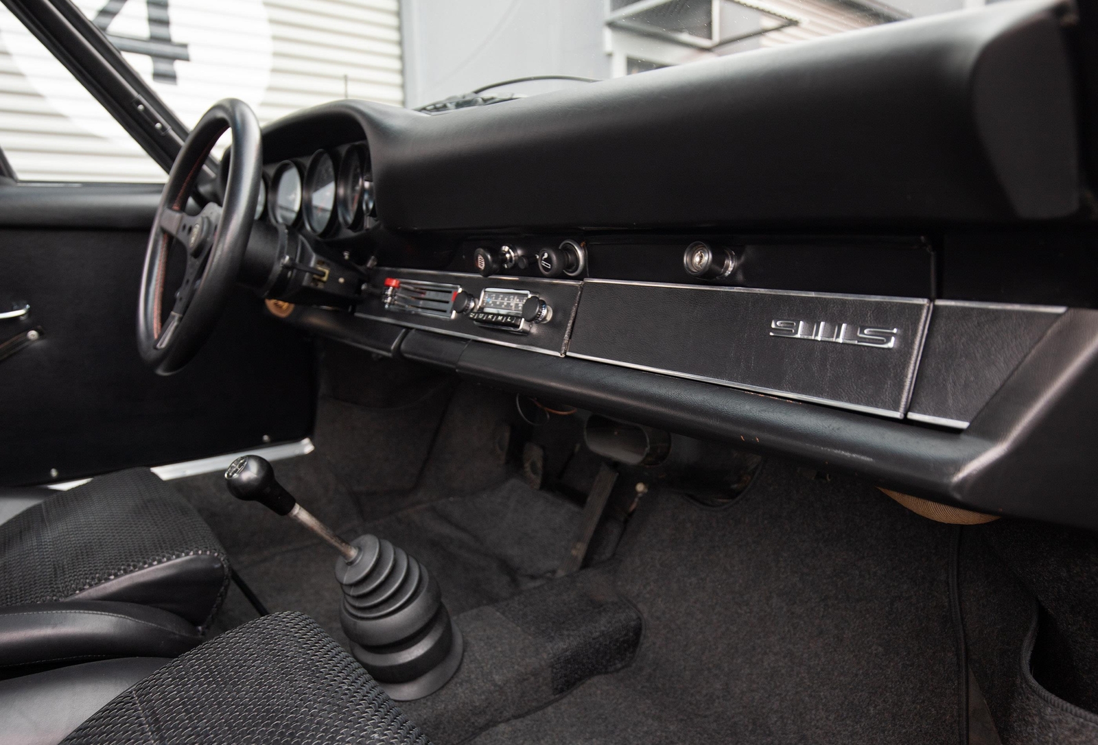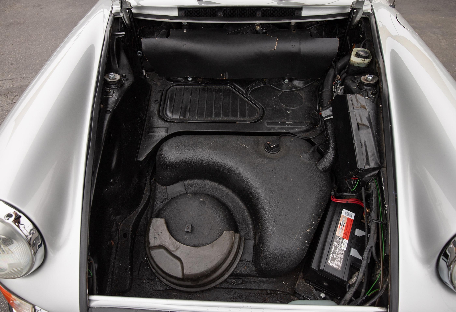 The exterior of this 911 is very nice and in a high-level driver condition. The silver paint looks good with no major flaws. There are a few very minor chips here and there from normal use. The body gaps are good and the doors fit nicely. The brightwork trim/deco appears to be original and in good shape with no major scratches. The windshield was replaced some time ago with a PPG green tinted glass to match the factory glass. There’s one small chip on the driver's side that’s been professionally repaired. The rest of the glass is original factory light green tinted and in good shape. The proper factory stampings are visible. There are some plugs in the door thresholds where Ziebart protective sealant was installed when the car was new. The driver door mirror (1969-1971) is a reproduction that vibrates and is not correct for an RS look. The antenna doesn’t go all the way down, but it works. The LED headlights and through-the-grill fog lights all work. The factory Fuchs (7’s and 8’s by 15) are in excellent shape with the correct anodized finish. There are no signs of major curb rash and they are wearing Pirelli CN36 tires with about half-life or more remaining. They were installed in 2019 after the flares were done. It’s typical for these tires to have different date stamps as Pirelli makes them in small batches. The brake pads have more than half-life remaining and no lips on the cross-drilled rotors.