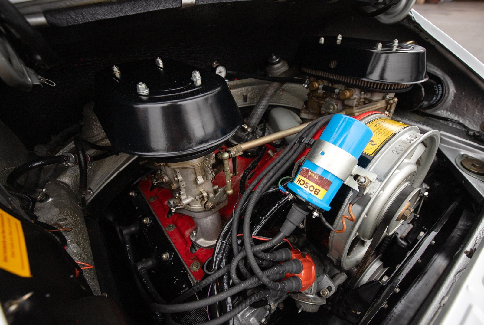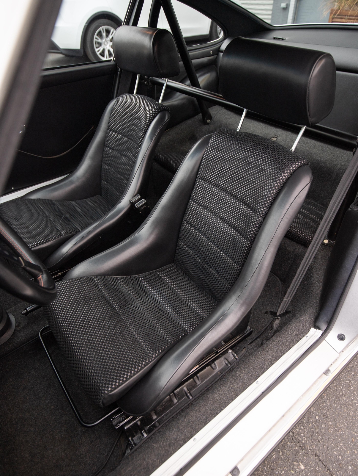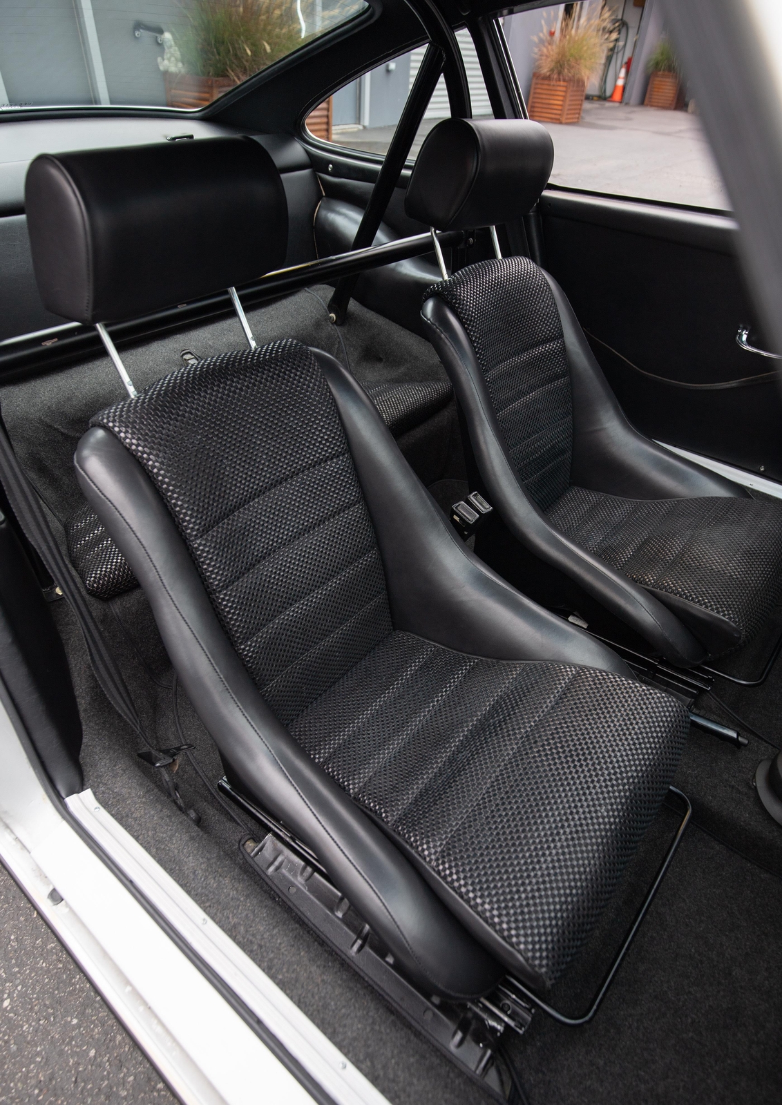 The interior is very tidy and smells of leather. The Vintage Seats were custom-done in high-grade leather with leather and suede basketweave inserts. There are no tears, rips, or other blemishes as well as no exit bolster wear. The rear seat bottom pads match (no rear seat backs). The ST-style roll bar bolts in and can easily be removed. The headliner has no tears, rips, or sagging issues. The sun visors are later after-market examples that fit nicely and are in good shape. The lightweight carpet has no major stains or heavy wear marks. The RS Lightweight door panels function nicely with upgraded chrome door pulls that are sturdy. The dash has no cracks or warping and fits nicely, including the speaker grill. All of the gauges work, including the clock and the interior lights. The Blaupunkt radio with a dash speaker works as well. The steering wheel is a vintage leather-wrapped Raid Racemark steering wheel that feels great and has a nice, aged look and feel.