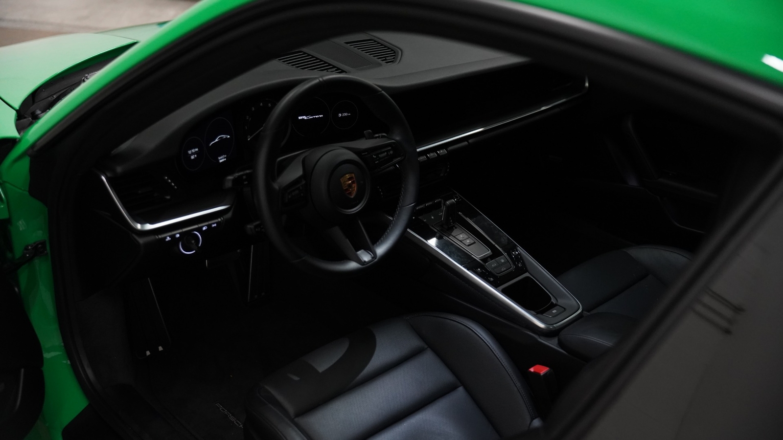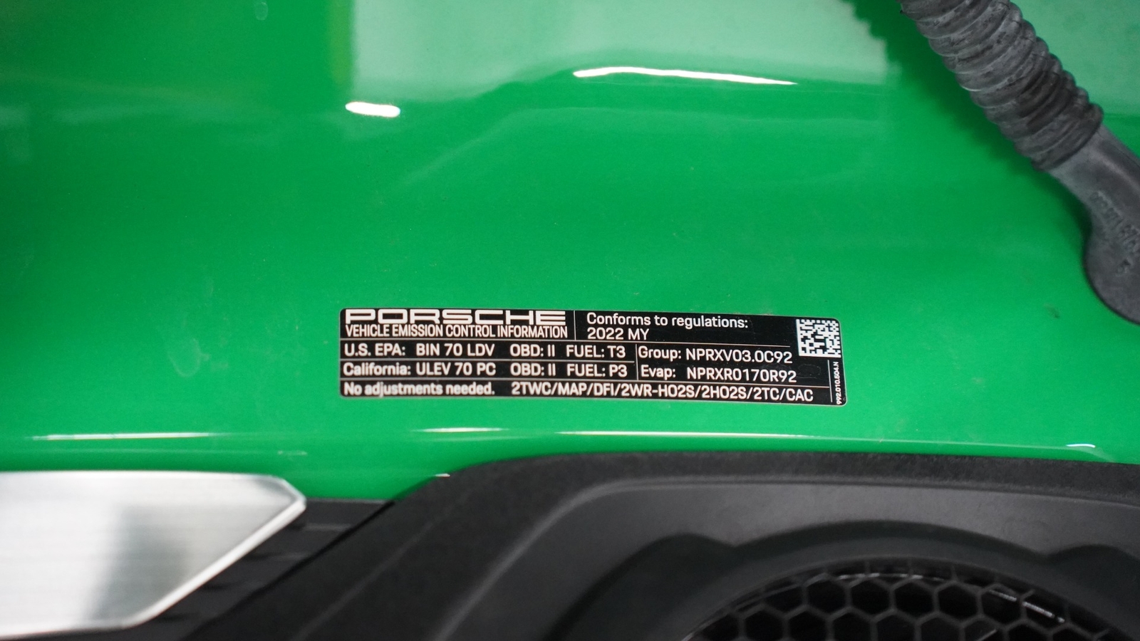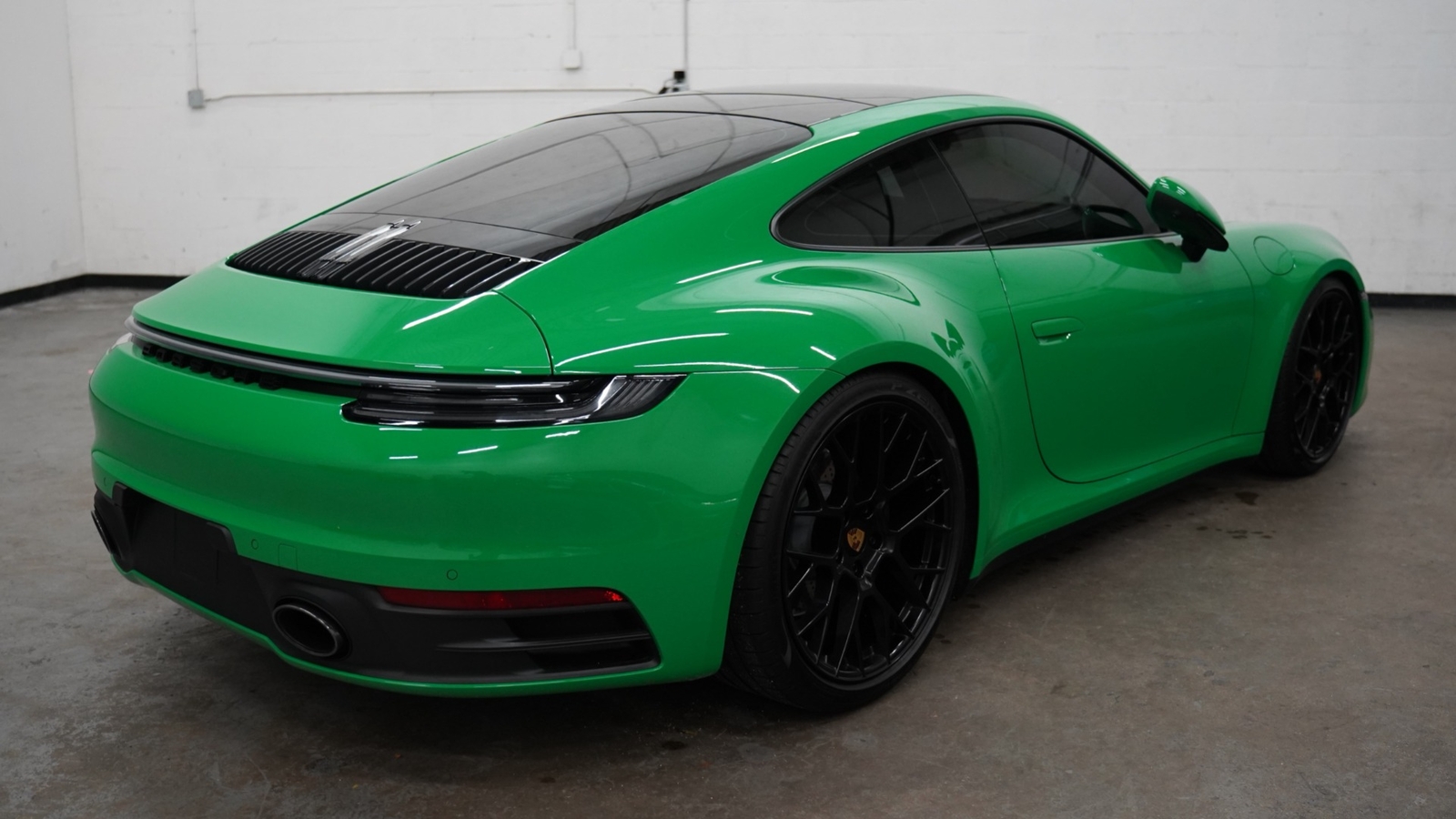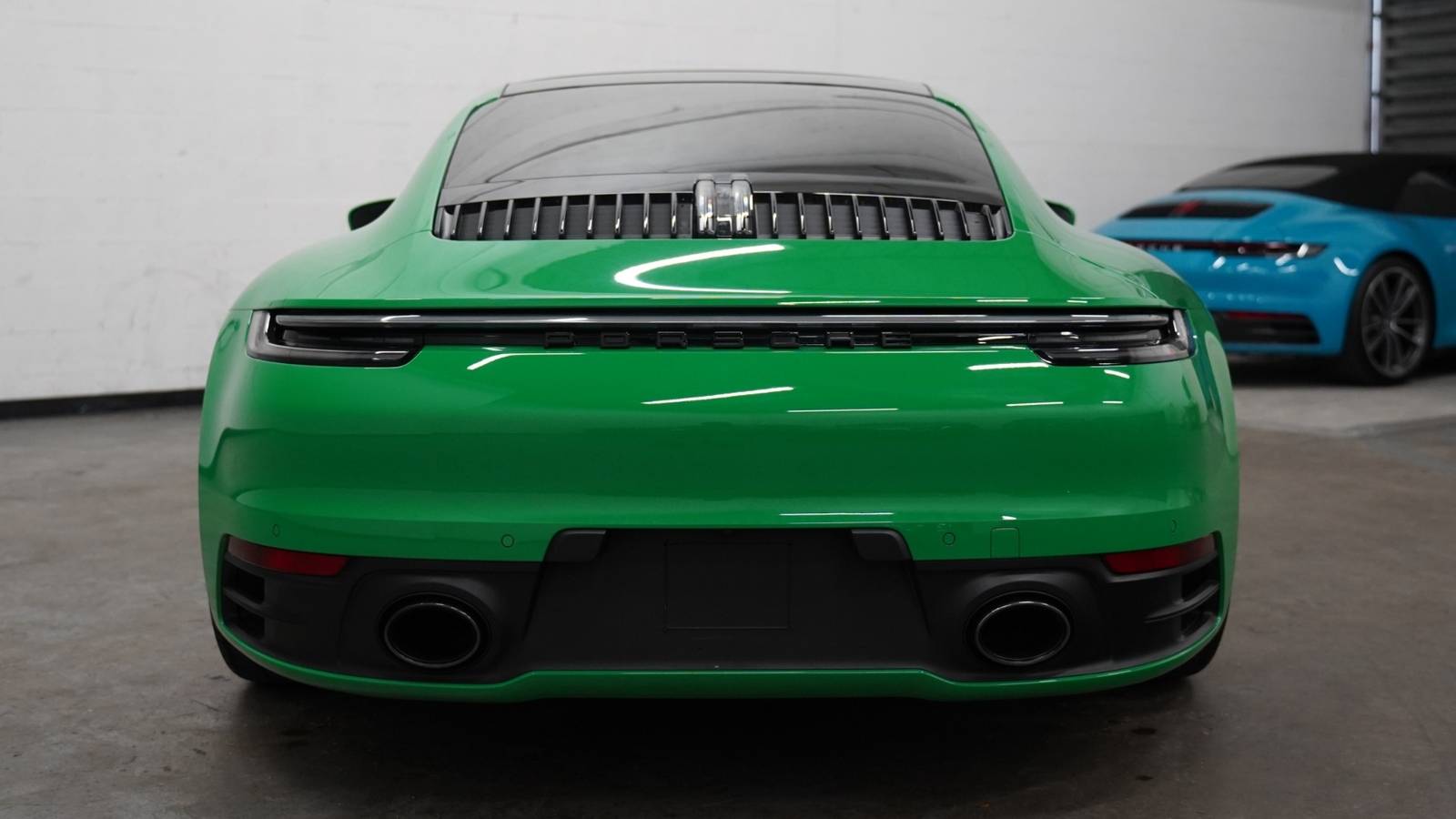 Python Green 2022 Porsche 911 Carrera RWD 8-Speed Porsche Doppelkupplung (PDK) 3.0L H6 Turbocharged DOHC 24V LEV3-ULEV70 379hp 23.7 Gal. Extended Range Fuel Tank, 4-Way Sport Seats Plus, 8 Speakers, Adaptive suspension, Ambient Lighting, Automatic temperature control, BOSE Surround Sound System, Brake assist, Deletion of Model Designation on Rear, Electric Slide/Tilt Sunroof in Glass, Exclusive Design Taillights, Exterior Parking Camera Rear, Front dual zone A/C, Fully automatic headlights, GT Sport Steering Wheel, Heated front seats, Interior Trim Inlays in Leather, Lane Change Assist (LCA), Navigation system: Porsche Communication Management (PCM), PDK Gear Selector in Aluminum, Porsche Communication Management, Porsche Crest on Front Headrests, Porsche Dynamic Light System Plus (PDLS+), Porsche Logo on Rear in High Gloss Black, Power Folding Exterior Mirrors, Premium Package, Rain sensing wipers, Remote keyless entry, Sport Exhaust System, Steering wheel mounted audio controls, Storage Package, Surround View, Ventilated Front Seats, Wheels Painted in Satin Black, Wheels: 20" Front/21" Rear RS Spyder Design.