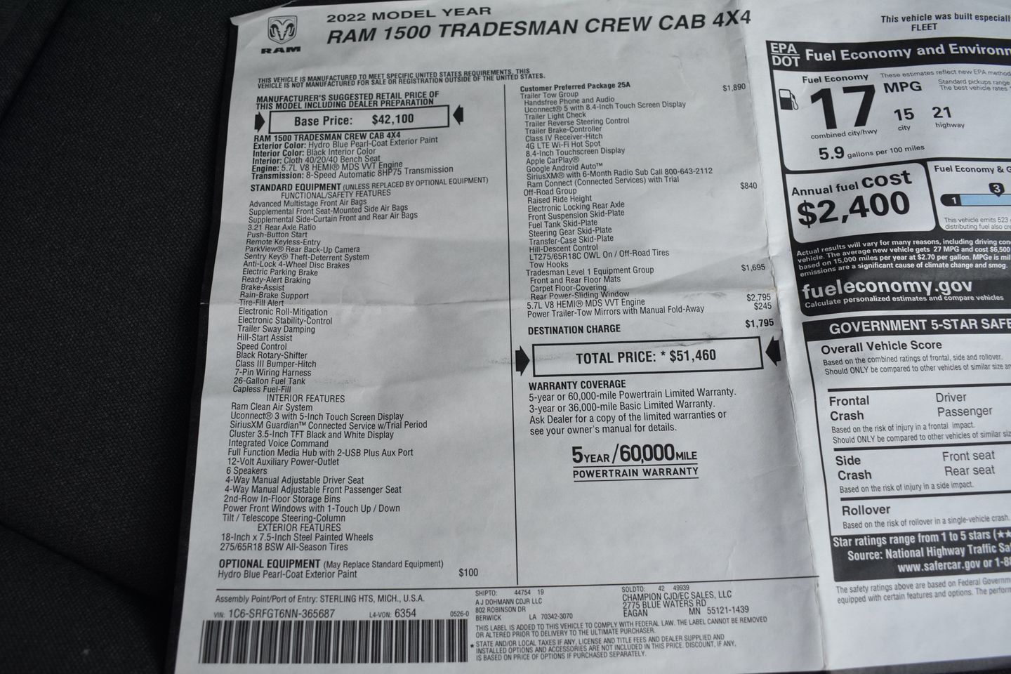 You are looking at a 2022 Dodge Ram 1500 Crew Cab Warlock 4x4. It is powered with a 5.7L HEMI V-8 and automatic transmission. It is equipped with power mirrors, power windows, power locks, tilt, cruise, am/fm radio, receiver hitch, and spray in bed liner. Also included are the owner's manuals and one keyless remote.