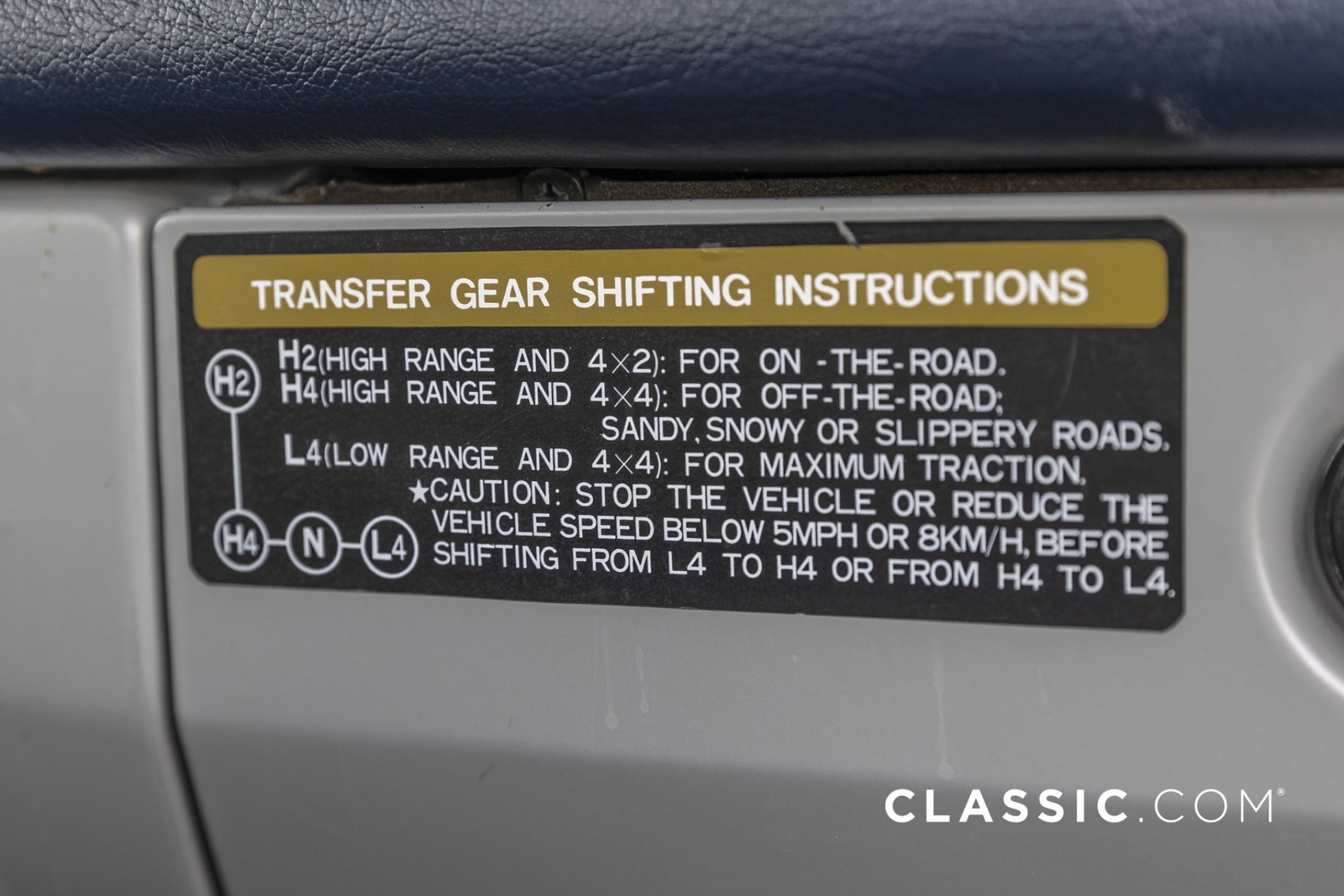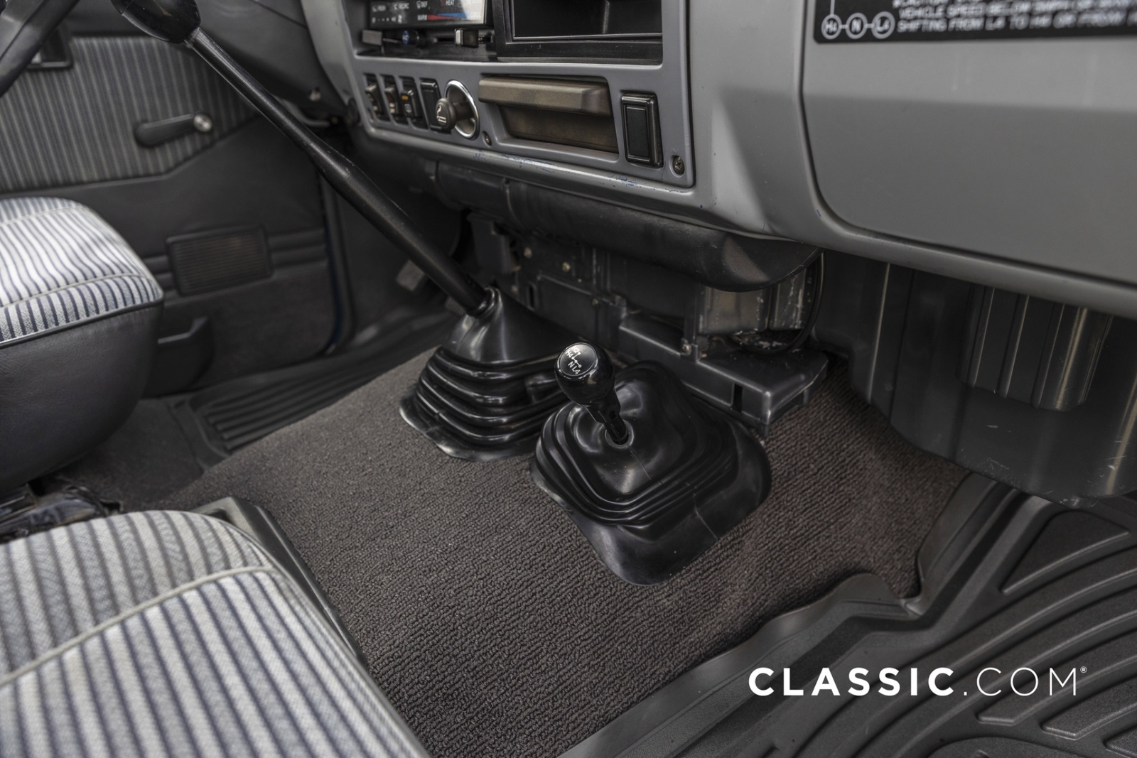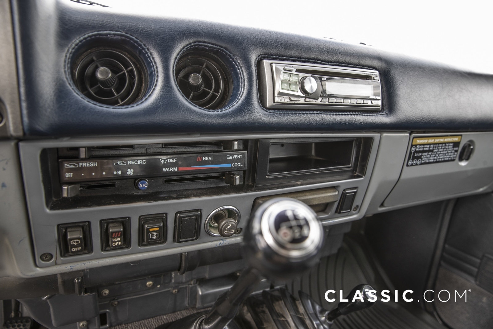 Features include part-time 4WD, rear defroster, folding rear seat, and air conditioning. It remains unmodified with the exception of an Alpine stereo unit and a set of aftermarket wheels.
