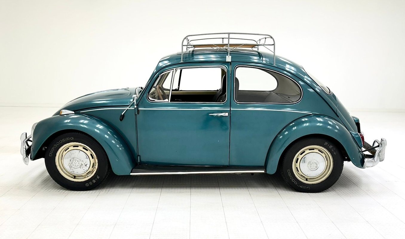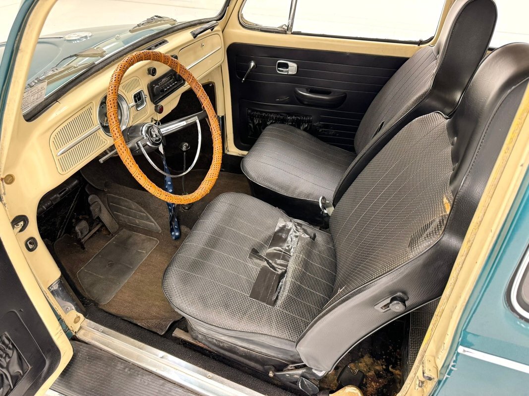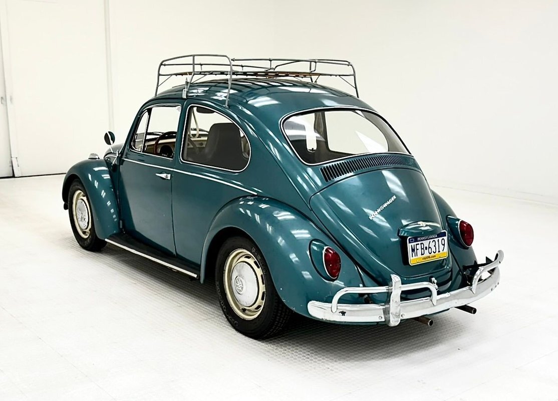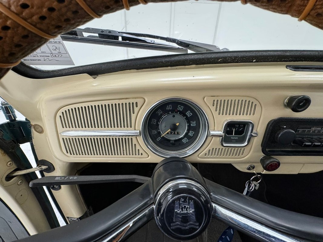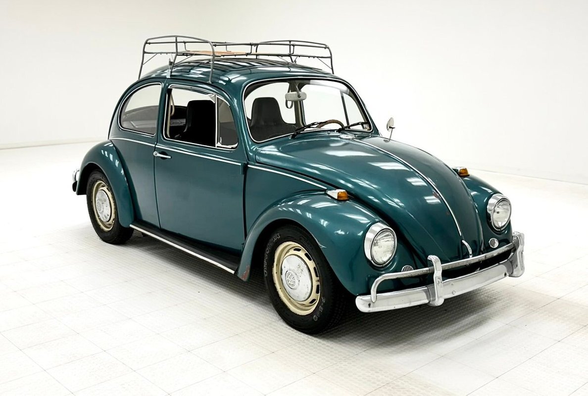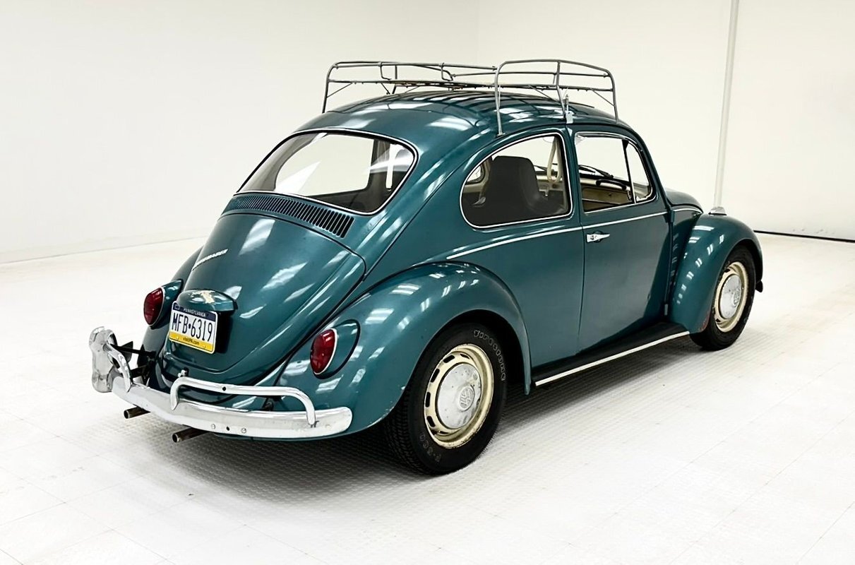 Bathed in Java Green, the classically cute shape of the Beetle makes people smile nearly 60 years later. Round fenders flanking the arching hood, domed roof, and sloping rear coupled with straight, wide doors create a look that invites you in. The roof rack not only provides more storage room, but looks cool and adds a sense of adventure to the bug. The external door handles were new for '67 but may have appeared on some late '66 models as well. The "towel bars" on the bumpers were unique to 1967 and are a desirable feature. We note the reverse lights, which would have been new for '67 and attached to the rear bumper, are missing on this car as is one bumperette. In front, the distance of the horn vents to the black seam bodes well for the originality of the fenders and the deck lid was a one year feature with subtle differences from other years. 15-inch painted wheels with VW hubcaps are in restorable condition. The body carries paint imperfections including chipped paint, bubbling, areas of rust especially around hinges, former body repairs, and various other scratches and scrapes.