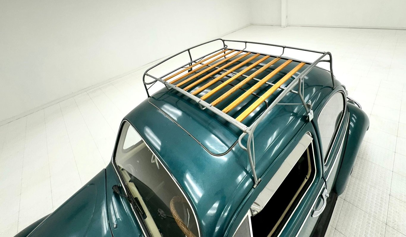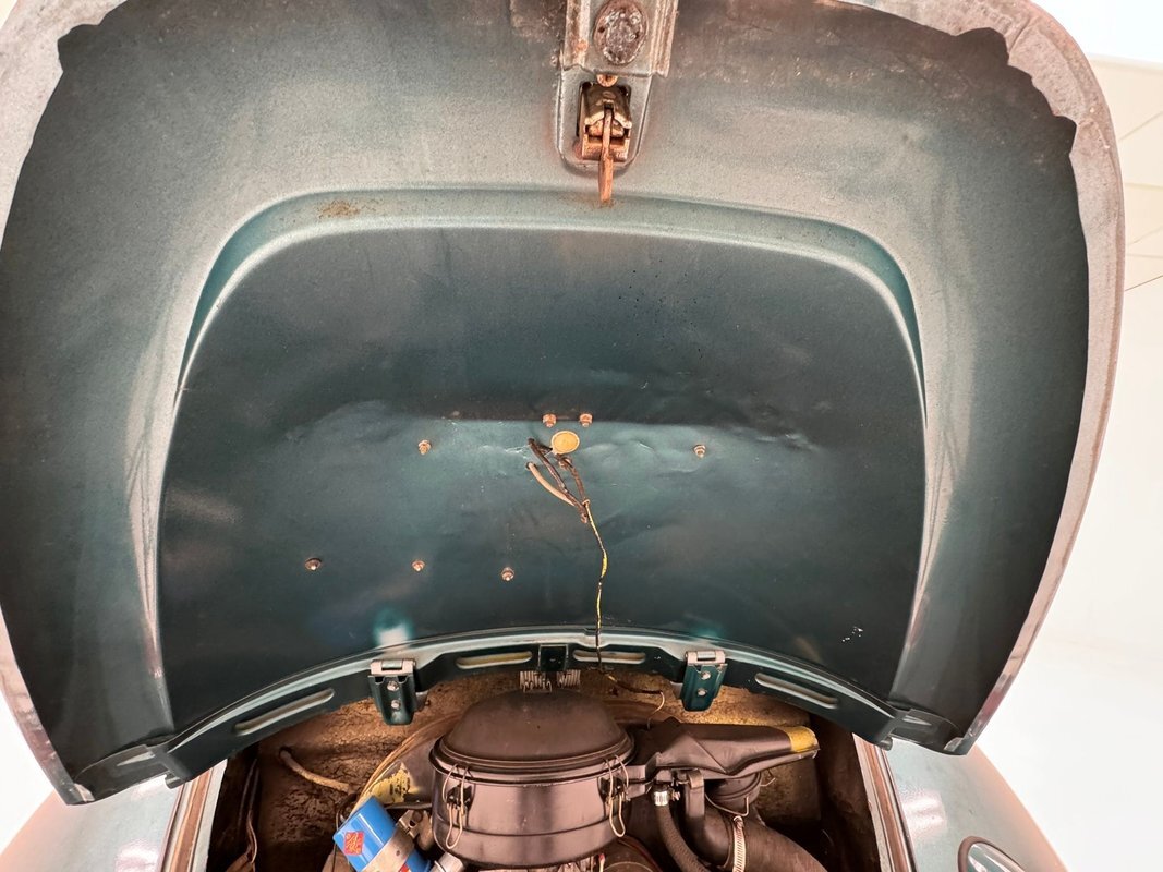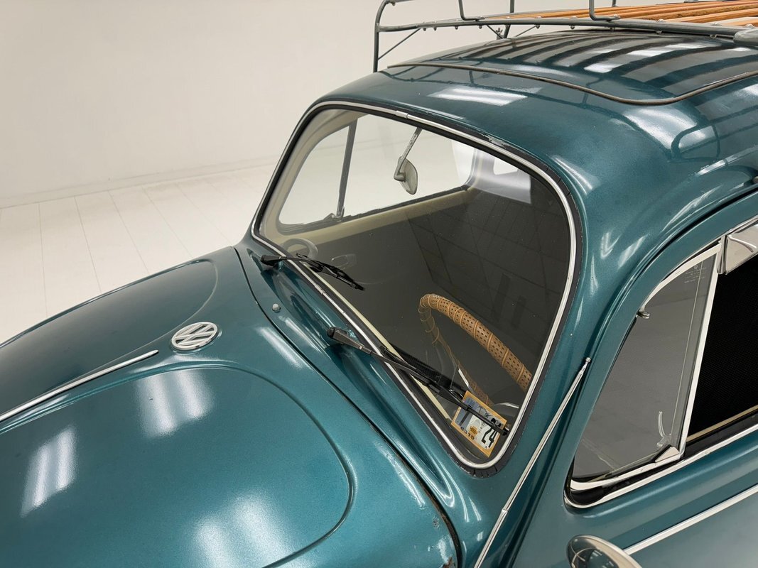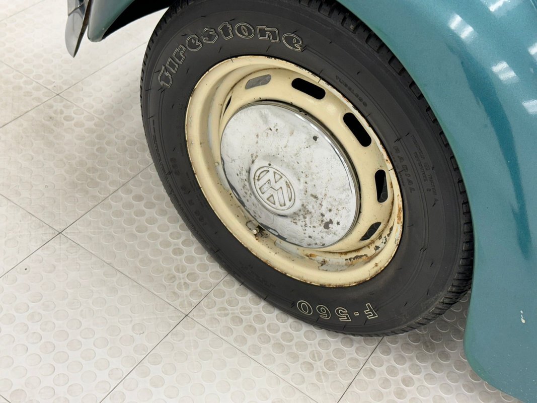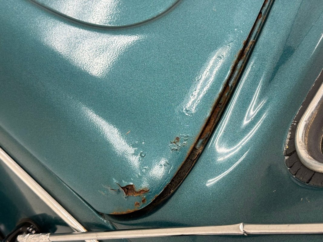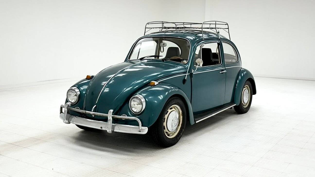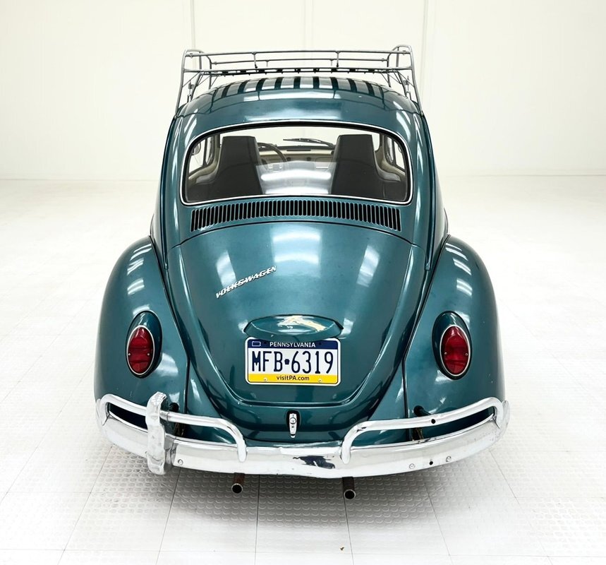Bathed in Java Green, the classically cute shape of the Beetle makes people smile nearly 60 years later. Round fenders flanking the arching hood, domed roof, and sloping rear coupled with straight, wide doors create a look that invites you in. The roof rack not only provides more storage room, but looks cool and adds a sense of adventure to the bug. The external door handles were new for '67 but may have appeared on some late '66 models as well. The "towel bars" on the bumpers were unique to 1967 and are a desirable feature. We note the reverse lights, which would have been new for '67 and attached to the rear bumper, are missing on this car as is one bumperette. In front, the distance of the horn vents to the black seam bodes well for the originality of the fenders and the deck lid was a one year feature with subtle differences from other years. 15-inch painted wheels with VW hubcaps are in restorable condition. The body carries paint imperfections including chipped paint, bubbling, areas of rust especially around hinges, former body repairs, and various other scratches and scrapes.