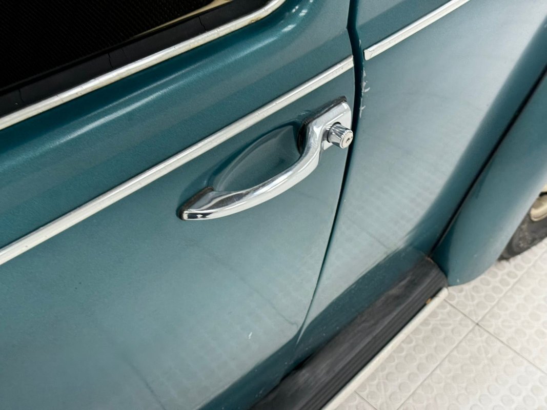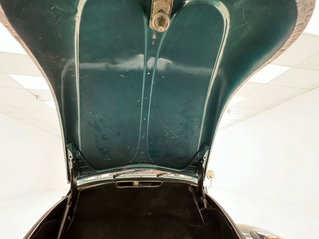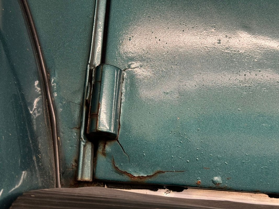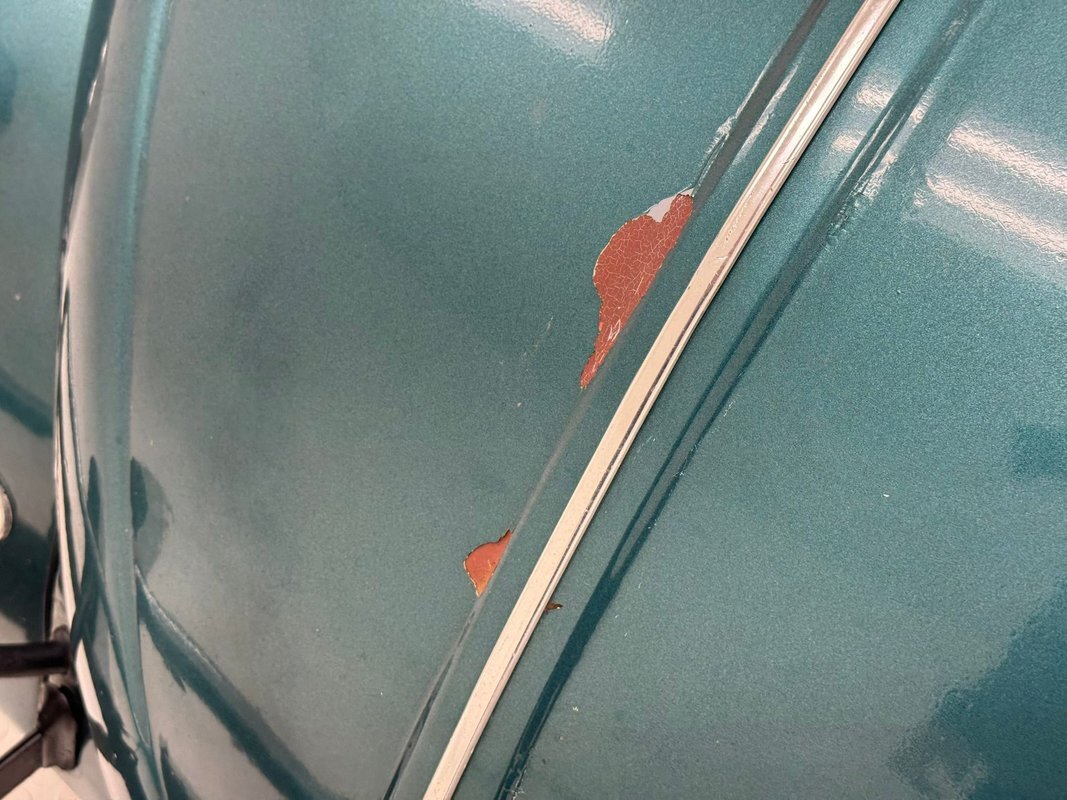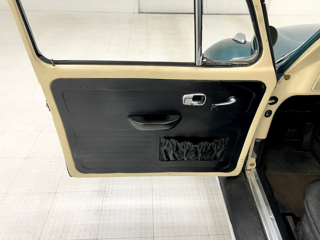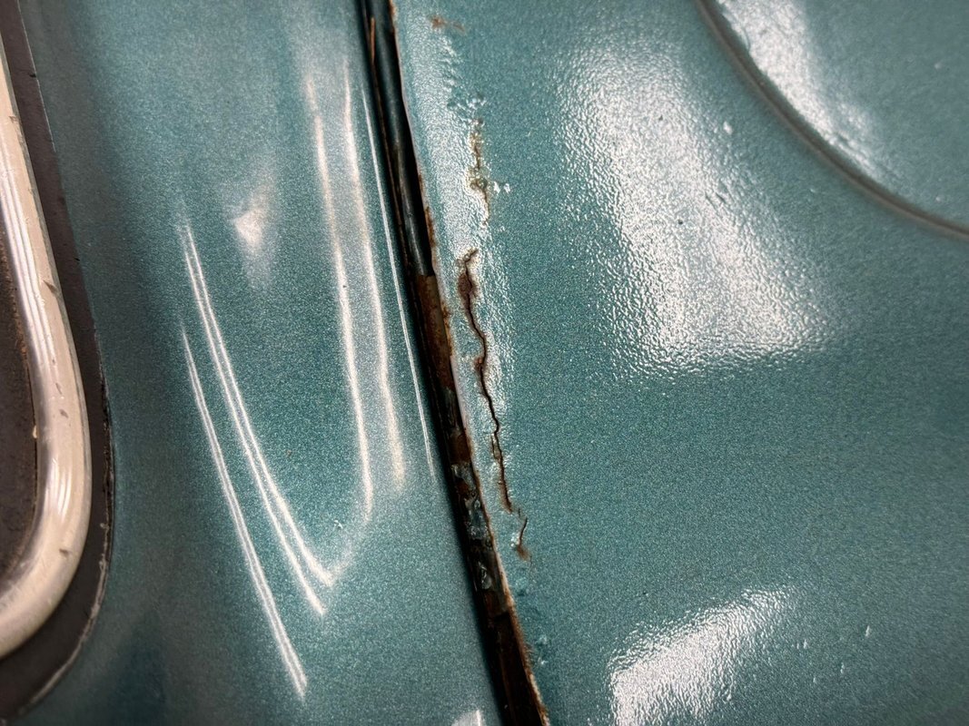 Bathed in Java Green, the classically cute shape of the Beetle makes people smile nearly 60 years later. Round fenders flanking the arching hood, domed roof, and sloping rear coupled with straight, wide doors create a look that invites you in. The roof rack not only provides more storage room, but looks cool and adds a sense of adventure to the bug. The external door handles were new for '67 but may have appeared on some late '66 models as well. The "towel bars" on the bumpers were unique to 1967 and are a desirable feature. We note the reverse lights, which would have been new for '67 and attached to the rear bumper, are missing on this car as is one bumperette. In front, the distance of the horn vents to the black seam bodes well for the originality of the fenders and the deck lid was a one year feature with subtle differences from other years. 15-inch painted wheels with VW hubcaps are in restorable condition. The body carries paint imperfections including chipped paint, bubbling, areas of rust especially around hinges, former body repairs, and various other scratches and scrapes.