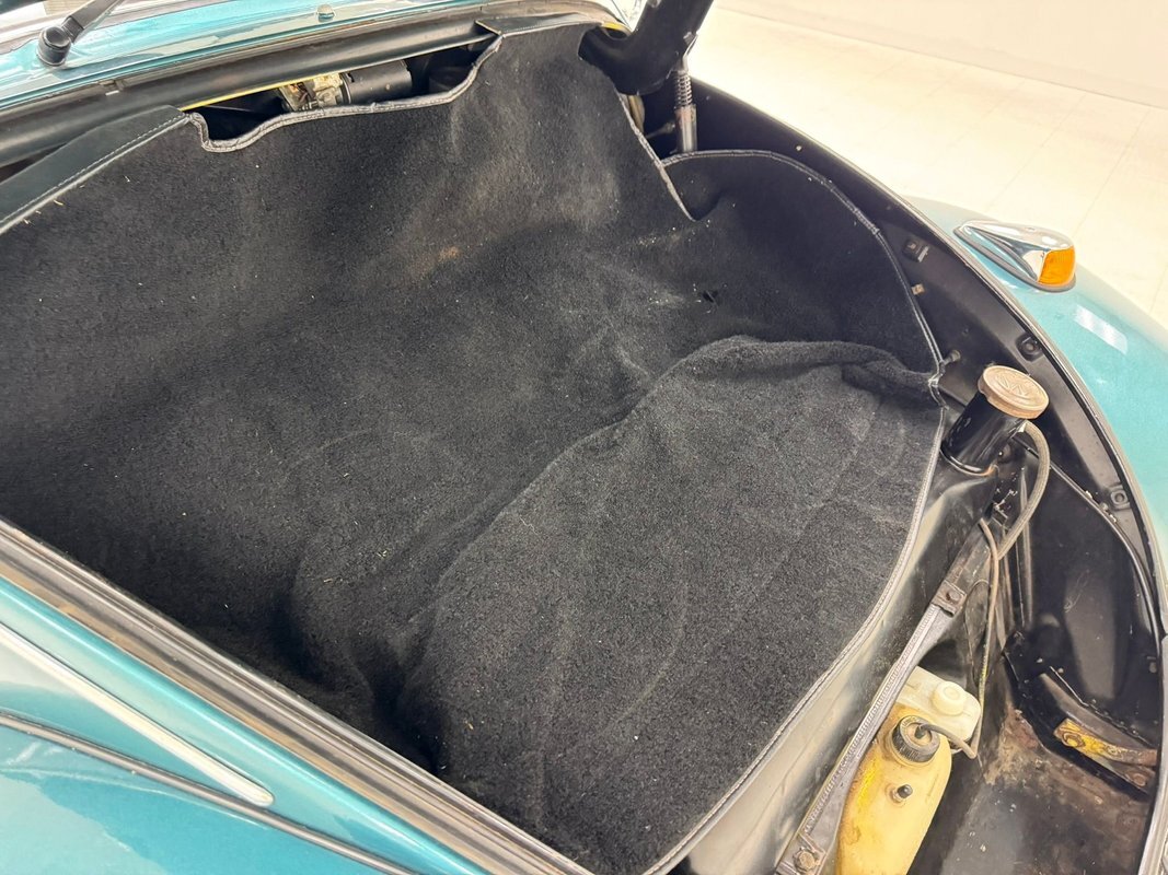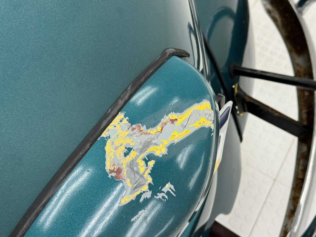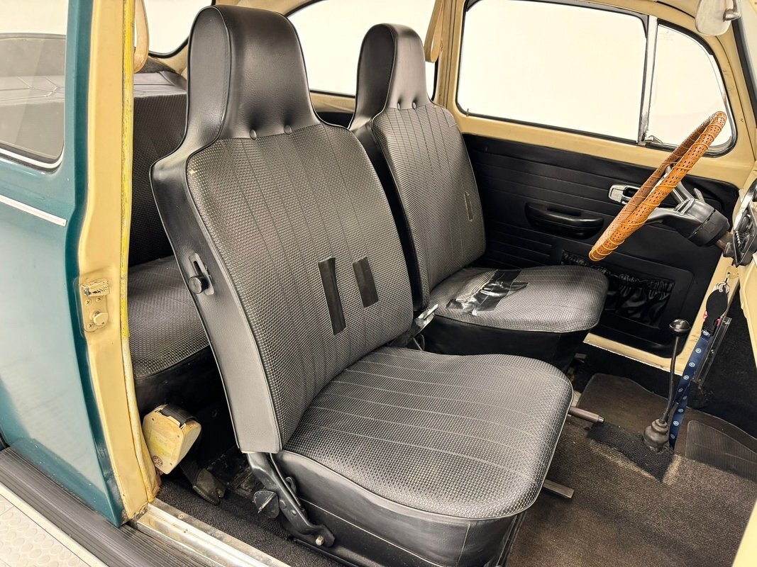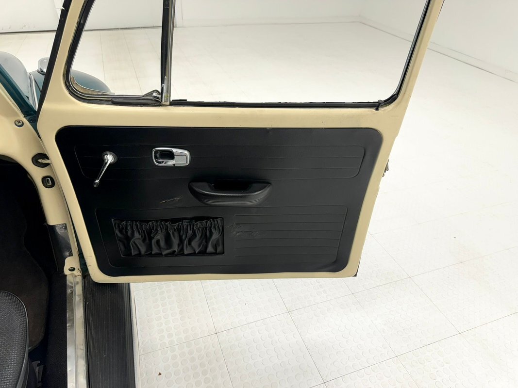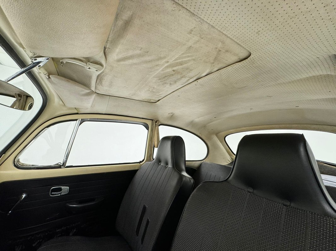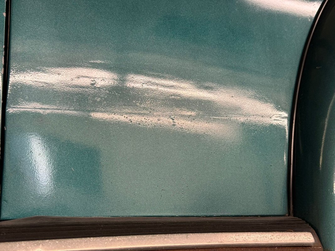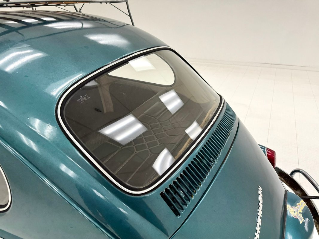 Bathed in Java Green, the classically cute shape of the Beetle makes people smile nearly 60 years later. Round fenders flanking the arching hood, domed roof, and sloping rear coupled with straight, wide doors create a look that invites you in. The roof rack not only provides more storage room, but looks cool and adds a sense of adventure to the bug. The external door handles were new for '67 but may have appeared on some late '66 models as well. The "towel bars" on the bumpers were unique to 1967 and are a desirable feature. We note the reverse lights, which would have been new for '67 and attached to the rear bumper, are missing on this car as is one bumperette. In front, the distance of the horn vents to the black seam bodes well for the originality of the fenders and the deck lid was a one year feature with subtle differences from other years. 15-inch painted wheels with VW hubcaps are in restorable condition. The body carries paint imperfections including chipped paint, bubbling, areas of rust especially around hinges, former body repairs, and various other scratches and scrapes.
