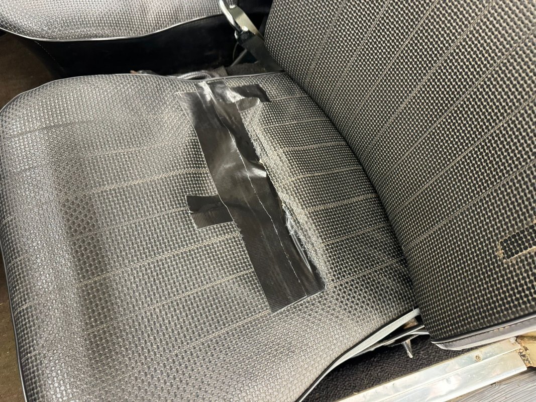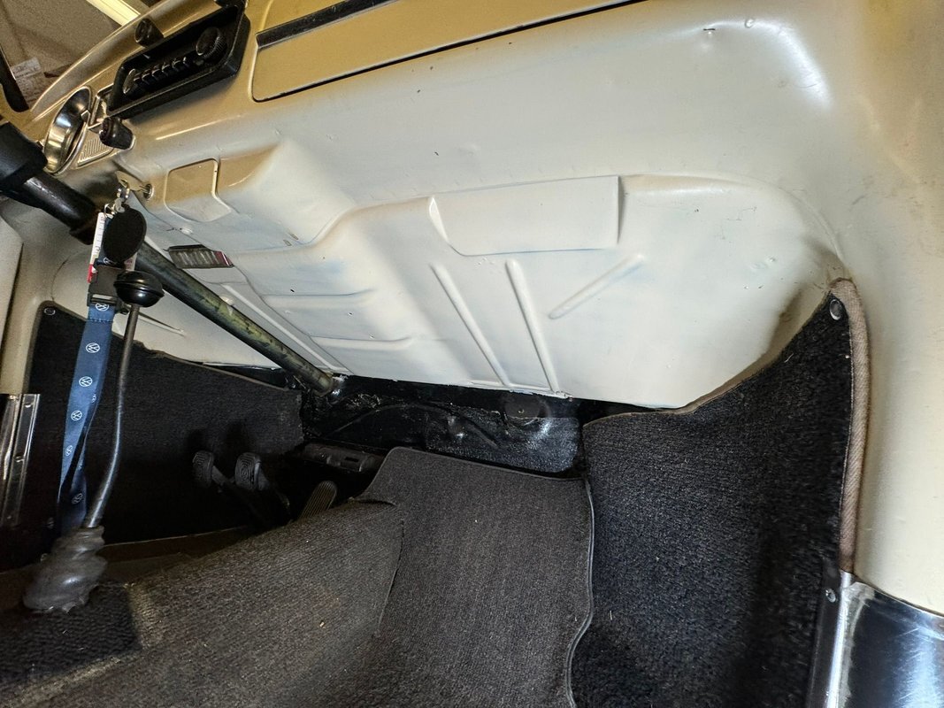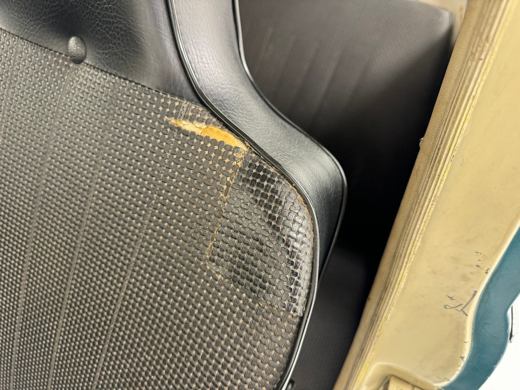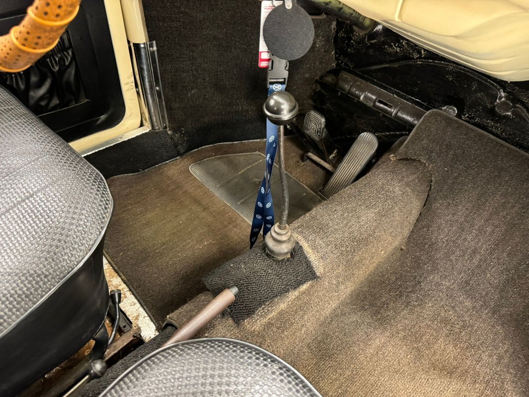 Black vinyl door panels adhere to the interior of the doors. This is where we find the new for 1967 door actuators with the recessed cove. The panels are in good condition with a tear on the passenger side. The high back bucket seats, (from a later year Beetle), show some wear and black tape mends some of the tears in the black vinyl, with other areas needing repair or restoration. Fortunately, the V-dub enthusiast world and aftermarket source base is huge, really huge. The low back rear bench is in good condition. Our steering wheel is wrapped in an aftermarket cover, while the Wolfsburg emblem shines bright in the center of the horn ring. The Lotus white dash is in great shape and houses original gauges and Sapphire AM radio. The floor mounted shifter is surrounded by loop style carpeted mats in brown over black carpet. The headliner, including sunroof cover, is a bit rough and would benefit from restoration.