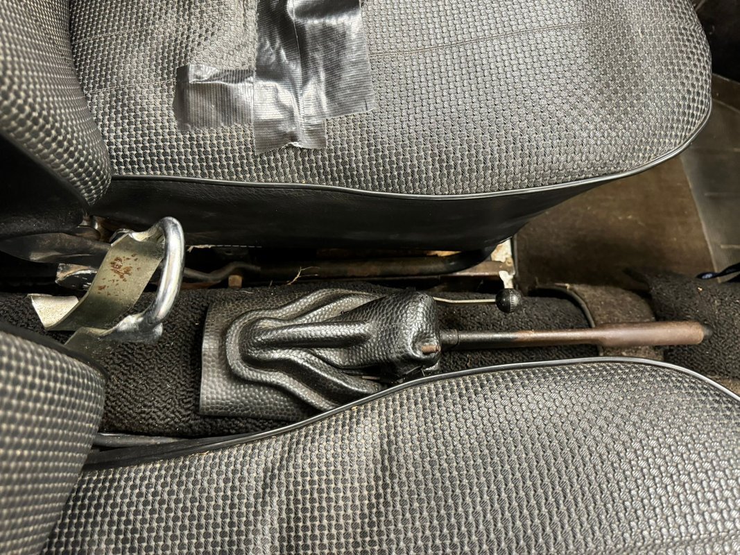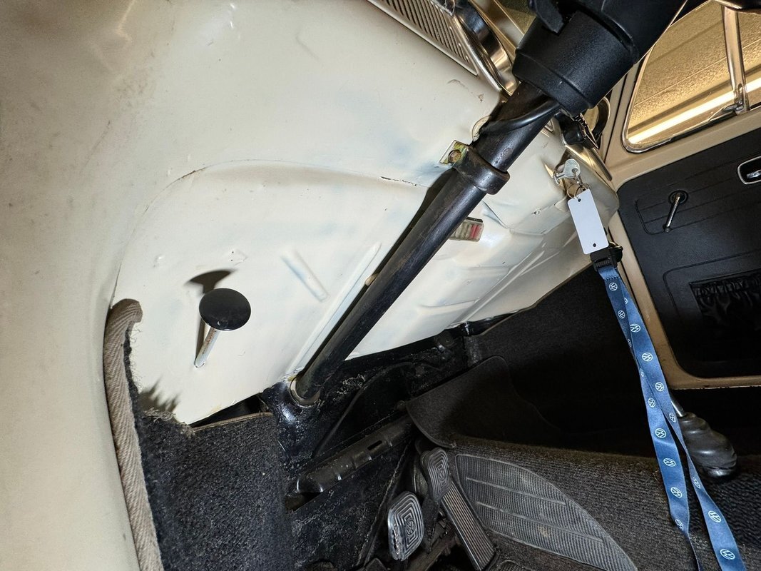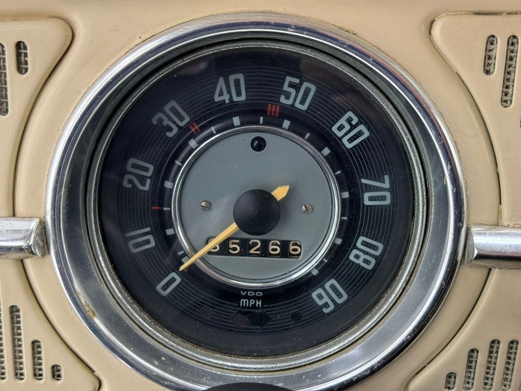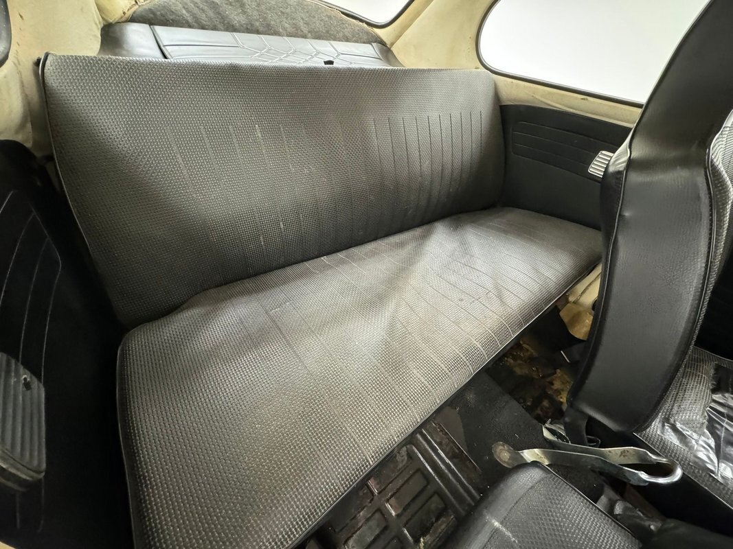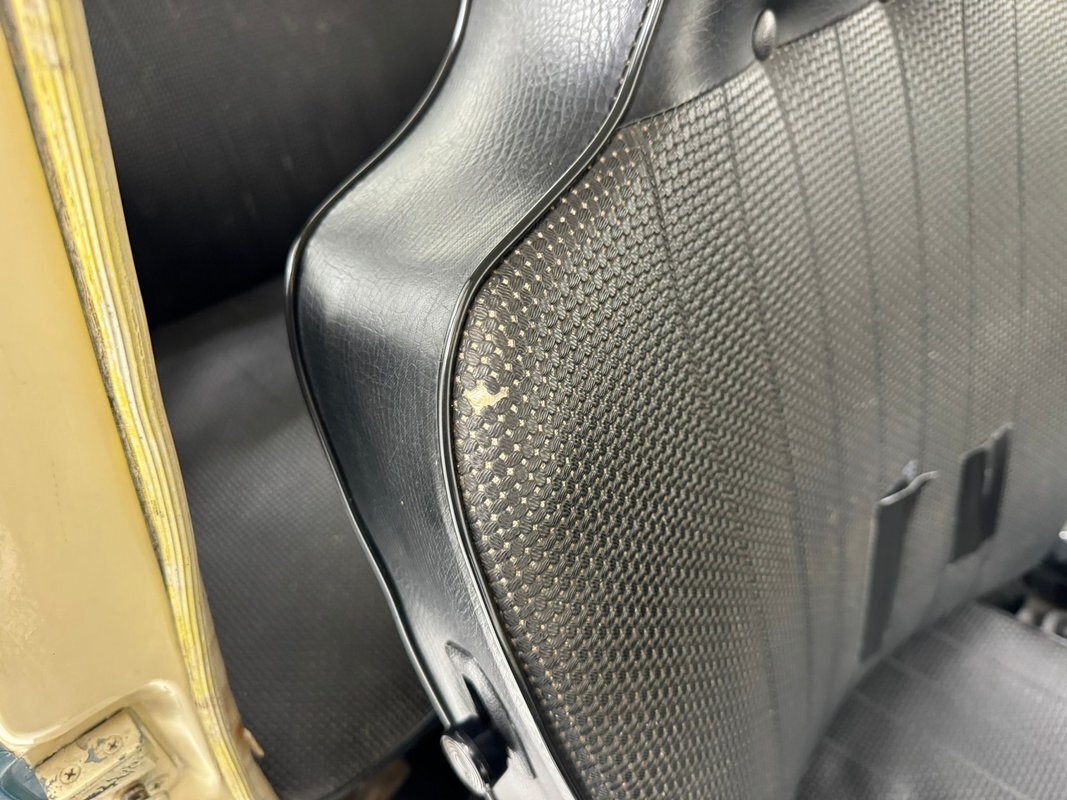 Black vinyl door panels adhere to the interior of the doors. This is where we find the new for 1967 door actuators with the recessed cove. The panels are in good condition with a tear on the passenger side. The high back bucket seats, (from a later year Beetle), show some wear and black tape mends some of the tears in the black vinyl, with other areas needing repair or restoration. Fortunately, the V-dub enthusiast world and aftermarket source base is huge, really huge. The low back rear bench is in good condition. Our steering wheel is wrapped in an aftermarket cover, while the Wolfsburg emblem shines bright in the center of the horn ring. The Lotus white dash is in great shape and houses original gauges and Sapphire AM radio. The floor mounted shifter is surrounded by loop style carpeted mats in brown over black carpet. The headliner, including sunroof cover, is a bit rough and would benefit from restoration.