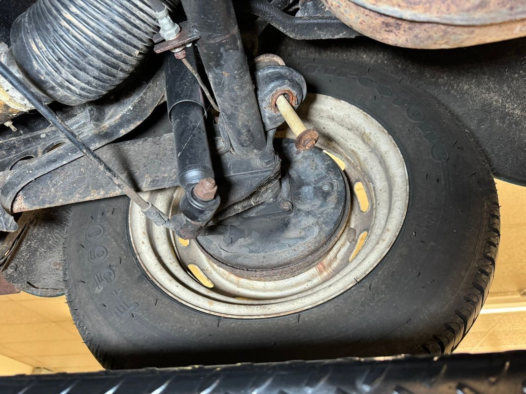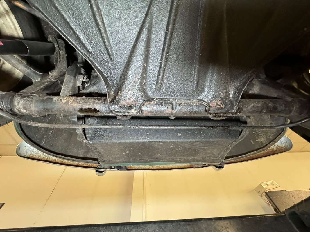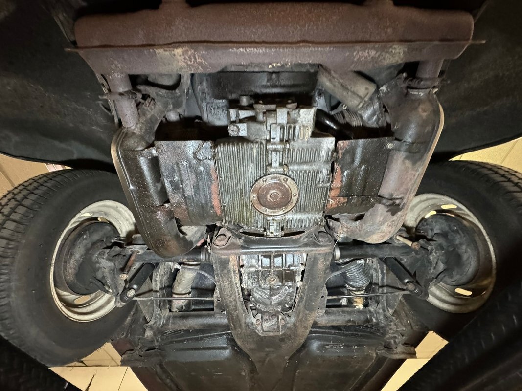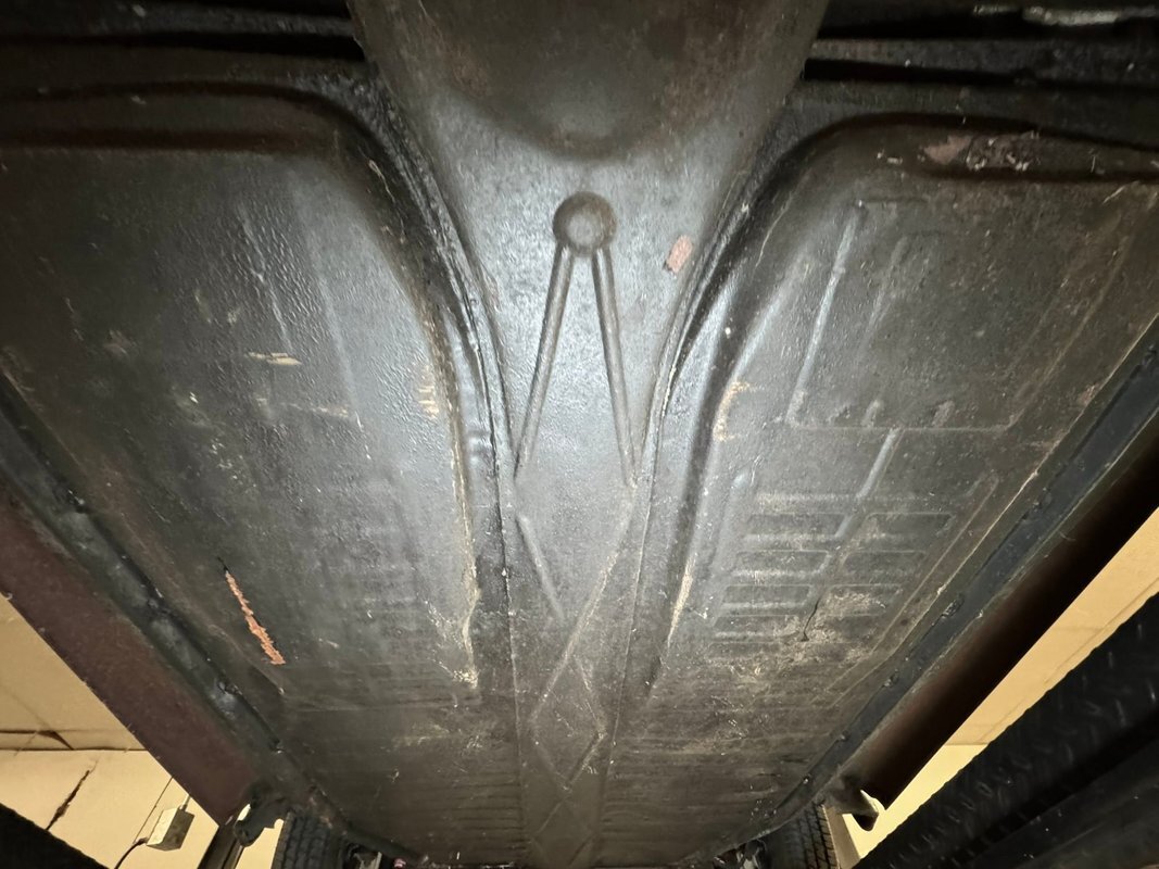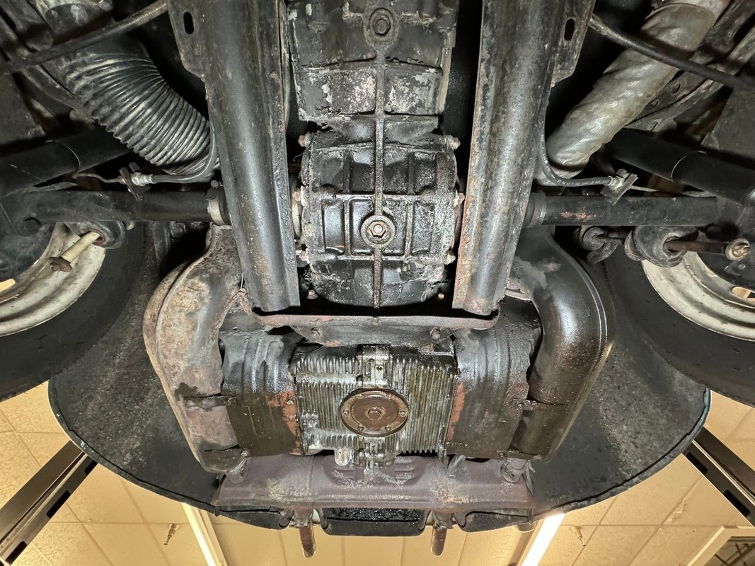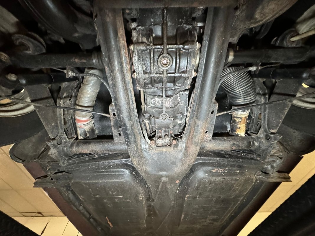 Surface rust covers the single muffler of the dual exhaust, which is pretty typical. The remainder of the underside is unremarkable with surface rust appearing only occasionally. The belly pan and inner wheel components all look good. Transverse torsion bar suspension resides on the independent front suspension while torsion bar, trailing arms, and swing axles live on the rear independent suspension.