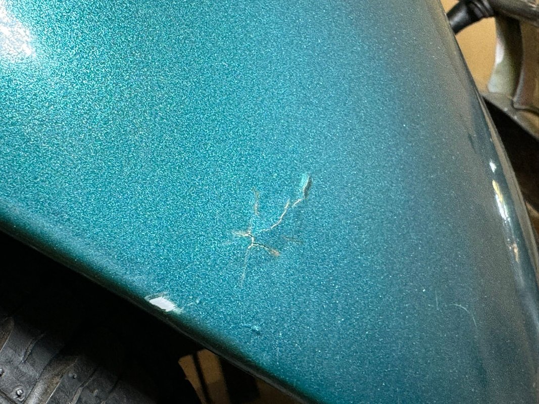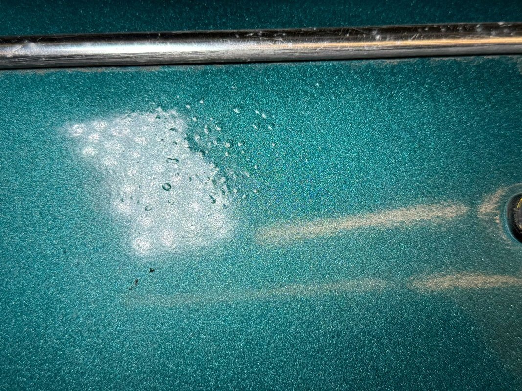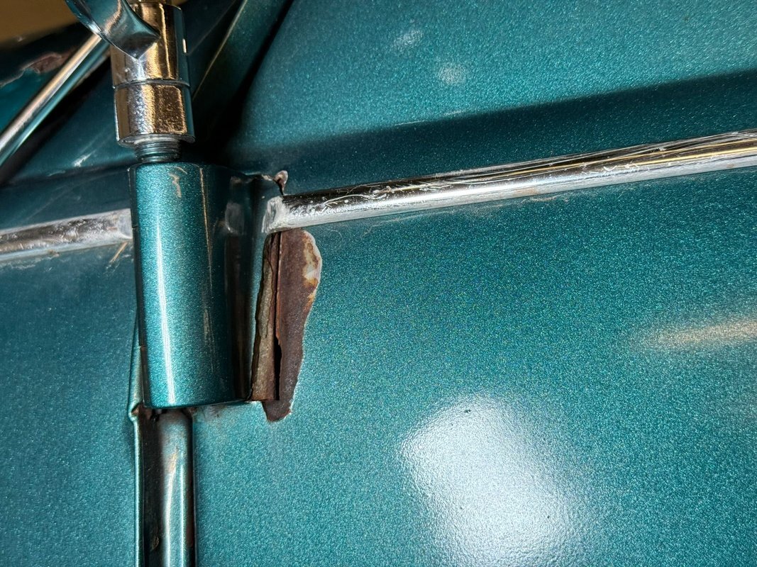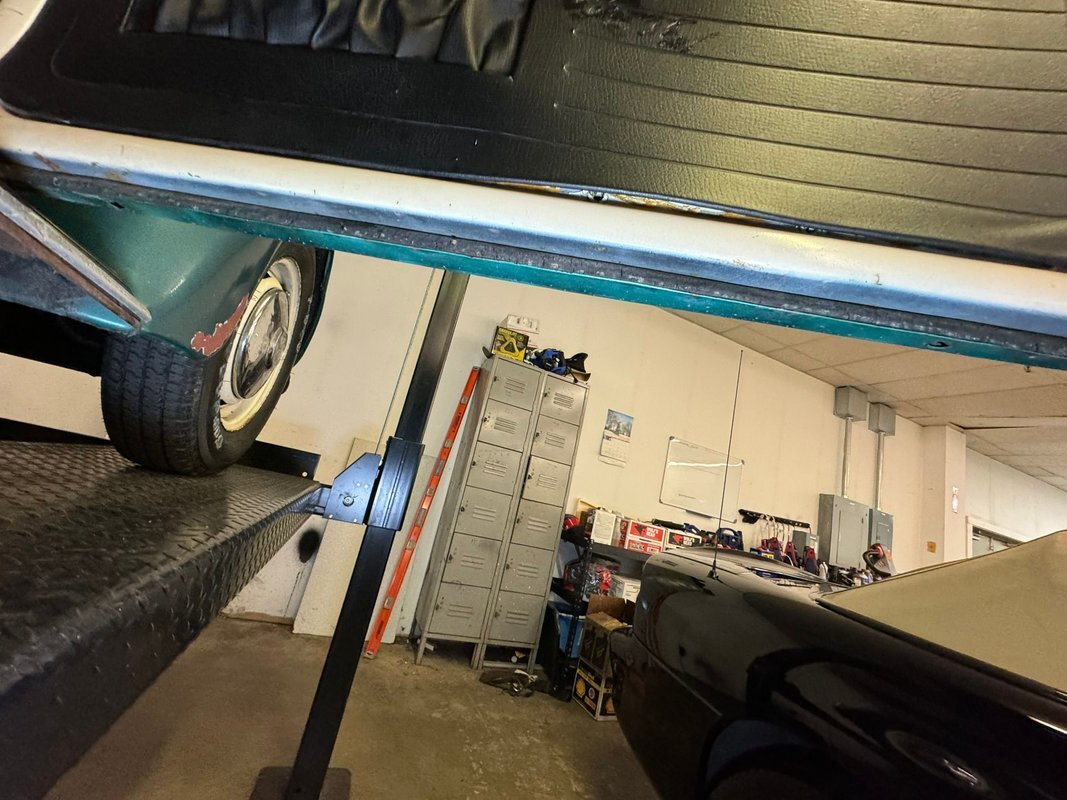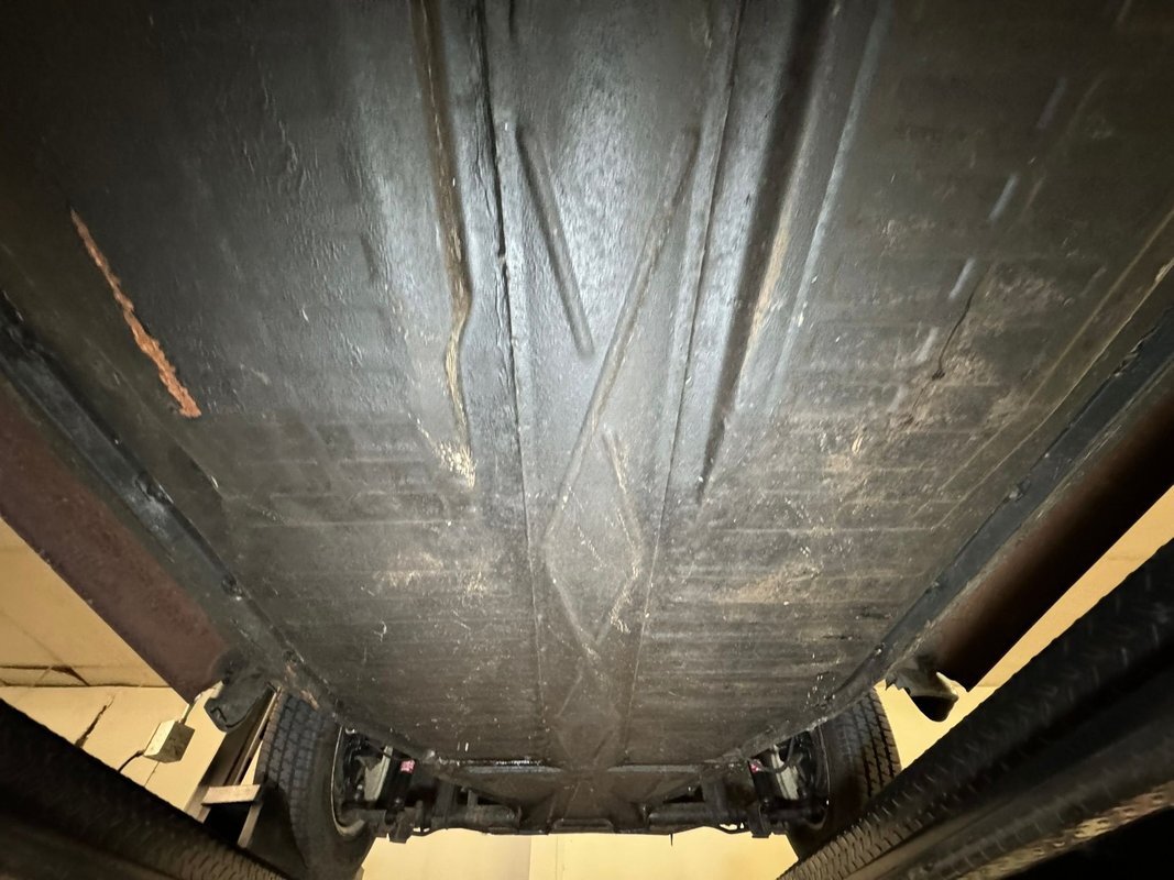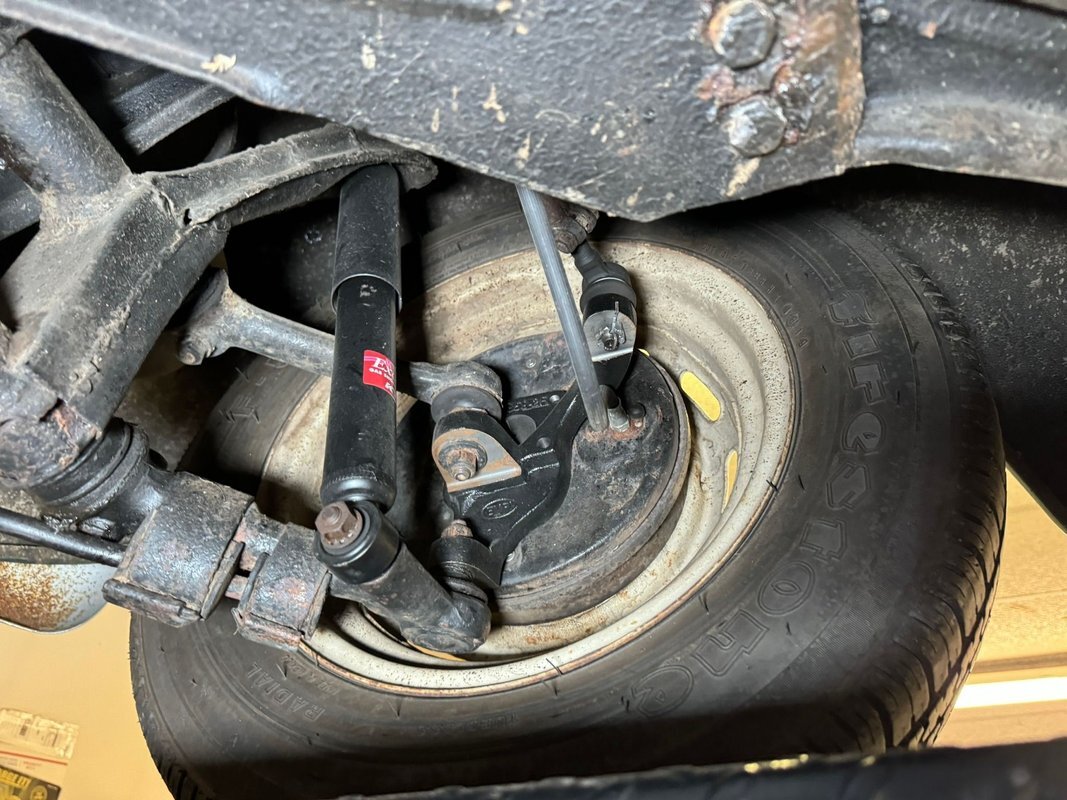 Surface rust covers the single muffler of the dual exhaust, which is pretty typical. The remainder of the underside is unremarkable with surface rust appearing only occasionally. The belly pan and inner wheel components all look good. Transverse torsion bar suspension resides on the independent front suspension while torsion bar, trailing arms, and swing axles live on the rear independent suspension.