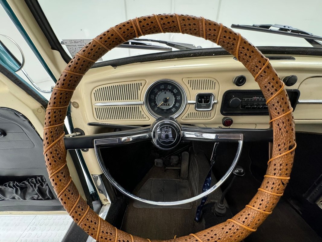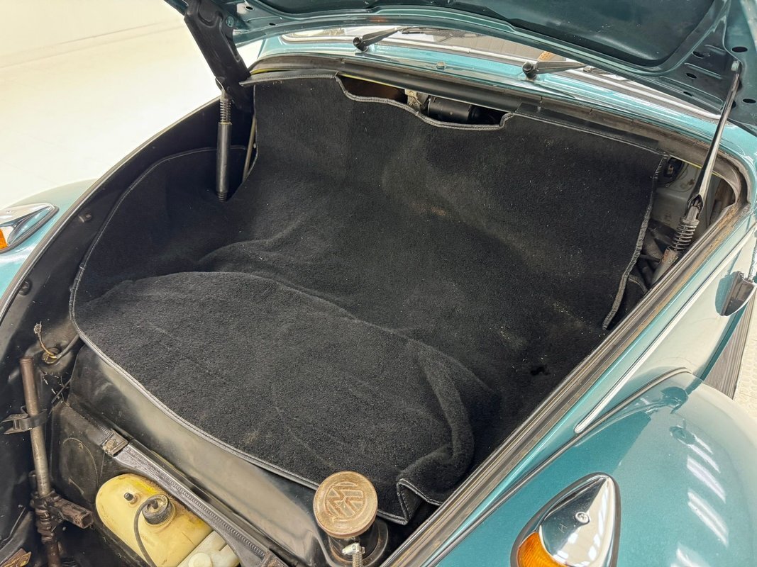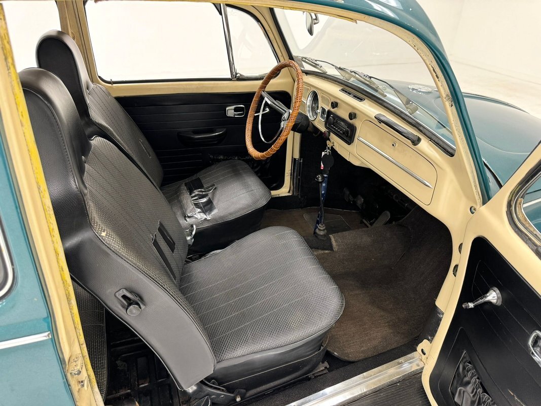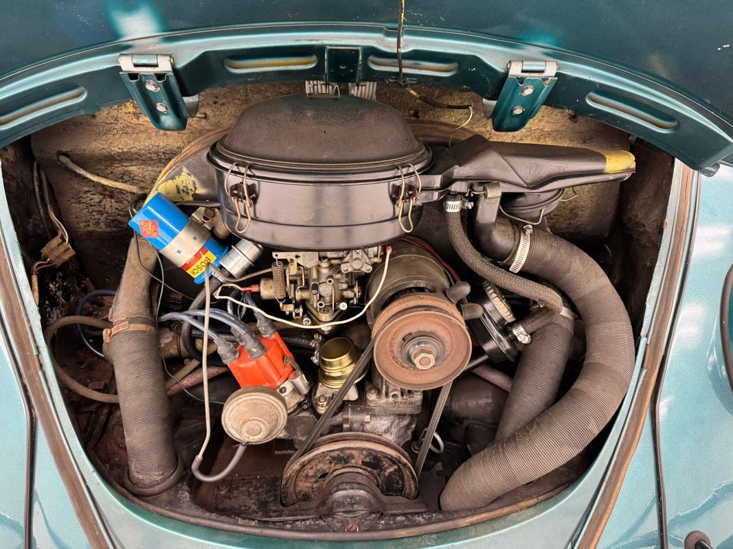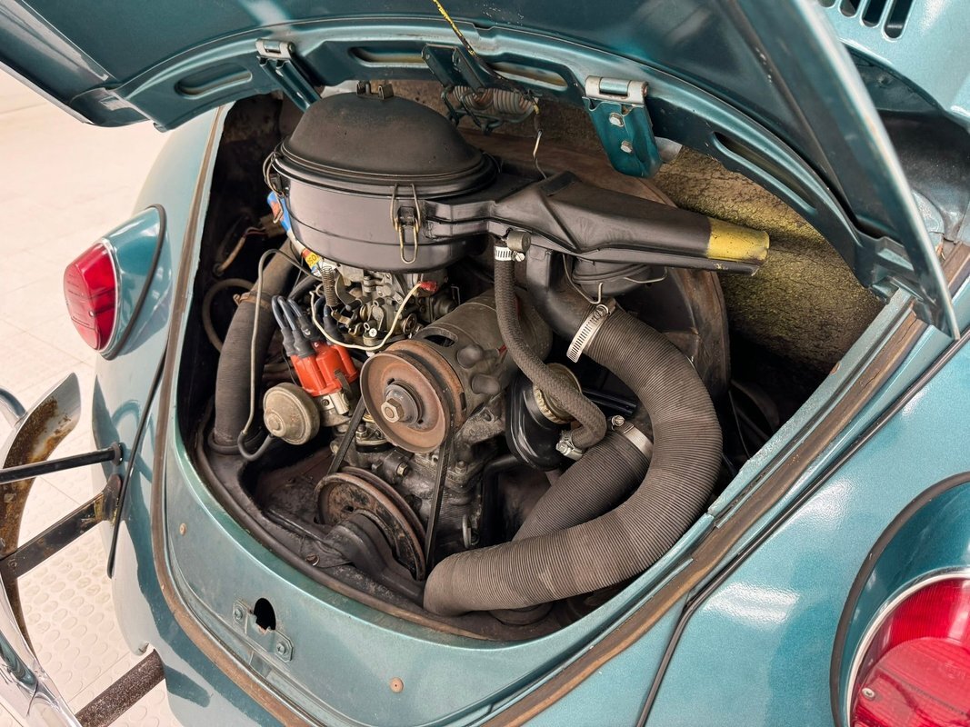 A 1600cc engine is in place rated at 60 horsepower. It's fed by a 1-barrel carburetor and tied to a 4-speed manual transmission. The rear engine compartment is clean and presentable in driver condition and of course, most components are accessible. Drum brakes occupy each corner of the Beetle.