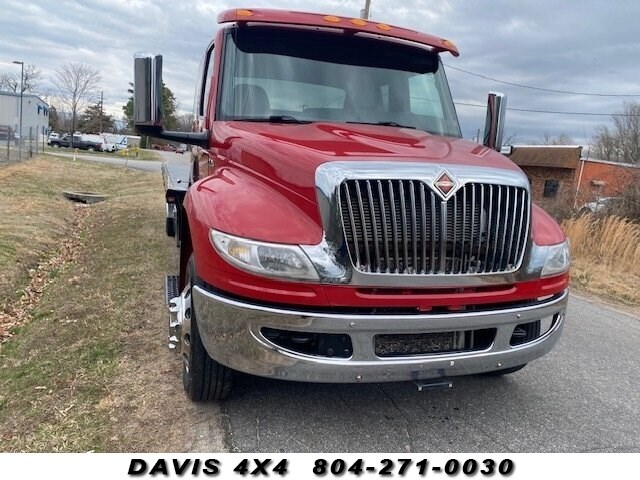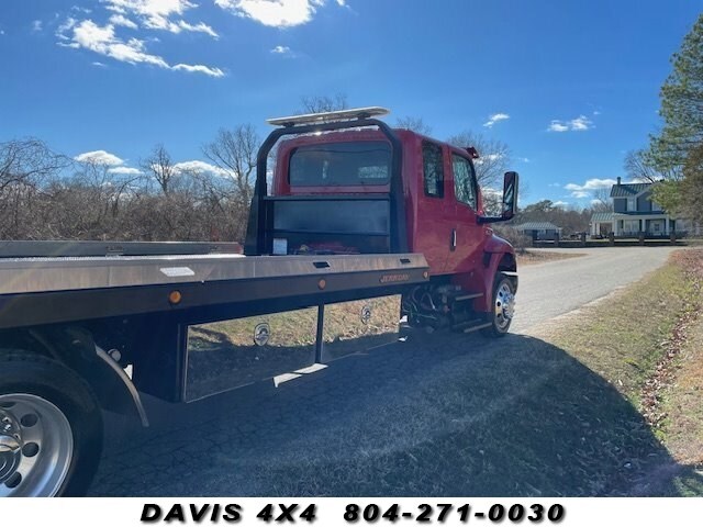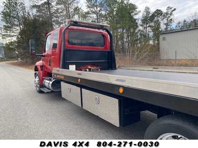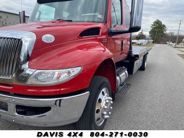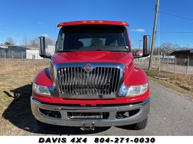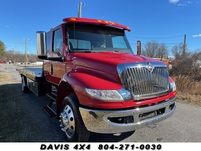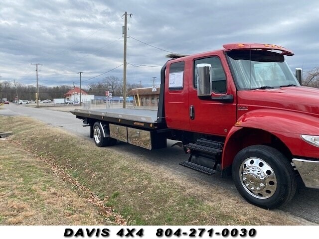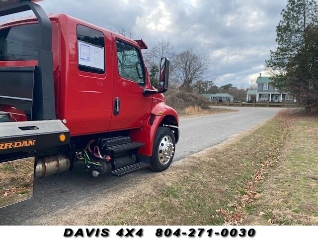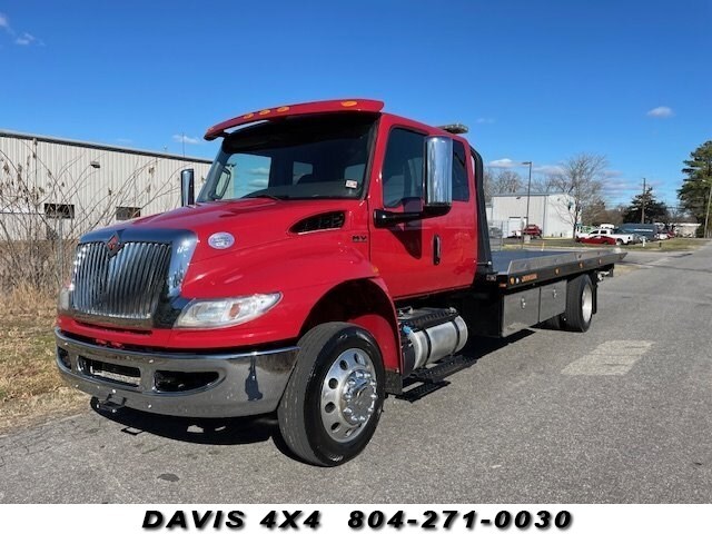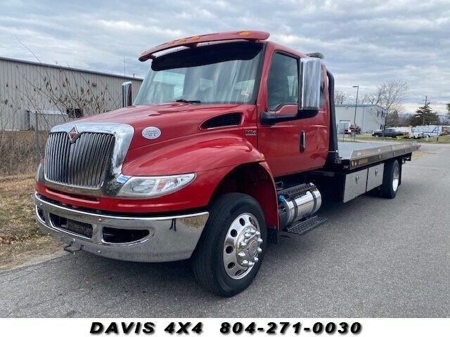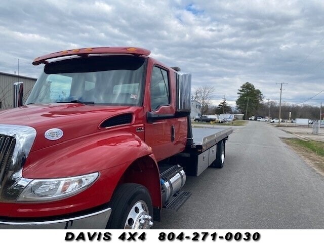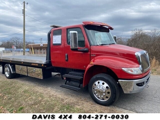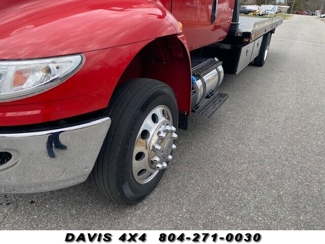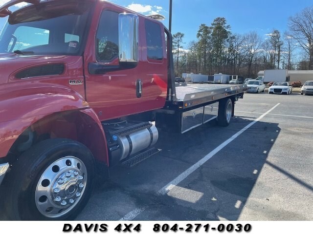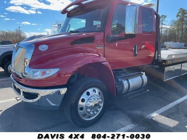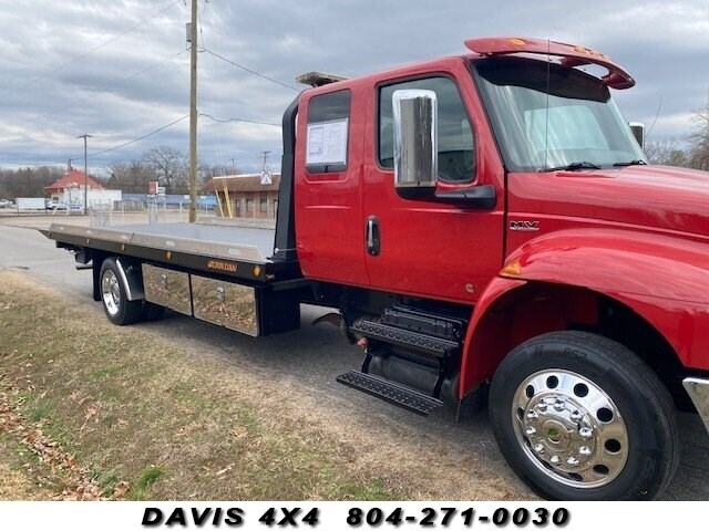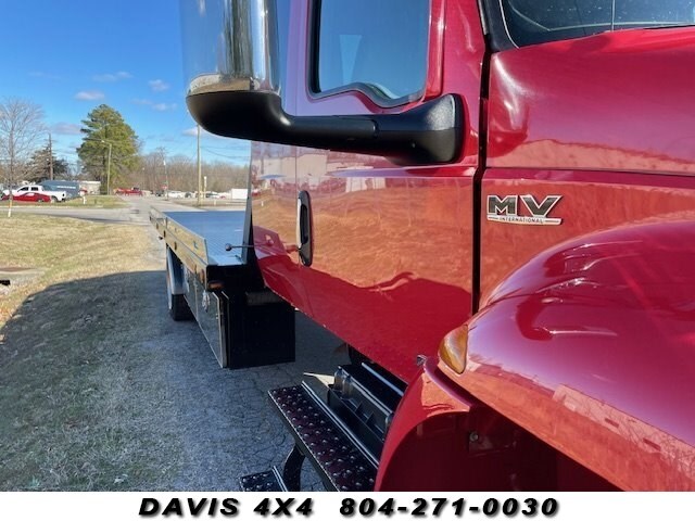 2019 International MV Extended Cab Rollback/Tow Truck Flatbed. This unit has a Jerrdan 22 x 102 steel bed with polished blade rails, two car carrier with wheel lift and towing ball mount, LED work lights, strobe light bar, quad box set up, battery Killswitch, 22.5 alloy wheels, mudflaps, stainless quarter fenders, Cummins turbo diesel engine, dual air ride seat system, Bluetooth stereo, automatic Alison transmission, color matched sunvisor. This truck has been fully freshly serviced greased and properly safety state inspected, comes equipped with safety gear and a new starters towing kit (straps chains and much more). This was a Virginia owned truck so it is rust free and is close to clean as new as you will find.
