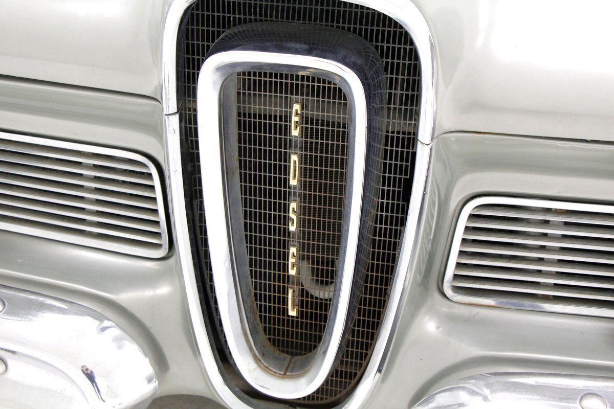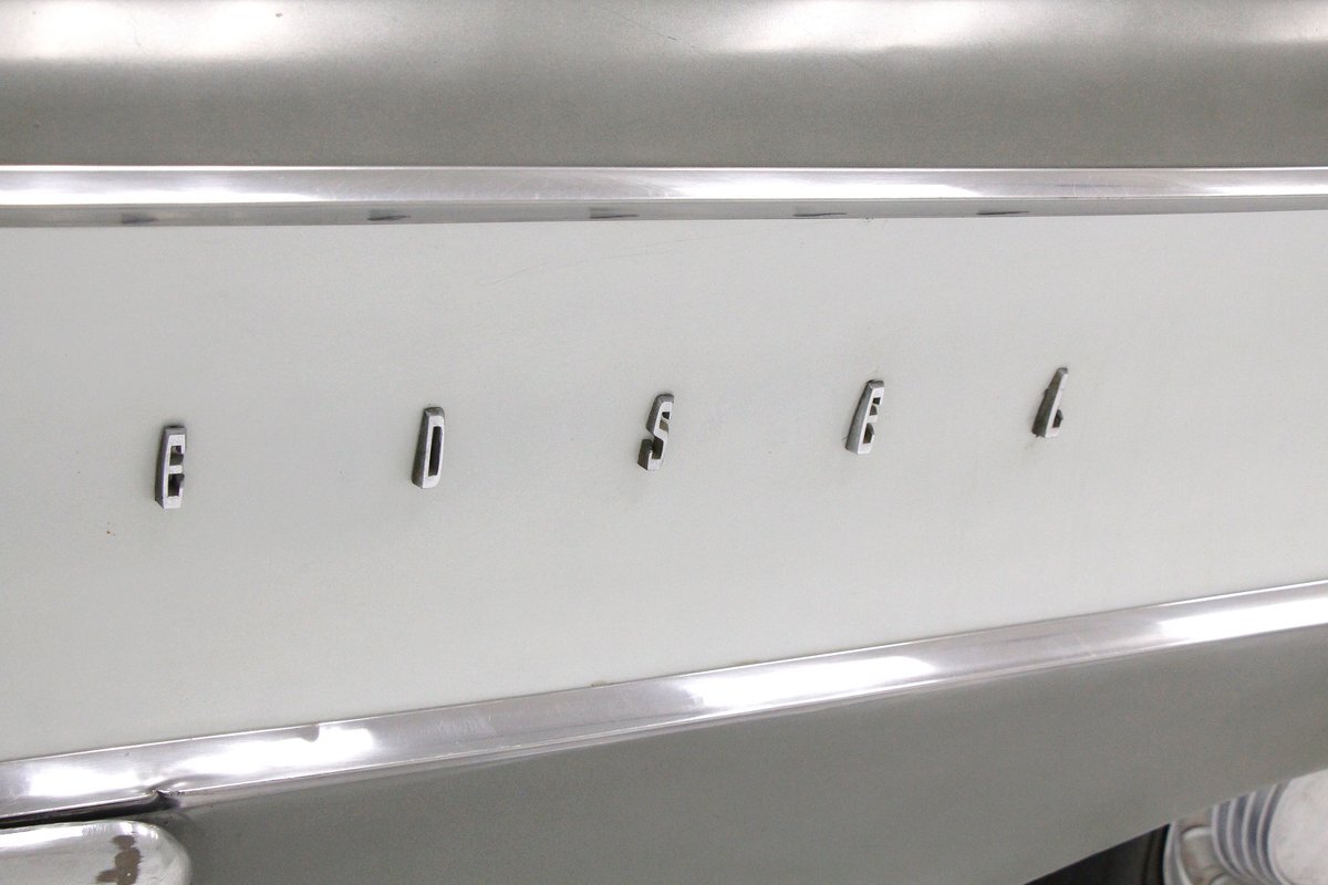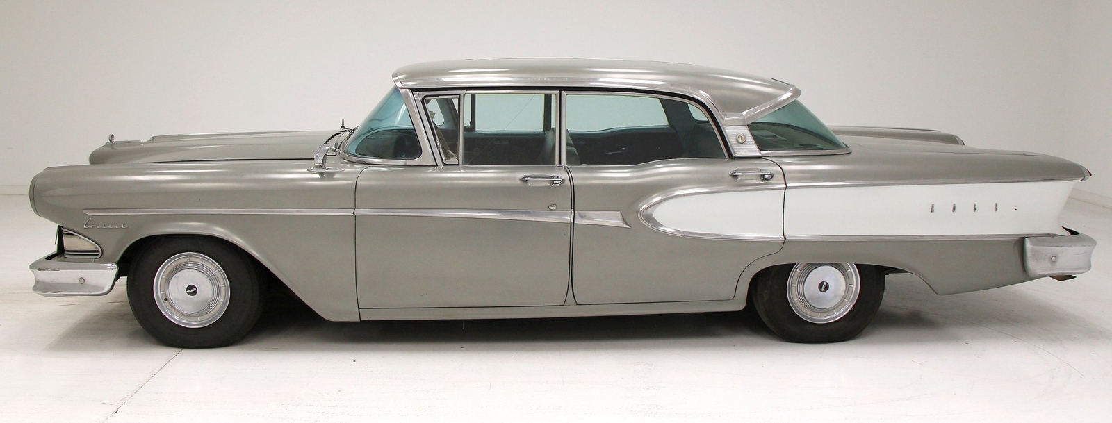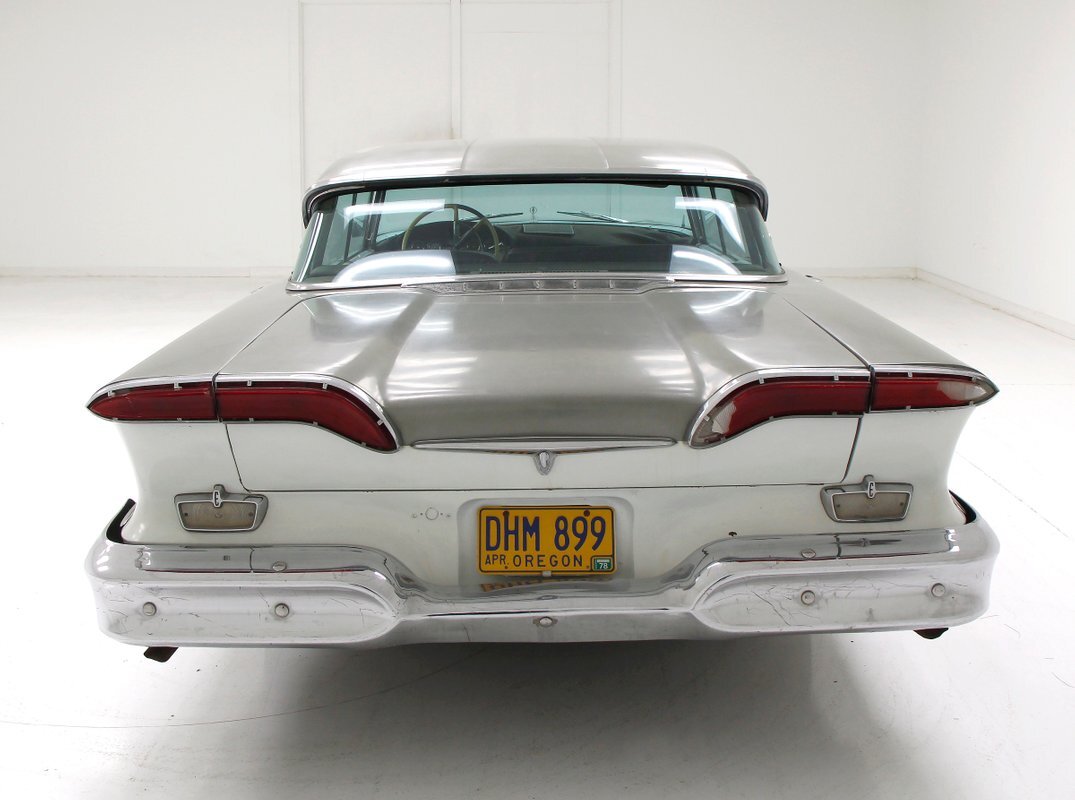 Not perfect, but certainly solid as Silver Gray Metallic and Frost White bathes this long and mighty car, with fairly straight steel panels, and decently minded gaps. A sweeping trim spear runs the front 2/3rd length of the car at the beltline and makes an artistic dip at mid rear door before opening up to encase the Frost White beltline insert at the tail of the car. With the dual headlights flanking the horizontal grille ends, and the iconic vertical center known as the "toilet seat" or "vulva" grille, it was either loved or hated. This one presents in good condition with minor pitting and cloudiness of the chrome, as does the grille, and bumpers. A wrap-around windscreen fronts a massive chrome-trimmed greenhouse topped by the gray metal roof. The rear of the car sports cat eye style 3 lens tail lights on the ends of the small bat-style fins. All badging and brite-work is correct and attached and in pitted but usable condition throughout. Embellishment abounds, right down to the complex design and the chromed side view mirrors. Some rust bubbling is noted on the lower panels with the worst area being the lower section of the passenger's rear quarter panel. Standard issue wheel covers are on and decent 15-inch tires are seen all around.