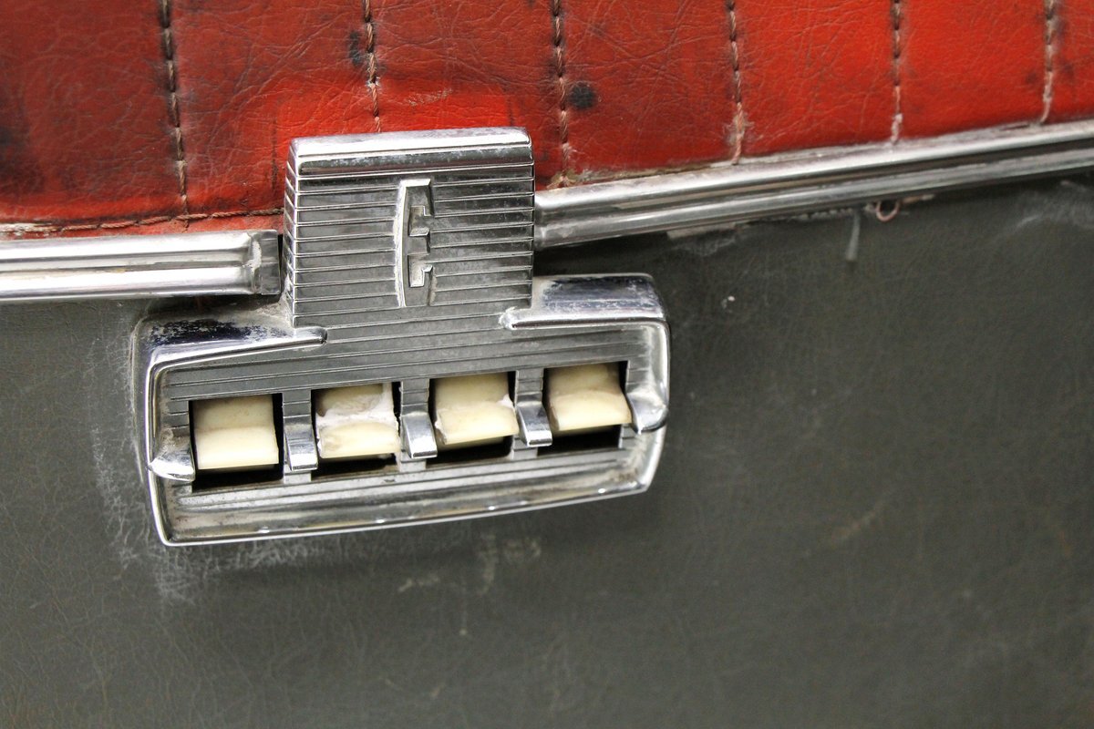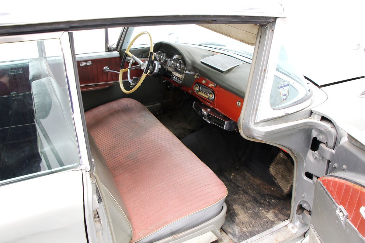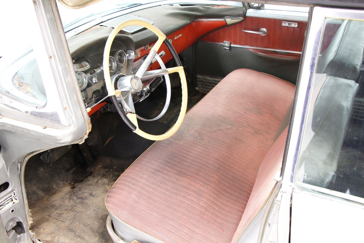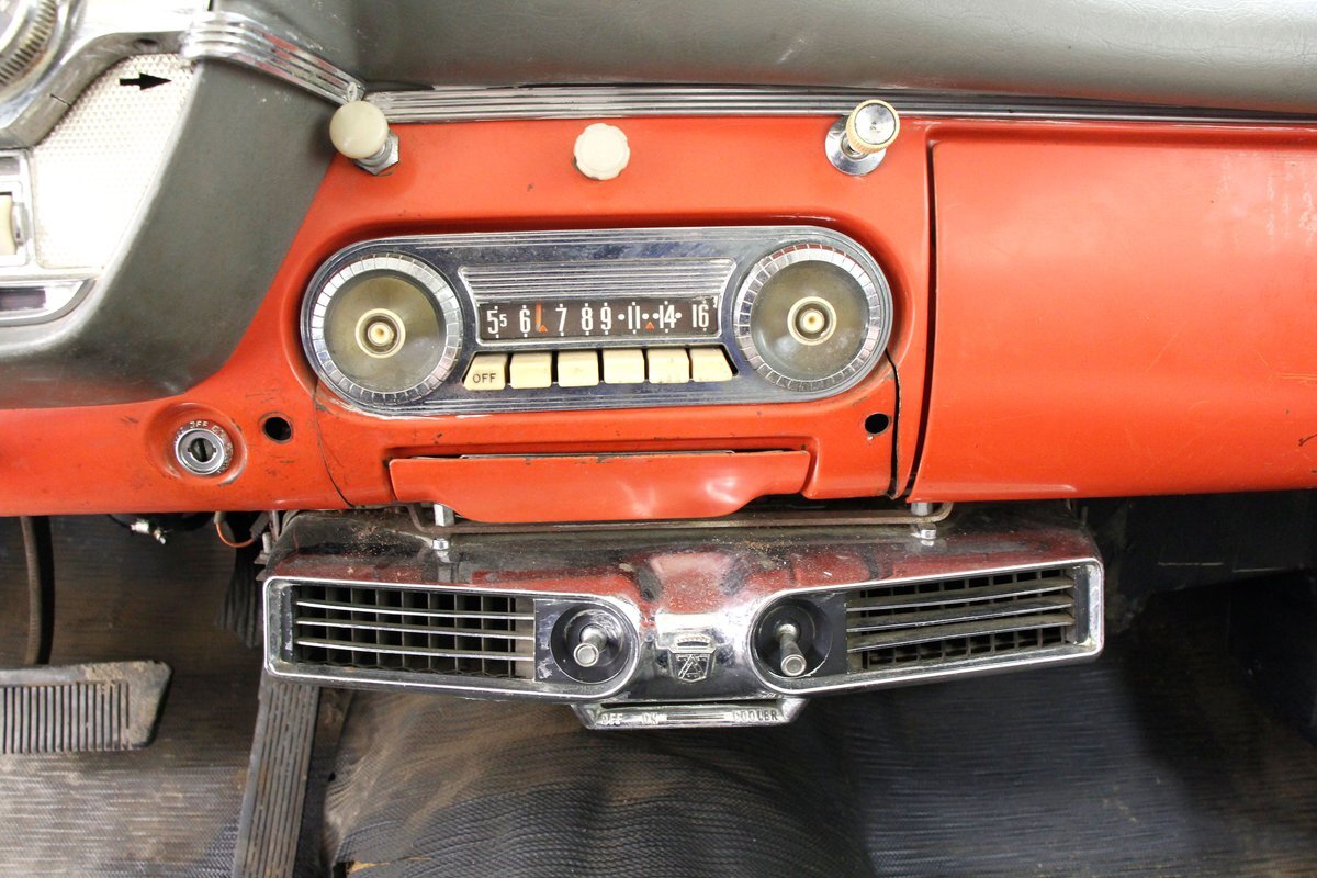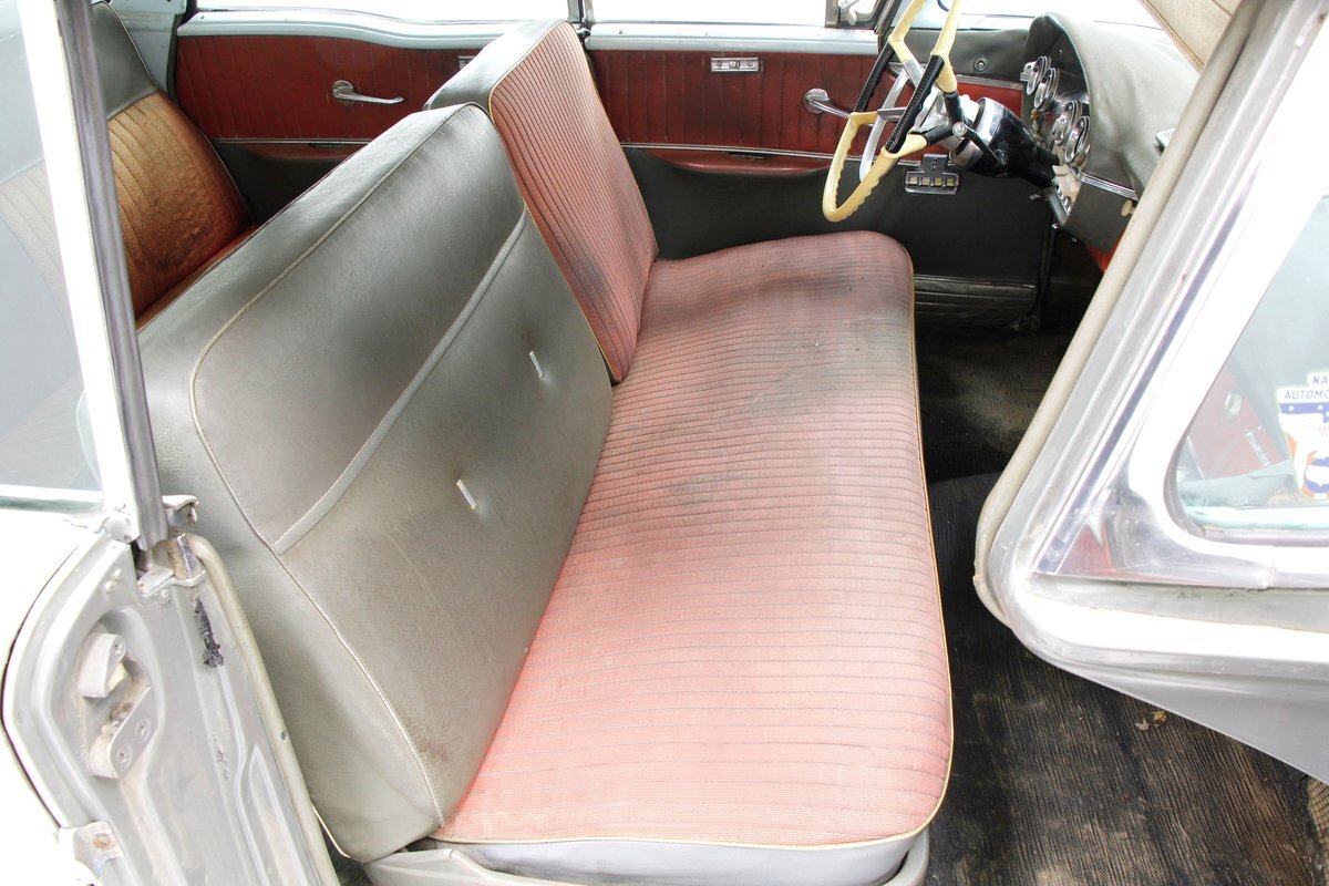 Speaking of 50s styling, it continues in earnest with the interior and a swing of the doors. Here on the doors we see some two-tone red and gray vinyl on the stitched and embroidered panels along with shiny chrome for the sills, power window toggles, and chrome actuators. The inside seating reveals a tattered and faded, but complete split back bench with gray vinyl bolsters and faded red knitted vinyl for the inserts. A soiled ivory headliner hangs above and below is heavily soiled black rubber matting covering the floors. The original red steel dash is showing in good condition with lightly tarnished chrome, along with pulls, dials and bakelite buttons for the heater slides and radio pushbuttons. A worn and cracked black padded topper is up high on the dash and down low and center is an added chrome AC controller. We have to give an A for effort though as it is futuristic with its highlight being chrome and LOTS OF IT! The original steering wheel is present and accounted for but the teletouch shifter has been removed and a simple column shifter has taken its place. We note some heavy surface rust, bordering on invasive, coating the bottoms of the 4 doors.