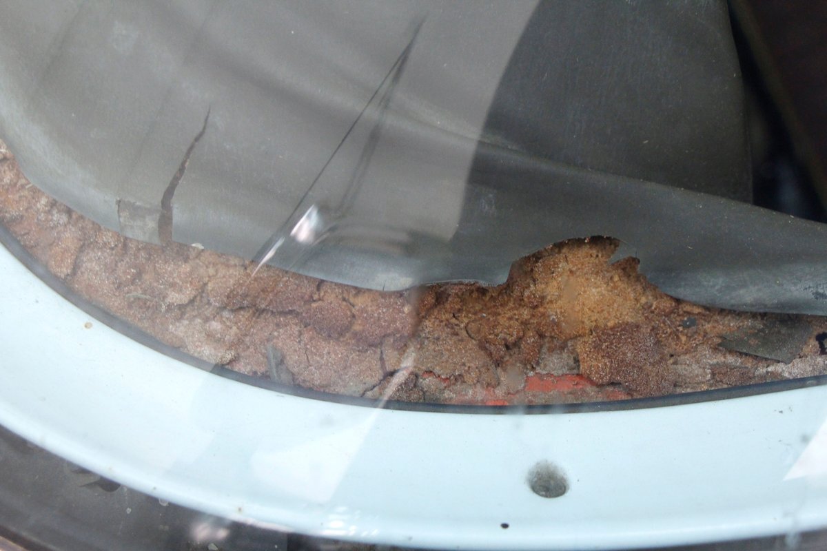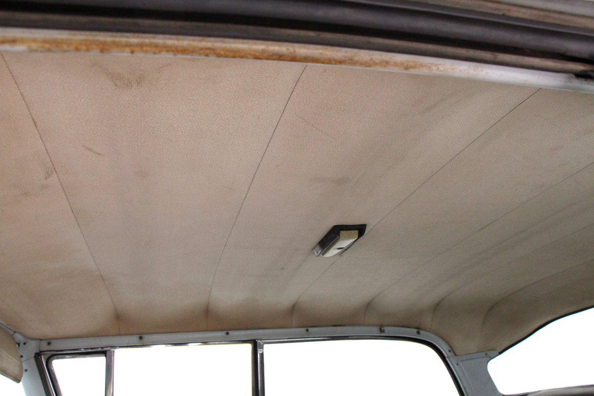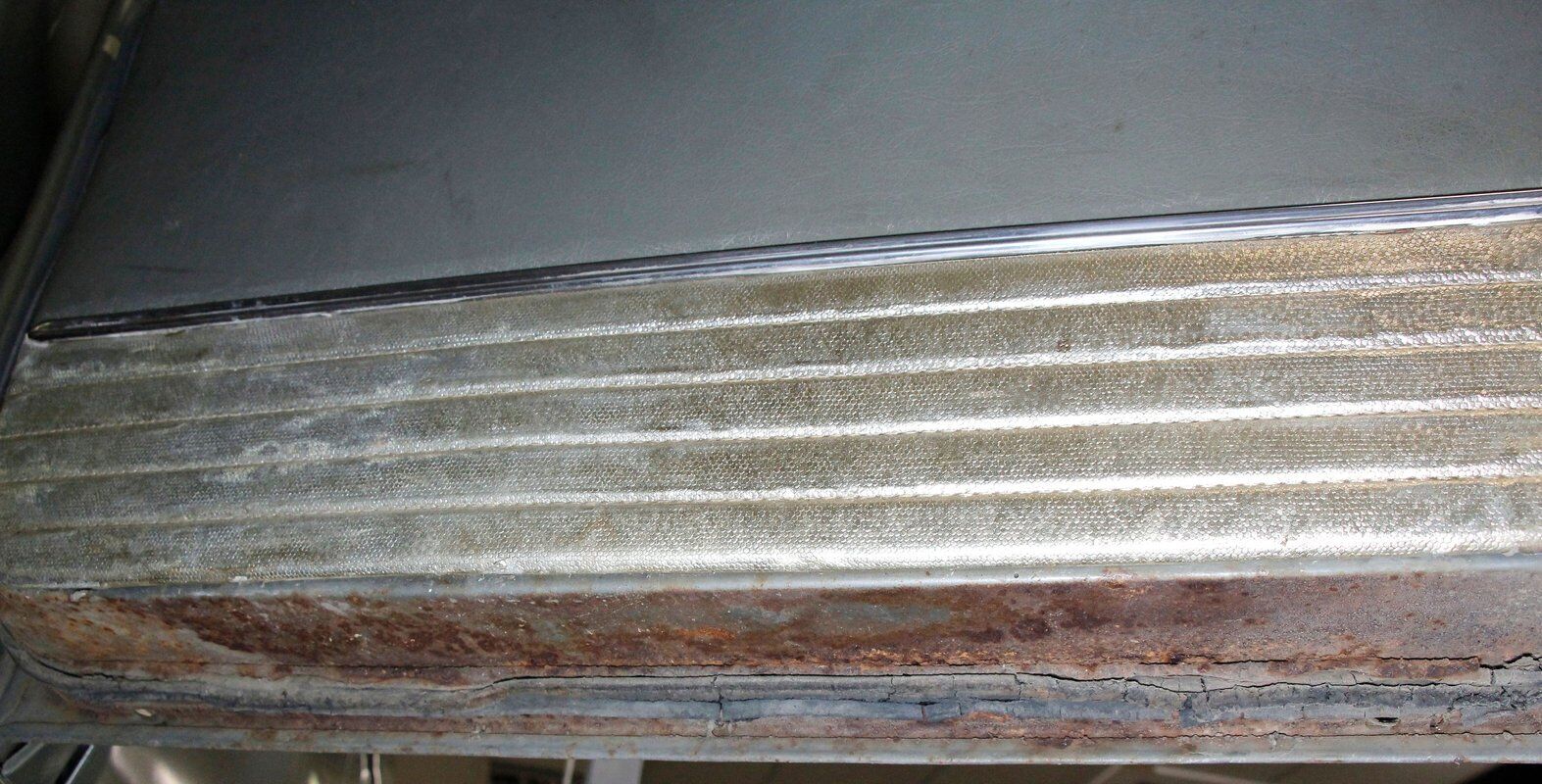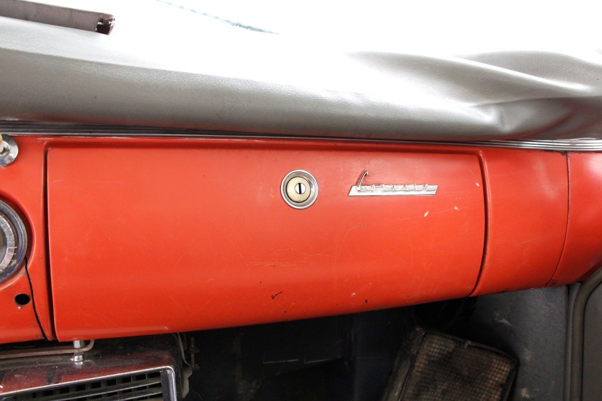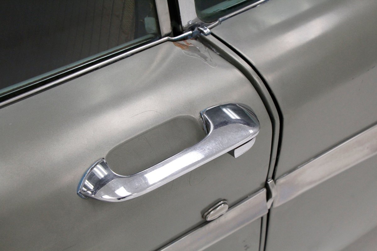 Speaking of 50s styling, it continues in earnest with the interior and a swing of the doors. Here on the doors we see some two-tone red and gray vinyl on the stitched and embroidered panels along with shiny chrome for the sills, power window toggles, and chrome actuators. The inside seating reveals a tattered and faded, but complete split back bench with gray vinyl bolsters and faded red knitted vinyl for the inserts. A soiled ivory headliner hangs above and below is heavily soiled black rubber matting covering the floors. The original red steel dash is showing in good condition with lightly tarnished chrome, along with pulls, dials and bakelite buttons for the heater slides and radio pushbuttons. A worn and cracked black padded topper is up high on the dash and down low and center is an added chrome AC controller. We have to give an A for effort though as it is futuristic with its highlight being chrome and LOTS OF IT! The original steering wheel is present and accounted for but the teletouch shifter has been removed and a simple column shifter has taken its place. We note some heavy surface rust, bordering on invasive, coating the bottoms of the 4 doors.
