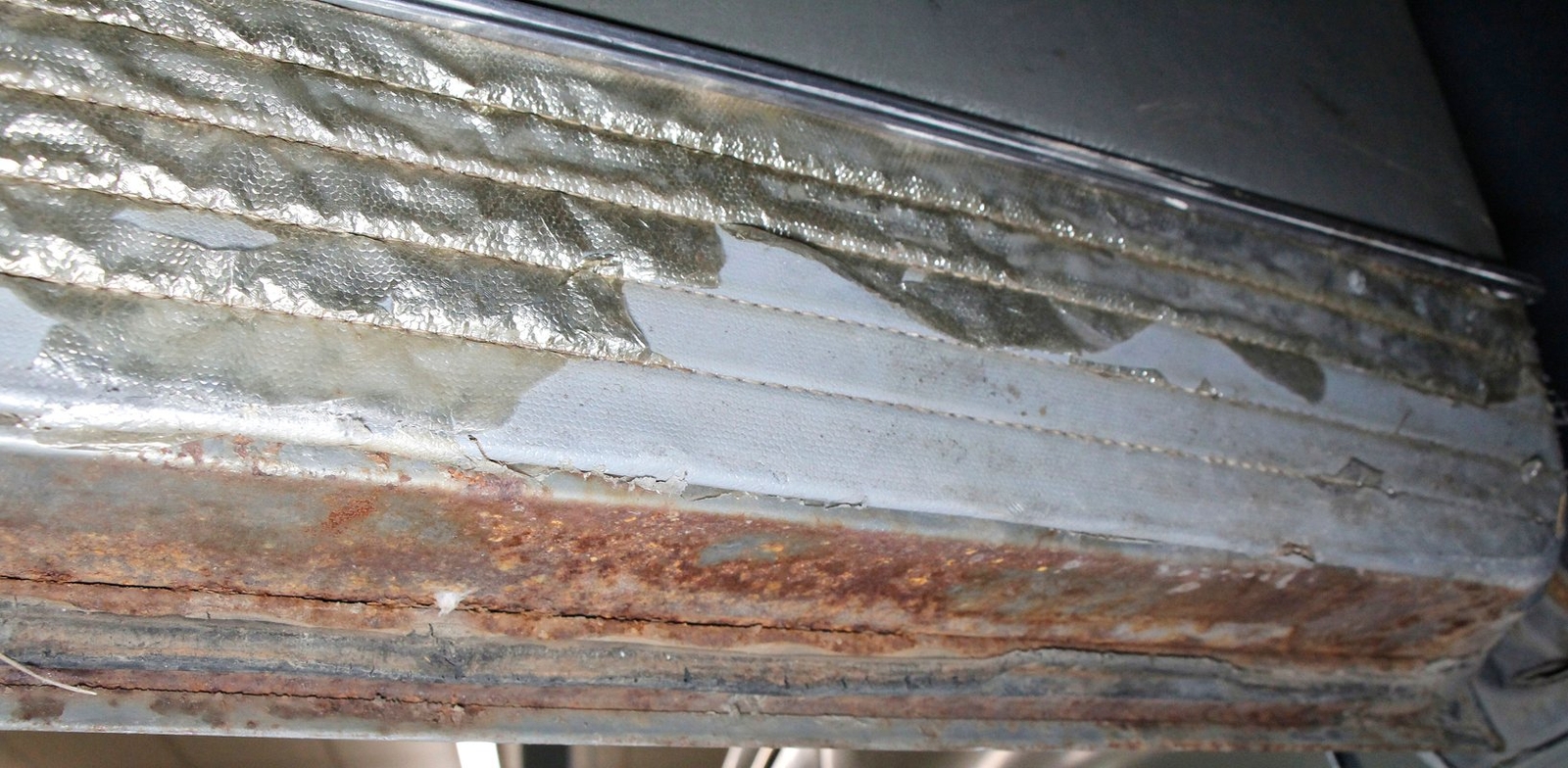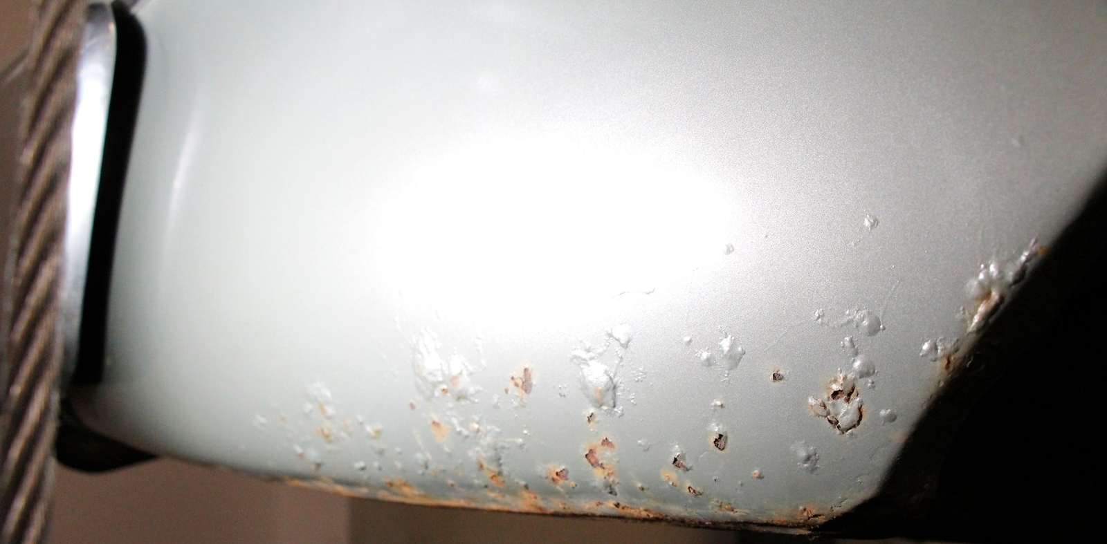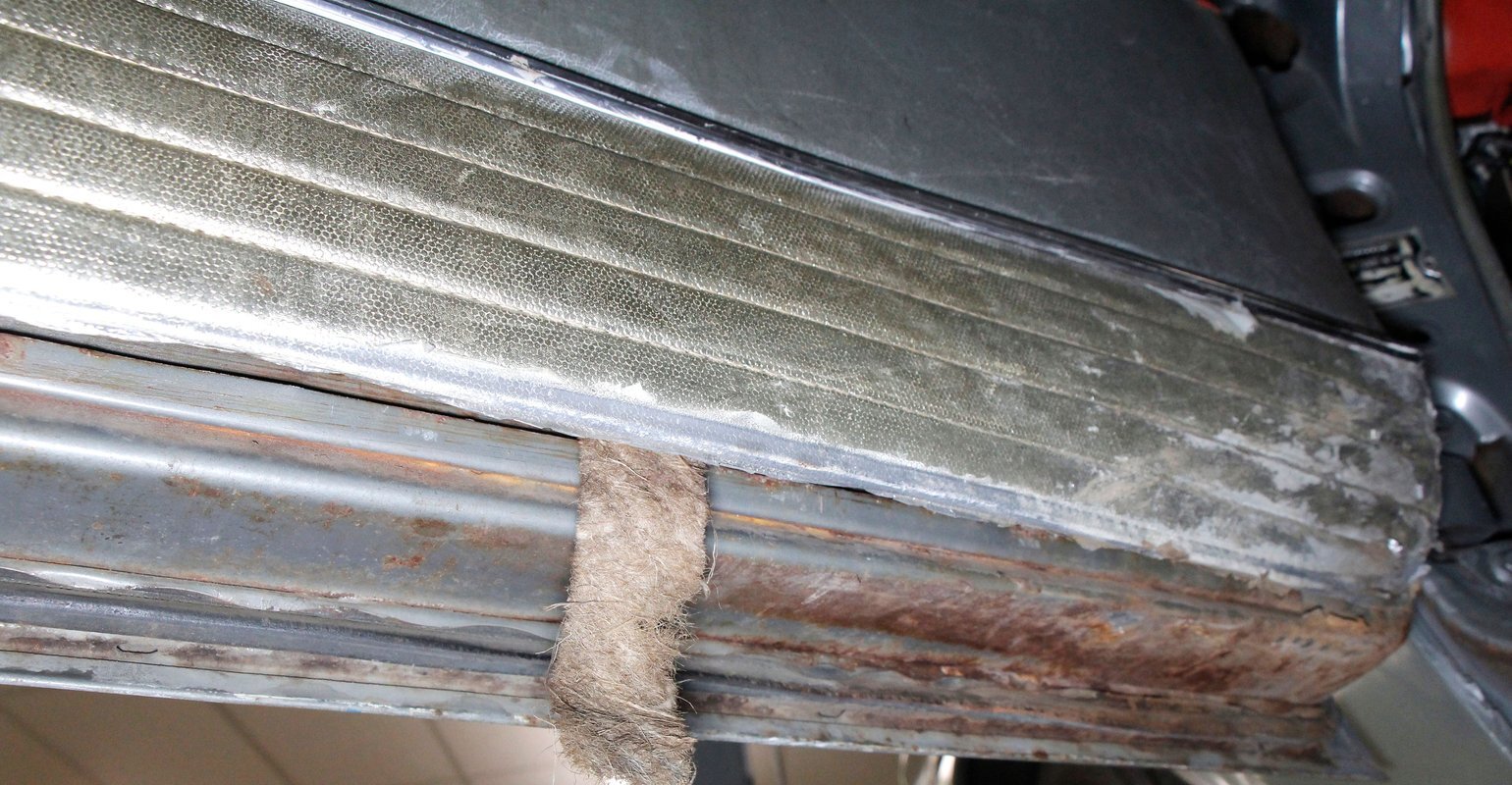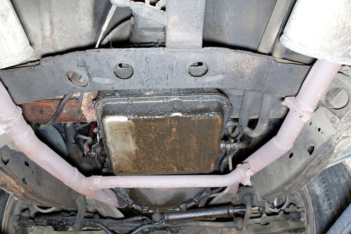 Speaking of 50s styling, it continues in earnest with the interior and a swing of the doors. Here on the doors we see some two-tone red and gray vinyl on the stitched and embroidered panels along with shiny chrome for the sills, power window toggles, and chrome actuators. The inside seating reveals a tattered and faded, but complete split back bench with gray vinyl bolsters and faded red knitted vinyl for the inserts. A soiled ivory headliner hangs above and below is heavily soiled black rubber matting covering the floors. The original red steel dash is showing in good condition with lightly tarnished chrome, along with pulls, dials and bakelite buttons for the heater slides and radio pushbuttons. A worn and cracked black padded topper is up high on the dash and down low and center is an added chrome AC controller. We have to give an A for effort though as it is futuristic with its highlight being chrome and LOTS OF IT! The original steering wheel is present and accounted for but the teletouch shifter has been removed and a simple column shifter has taken its place. We note some heavy surface rust, bordering on invasive, coating the bottoms of the 4 doors.