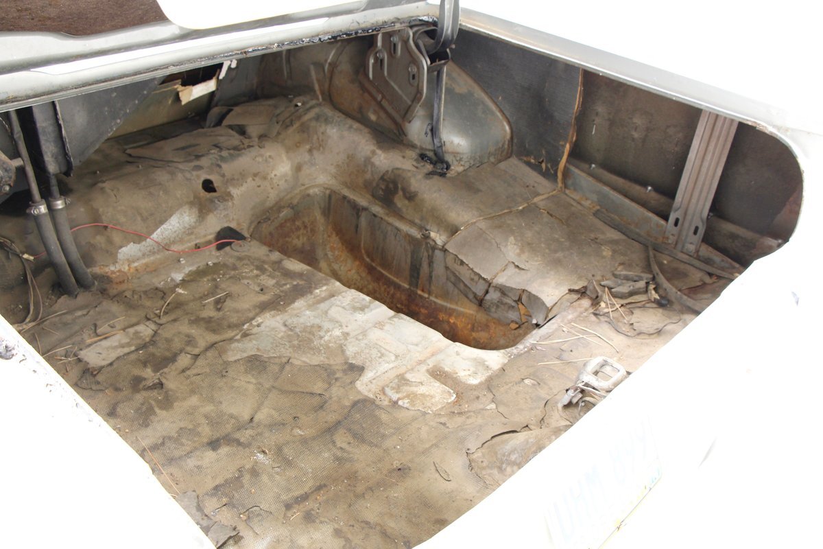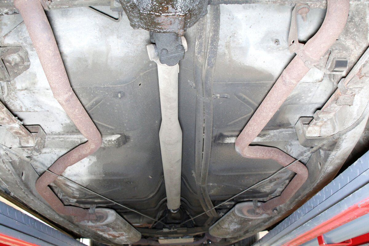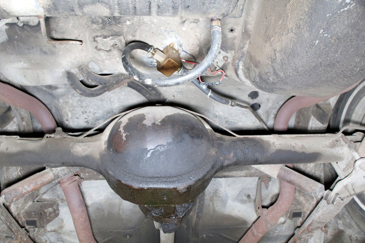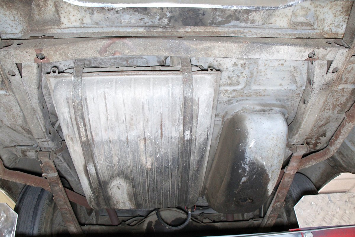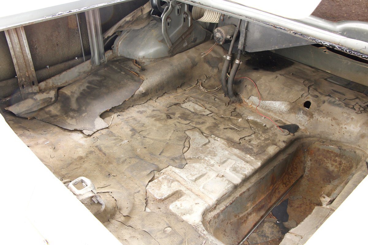 Underneath looks quite good with some surface rust, a solid frame, as well as floor pans. Some rot on the inner rockers can be noted throughout the sides where they greet the frame. This car sports power drum braking all around as well as independent coil sprung front suspension and rear leaf springs. We note an electric fuel pump has been added to ensure reliable fuel delivery