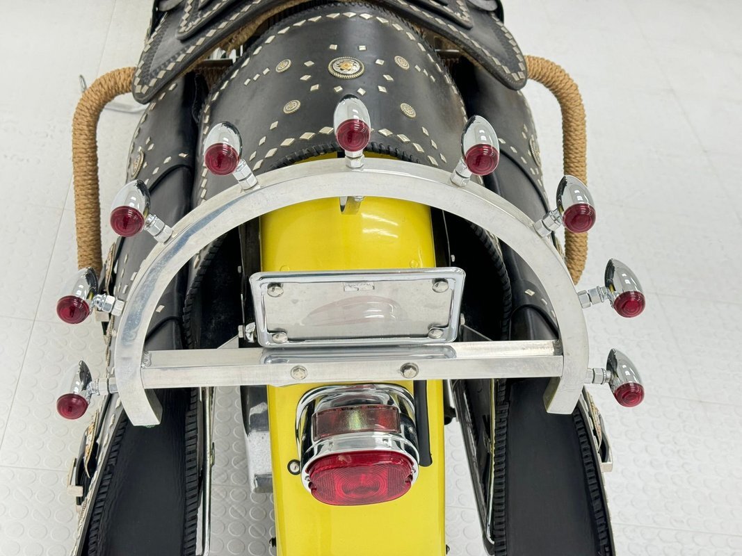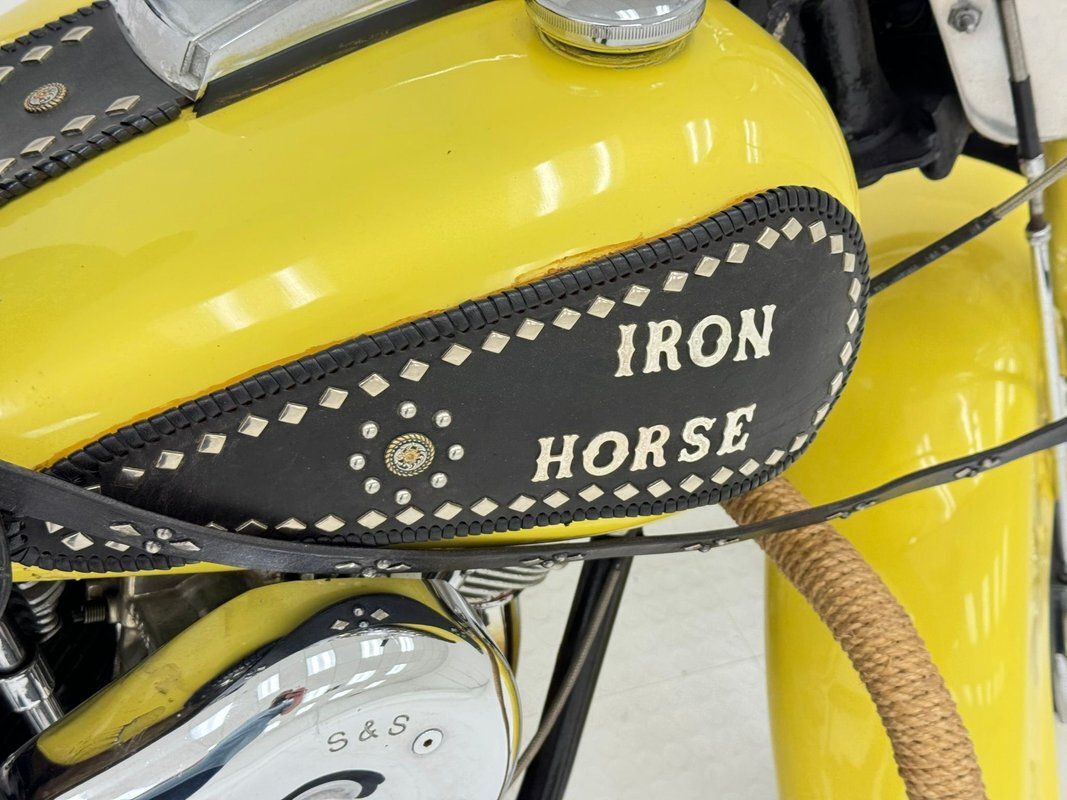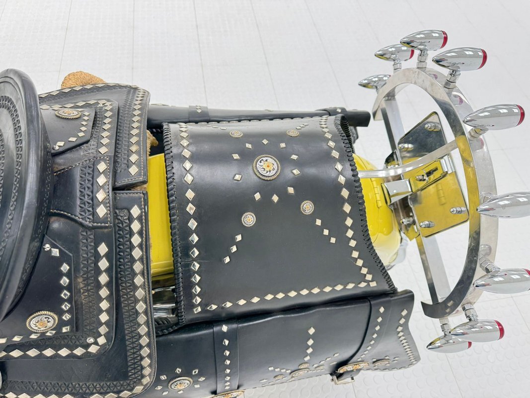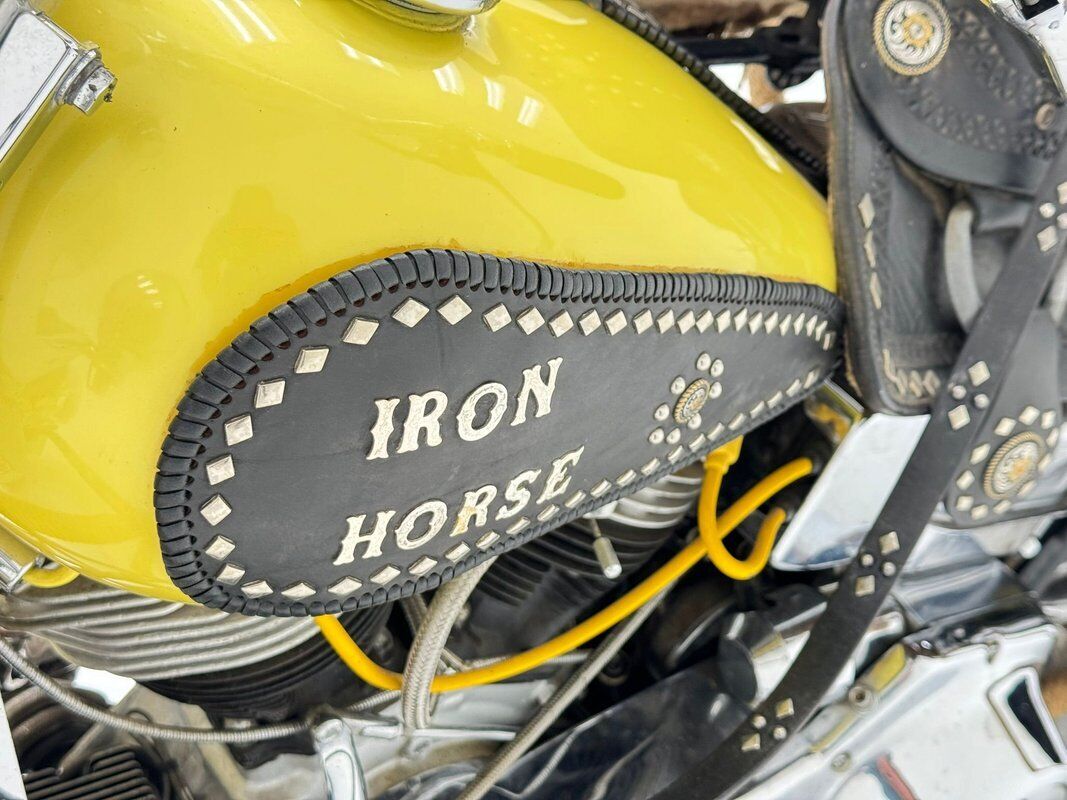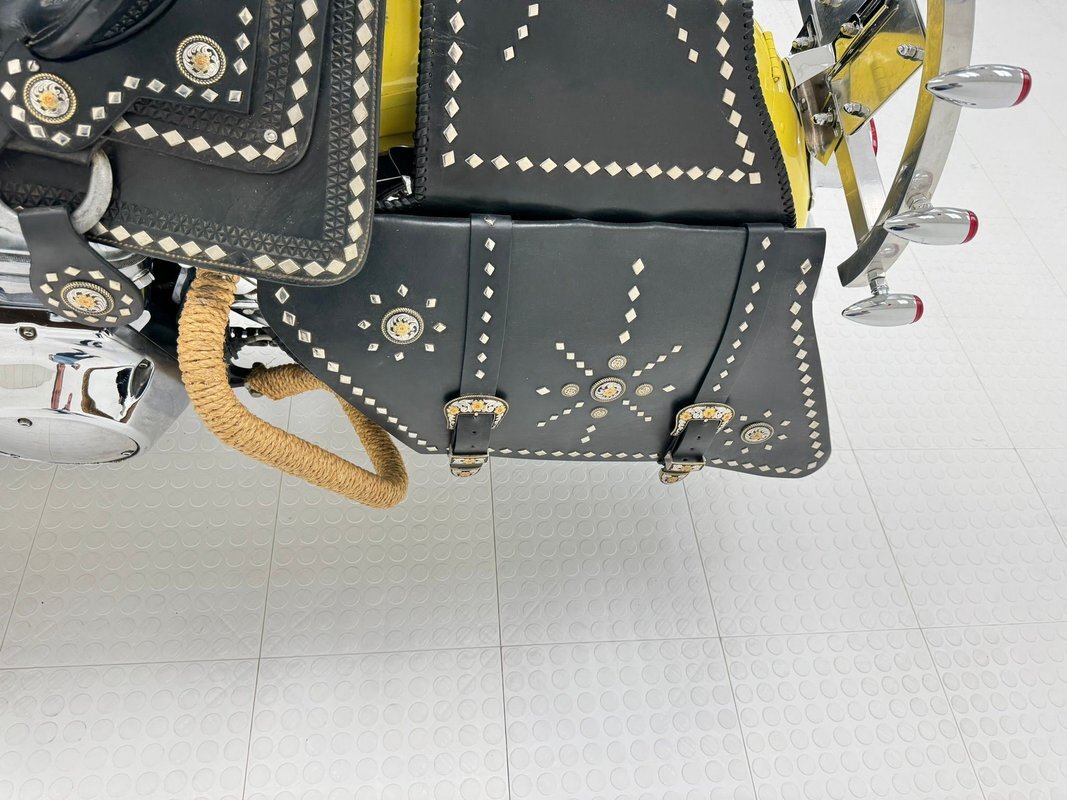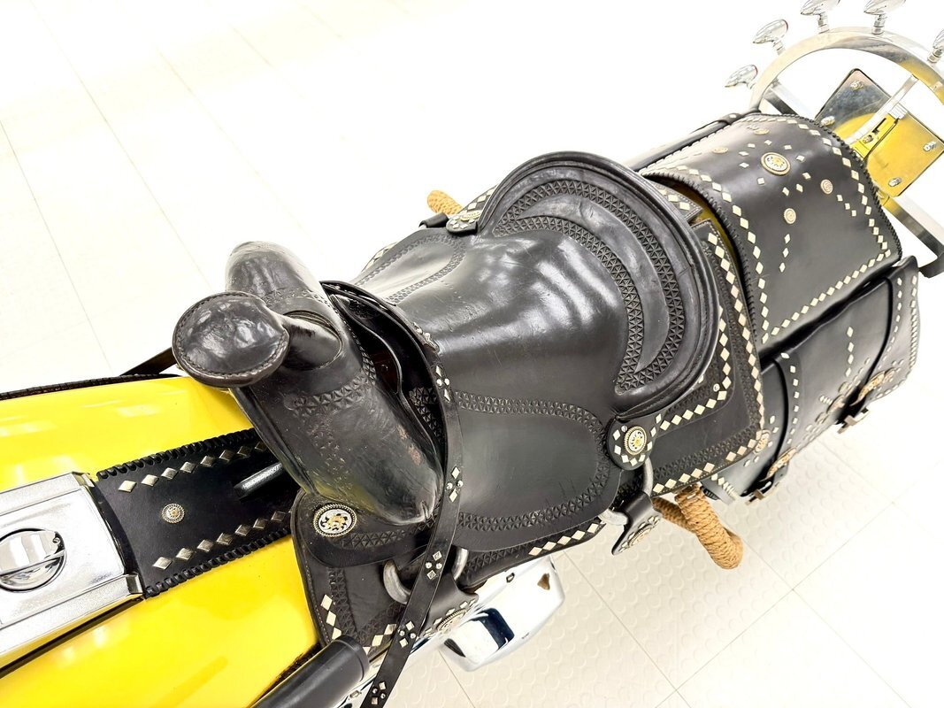The base color is yellow and it brightly covers the fenders and tank. The beefy chrome fork leads to chrome drum brake covers. The front fender has a chrome accent piece that protrudes like a brush guard and on top of the fender is a large painted leather Bald Eagle riveted to the fender. The sides of the tank are not painted rather a custom teardrop shaped leather Iron Horse appliques are affixed to the tank. The seat is a black leather horse saddle augmented by rhinestone decorated pieces that extend over the rear fender and continue onto the saddle bags on each side. The rear contains a horseshoe shaped chrome structure housing nine bullet shaped red lights that surround the standard taillight. The rear fender is extended by more leather, bejeweled and double loop laced. The highway bars are wrapped in thick jute twine for even more western flair and the footrests are wrapped in laced leather.