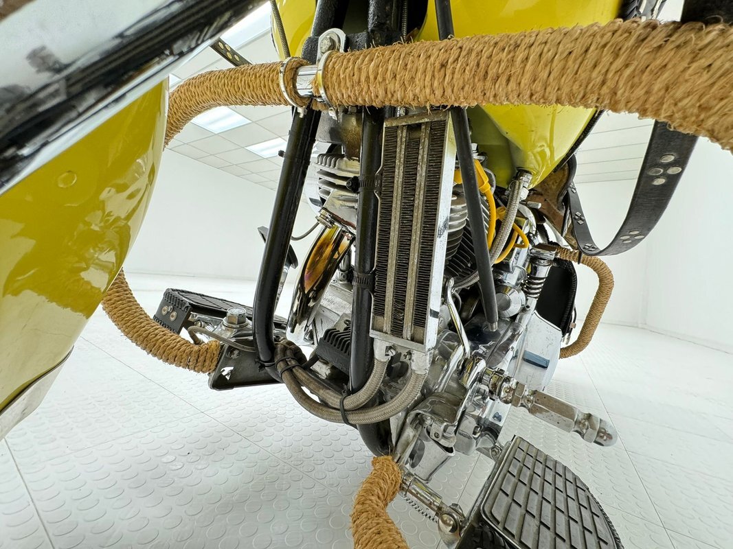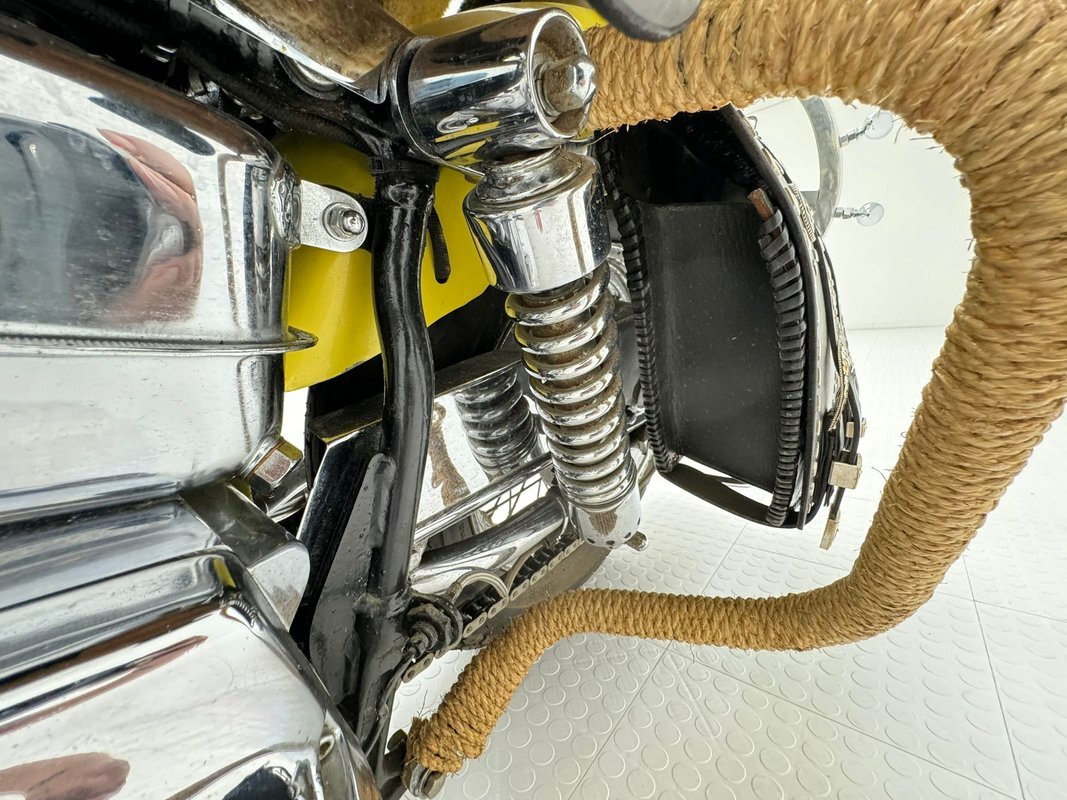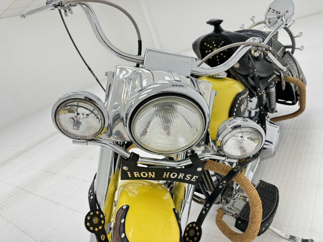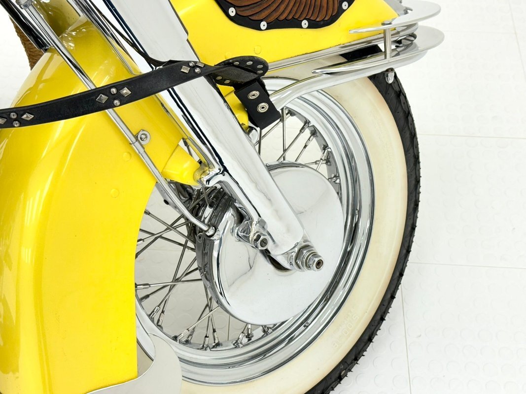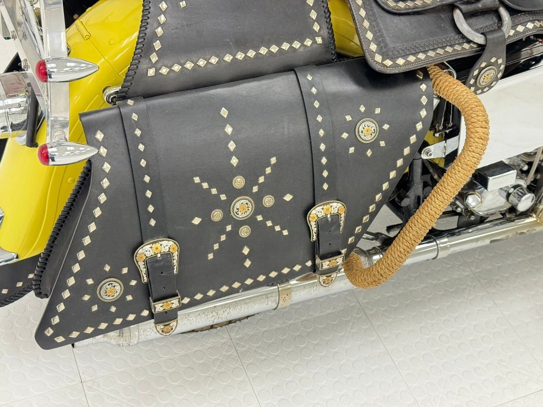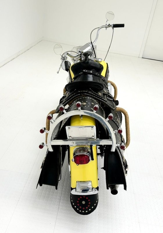 The base color is yellow and it brightly covers the fenders and tank. The beefy chrome fork leads to chrome drum brake covers. The front fender has a chrome accent piece that protrudes like a brush guard and on top of the fender is a large painted leather Bald Eagle riveted to the fender. The sides of the tank are not painted rather a custom teardrop shaped leather Iron Horse appliques are affixed to the tank. The seat is a black leather horse saddle augmented by rhinestone decorated pieces that extend over the rear fender and continue onto the saddle bags on each side. The rear contains a horseshoe shaped chrome structure housing nine bullet shaped red lights that surround the standard taillight. The rear fender is extended by more leather, bejeweled and double loop laced. The highway bars are wrapped in thick jute twine for even more western flair and the footrests are wrapped in laced leather.