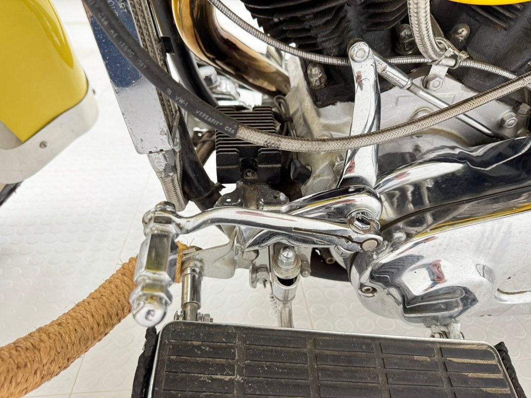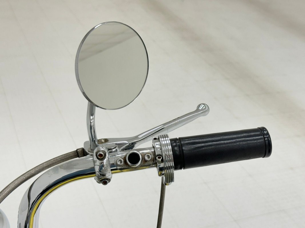 A speedometer with digits from 1 to 12 keeps things simple and a bright red needle indicates your given speed. The handlebars are simple as well and the brake and clutch levers are straight and robust. Suspension is handled by front cartridges and a rear swing arm with twin shocks. 16-inch chrome wire wheels are halted by drum brakes on front and back.