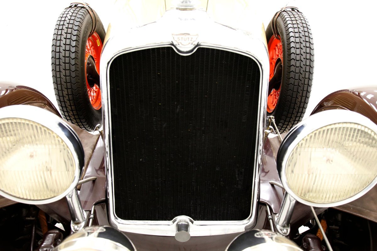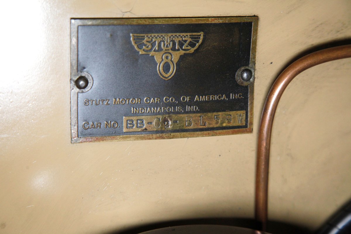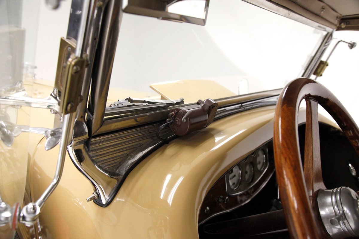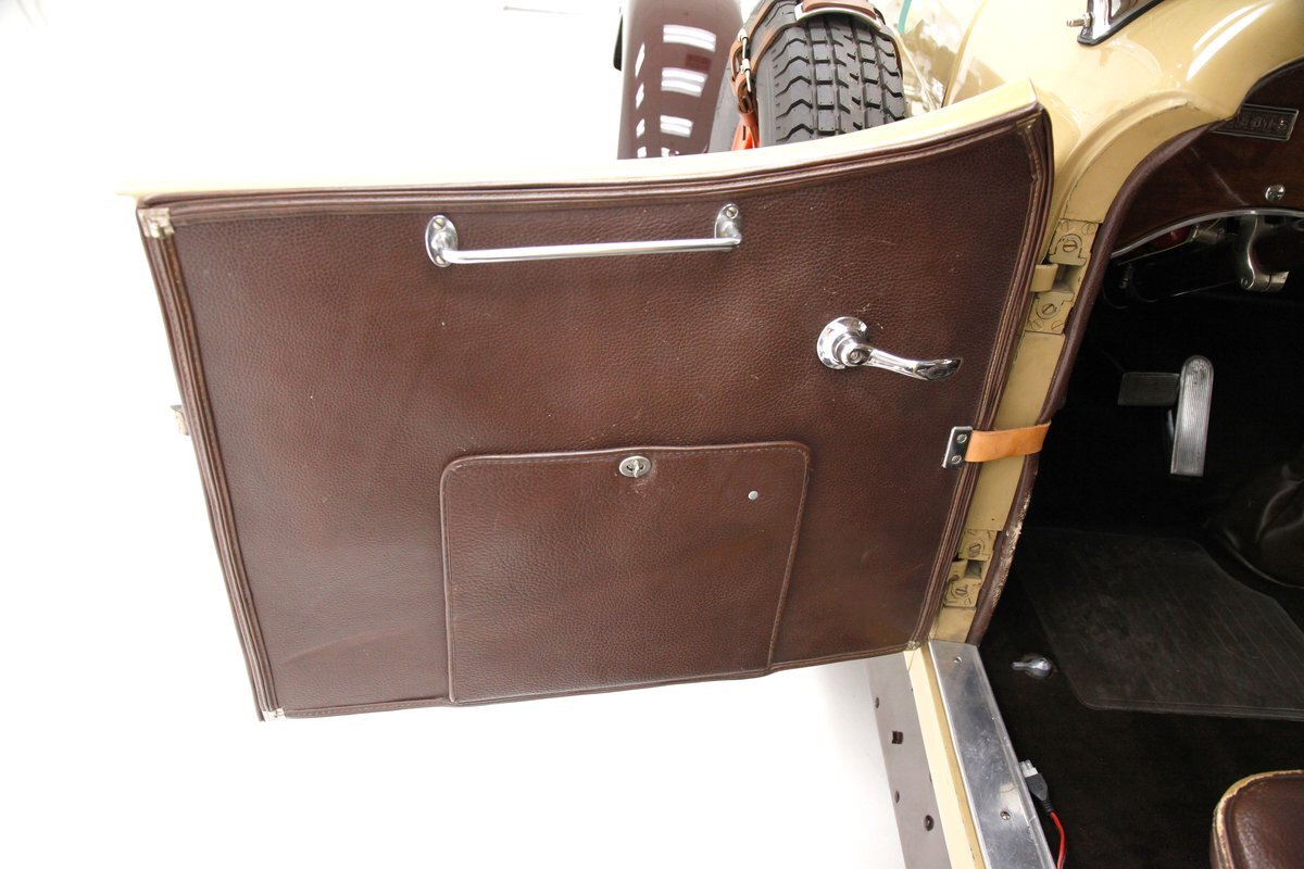 A swing of the low profile doors shows a brown leather stitched panel housing the door actuator lever and a pull bar. This car has no windows so there are no cranks. A small clasped storage area on the bottom of this panel is on, and offers some extra space. Inside an overstuffed smooth supple leather bench seat runs from door to door, and it has seat belts installed which are obviously aftermarket. A beautiful total wood steering wheel with a metal center hub fronts the restored true wood dash with a light coffee dash top. Within the instrument cluster in the center, which is brass with carved ivy leaves embossed within its confines, and an Art Deco Egyptian goddess profile if you look closely between the leaves. Round white faced gauges which have aged gracefully show nicely and are embedded onto this brass plate. Just below this squared off oval is a Stutz winged badge with the number 8 underneath the wings. Nice thick pile brown carpeting is covering the floors and within this brown field is a leather booted long shift lever and chromed handbrake. Looking upward we see a wood frame for the convertible top, with some metal hinges which help the top operate smoothly, although manually.