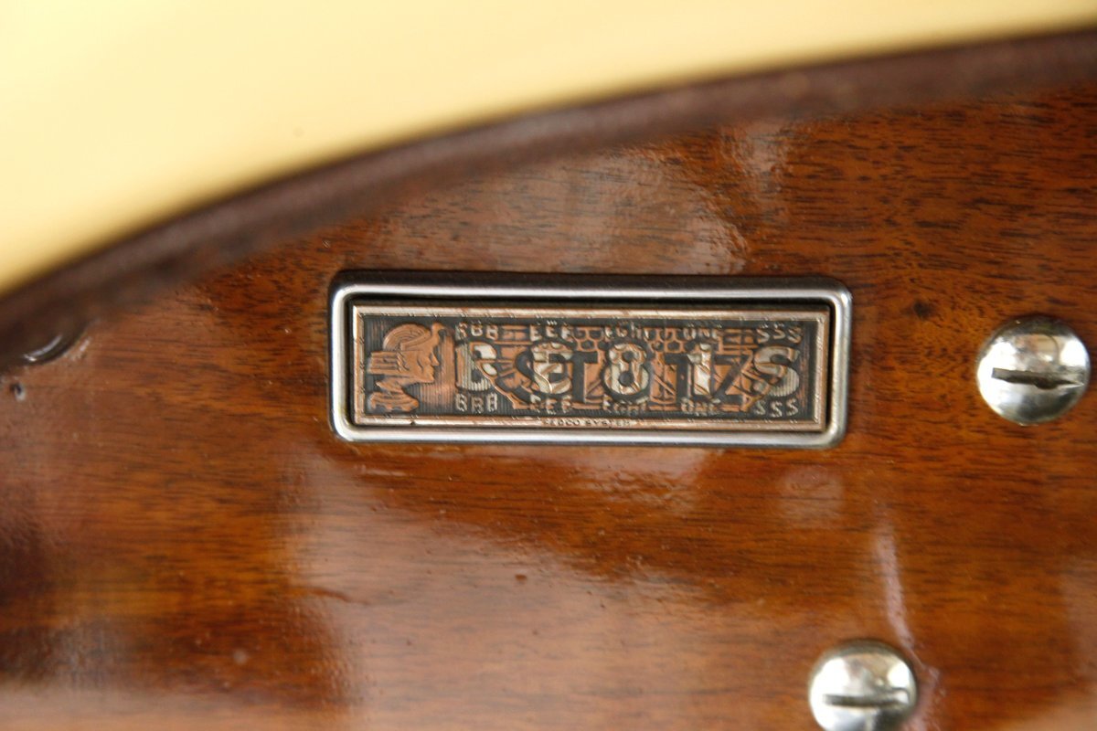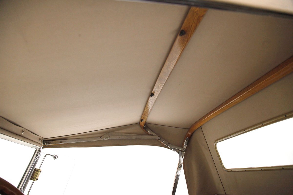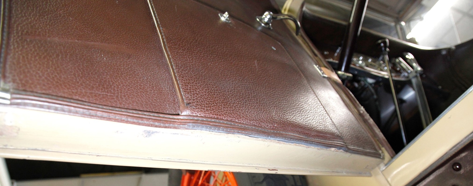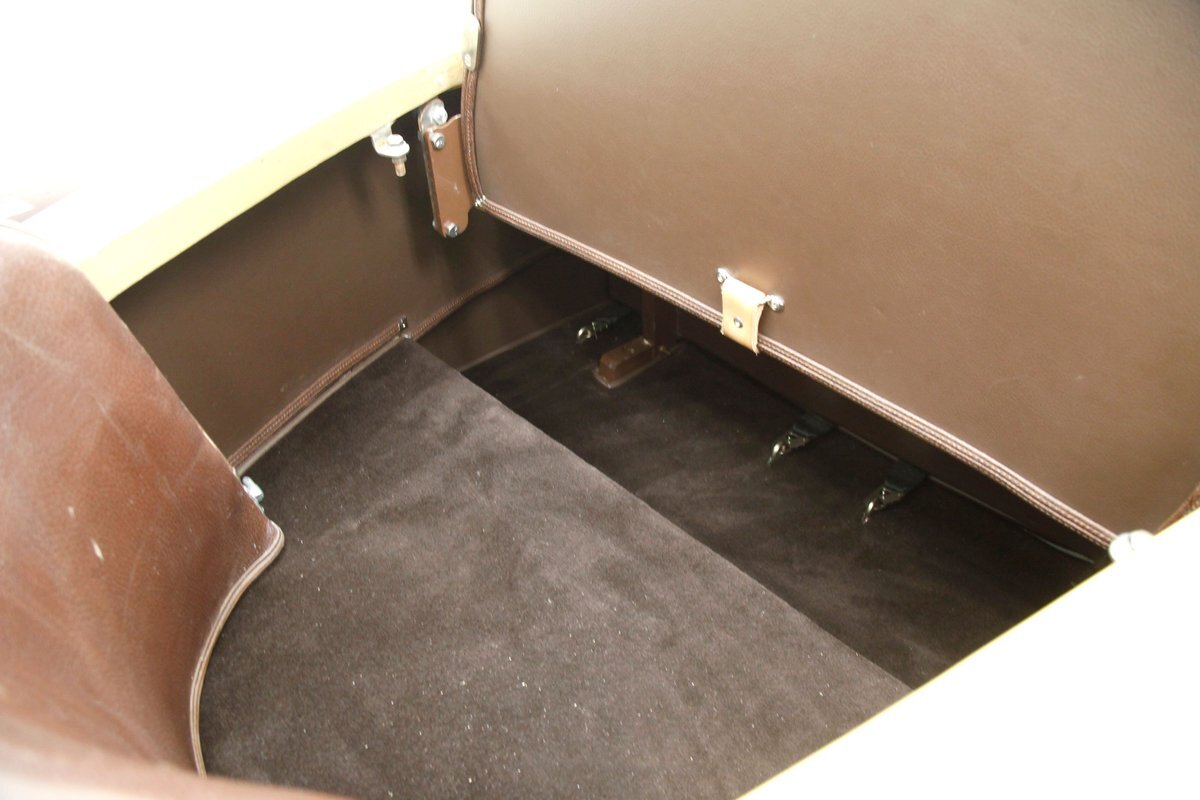 A swing of the low profile doors shows a brown leather stitched panel housing the door actuator lever and a pull bar. This car has no windows so there are no cranks. A small clasped storage area on the bottom of this panel is on, and offers some extra space. Inside an overstuffed smooth supple leather bench seat runs from door to door, and it has seat belts installed which are obviously aftermarket. A beautiful total wood steering wheel with a metal center hub fronts the restored true wood dash with a light coffee dash top. Within the instrument cluster in the center, which is brass with carved ivy leaves embossed within its confines, and an Art Deco Egyptian goddess profile if you look closely between the leaves. Round white faced gauges which have aged gracefully show nicely and are embedded onto this brass plate. Just below this squared off oval is a Stutz winged badge with the number 8 underneath the wings. Nice thick pile brown carpeting is covering the floors and within this brown field is a leather booted long shift lever and chromed handbrake. Looking upward we see a wood frame for the convertible top, with some metal hinges which help the top operate smoothly, although manually.